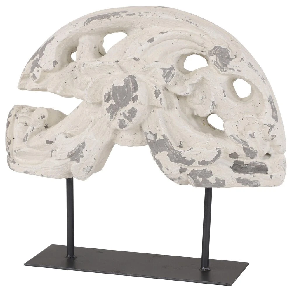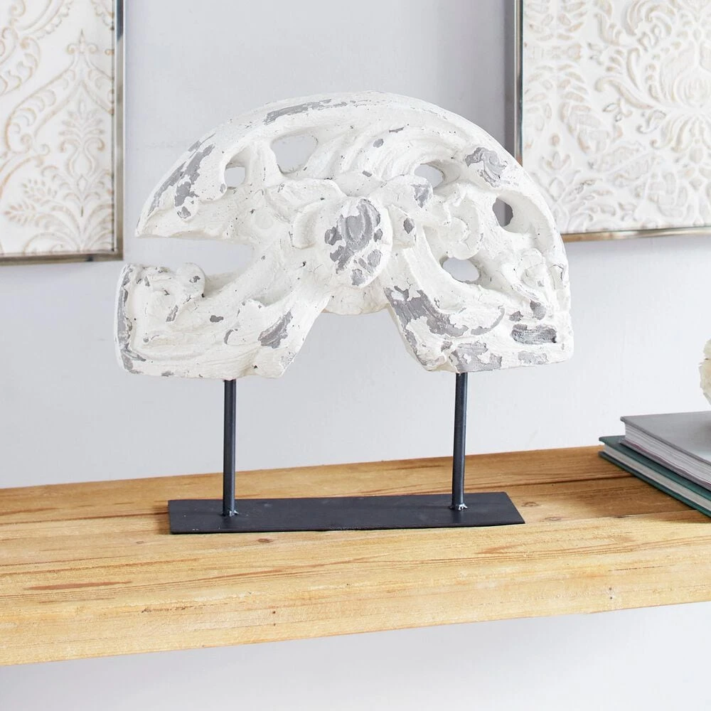 Bring antiquated style into your space with this large, distressed white acanthus sculpture on a metal stand. The block of decorative crown molding features rolling acanthus designs with a fruit and leaf centerpiece. The distressed white finish lets soft dove gray peek through, along with decorative chipping and speckling for a very vintage feel. The neutral hues of this textural white shelf decor work with any color palette while bringing antique texture and style to your table tops and shelves. Never go wrong with this vintage-themed decor displayed in your Scandinavian or country home space. Designed with rubber stoppers at the base that prevent scratching furniture and table tops, as well as sliding around. Wipe clean with a dry cloth. Suitable for indoor use only. Vintage inspired. This item comes shipped in one carton.