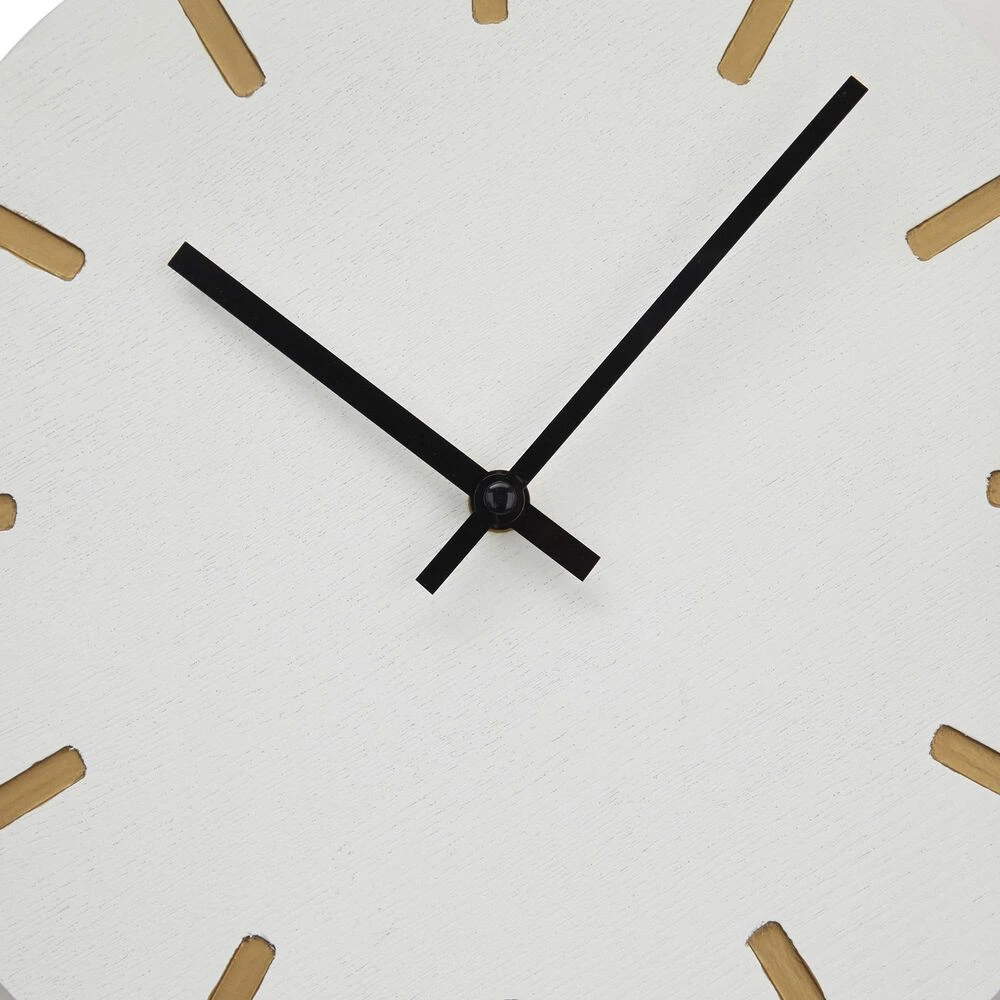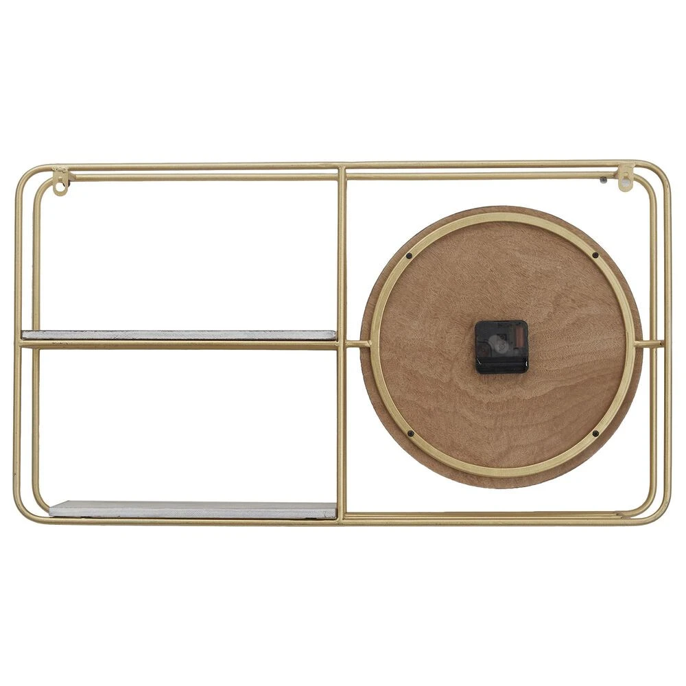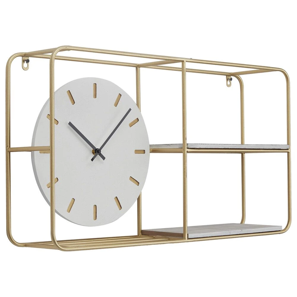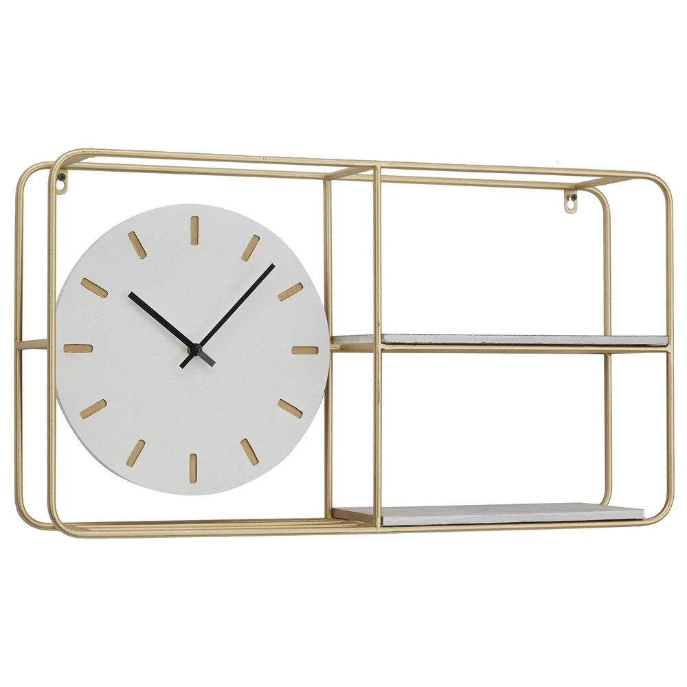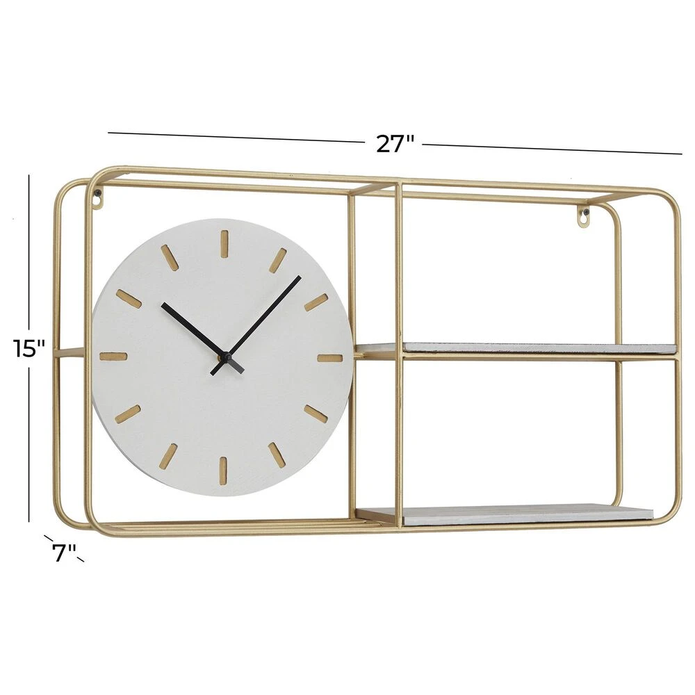 - Rectangular wall clock furnished with an open-designed gold metal frame, white and gold round clock with line markings serving as its numerals, and 2 white side rectangular wooden shelves