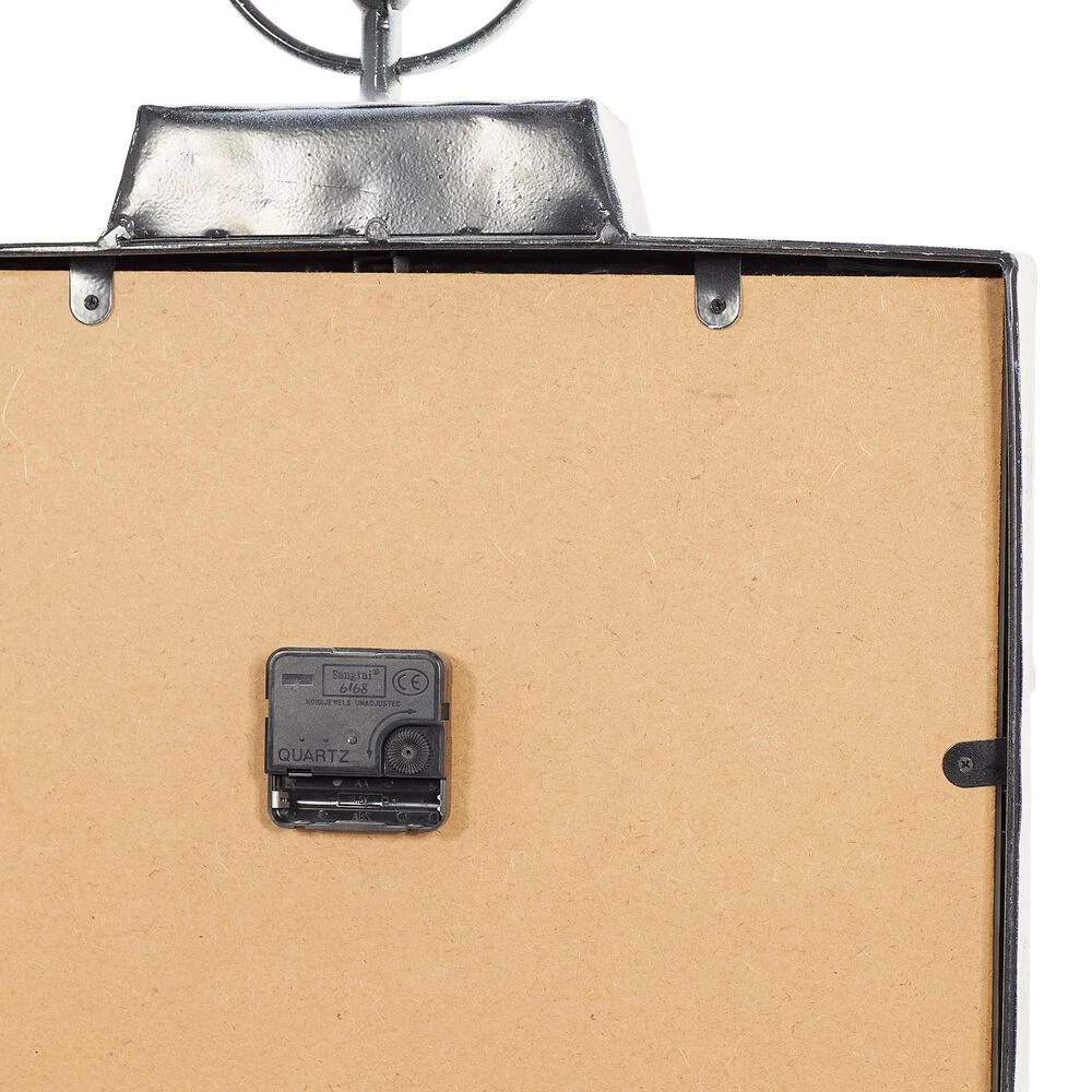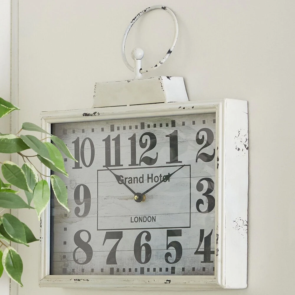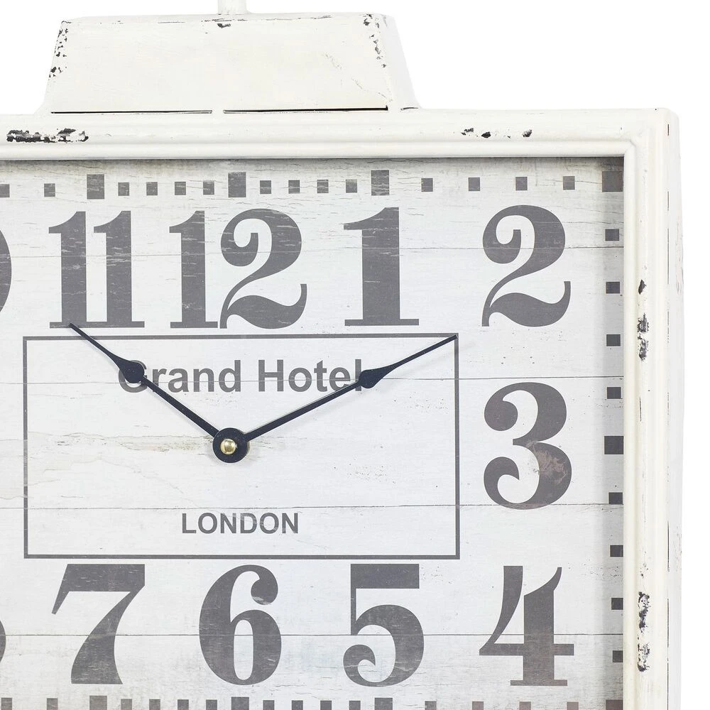 Use this large wall clock as a stylish timepiece in your entryway or dining room. Requires 1 AA battery. Battery not included. This item ships in 1 carton. Arabic numerals appear on the clock face. The clock mechanism runs silent. London-inspired wall clock with large and easy-to-read black numerals on background. Easy and ready to hang with round metal ring. Suitable for indoor use only. Vintage style. Grand hotel and London typography.