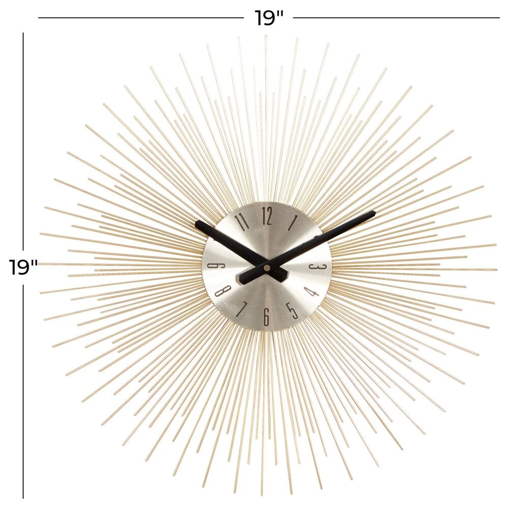 Features sunbursts of varying lengths coming from the clock face. Requires 1 AA battery. Battery not included. This item ships in 1 carton. Arabic numerals for the hour markers. The clock mechanism runs silent. Easily hanging using hanging hardware on the back. Suitable for indoor use only. Contemporary style.
