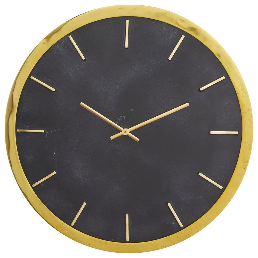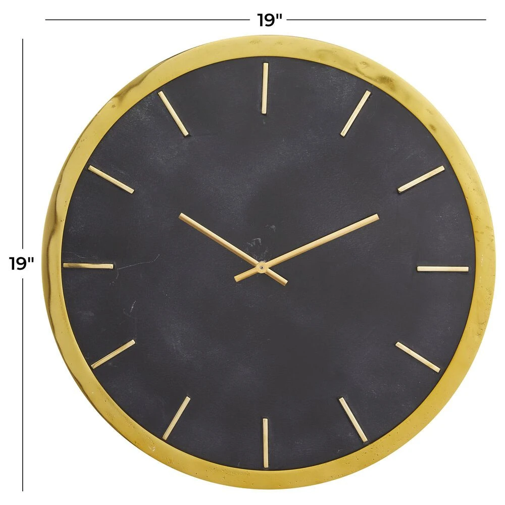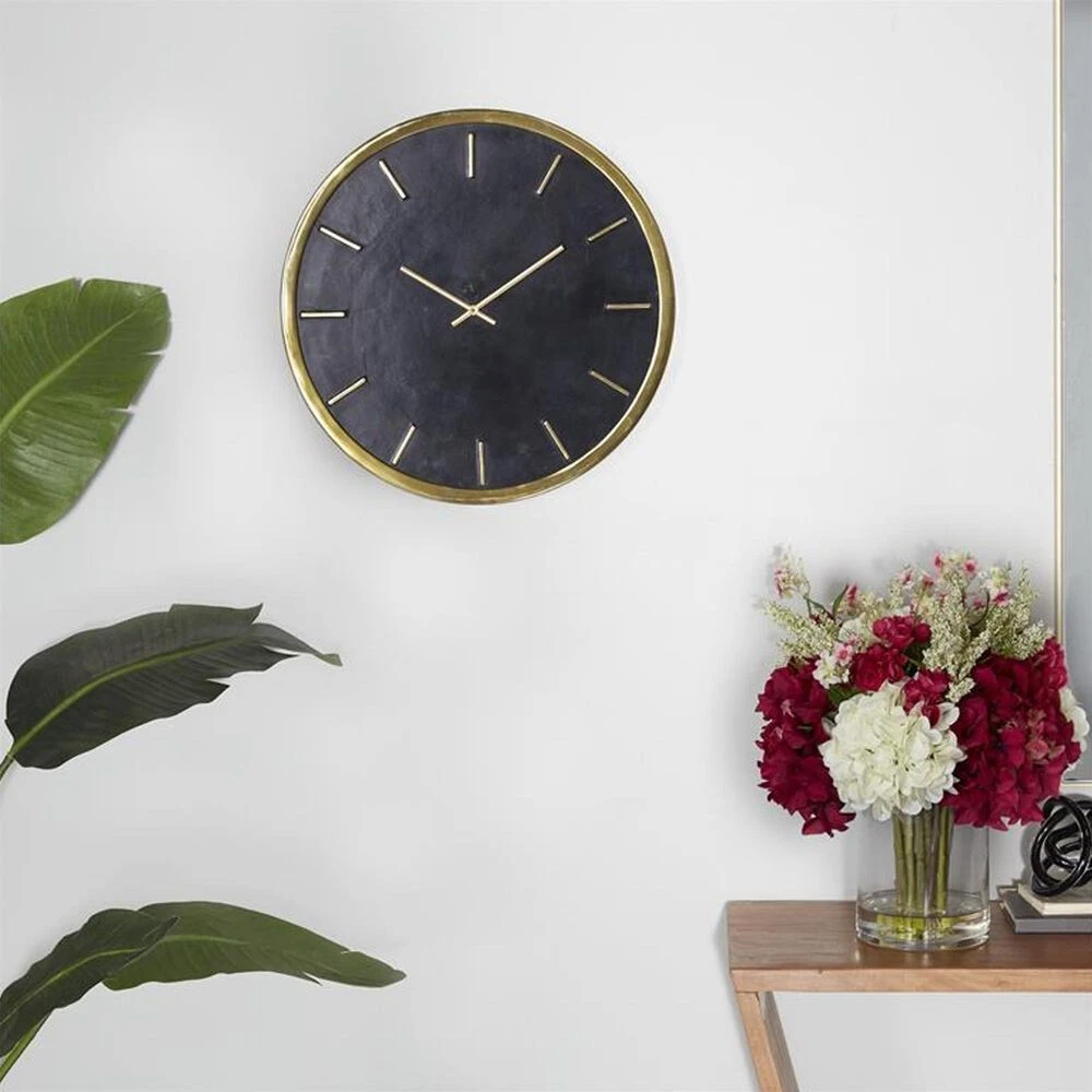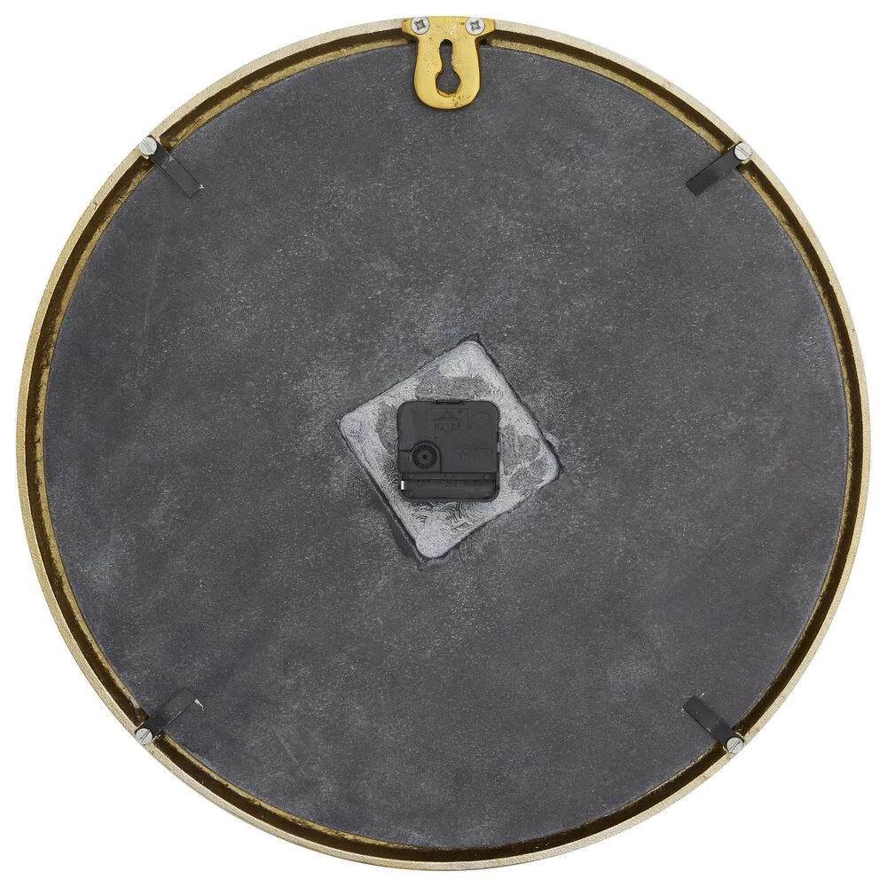 Keep track of time and embellish your home corners with this gold analog clock on your living room or bedroom walls. Requires 1 AA battery. Battery not included. This item ships in 1 carton. Features bars as hour and minute markers. The clock mechanism runs silent. Easy to hang with back keyhole hook; nails and screws are not included. Suitable for indoor use only. Marble is a product of nature and no two pieces are exactly alike. It is prone to variations in color and/or patterns in the material that add to the beauty and charm of the piece.. Glam style.