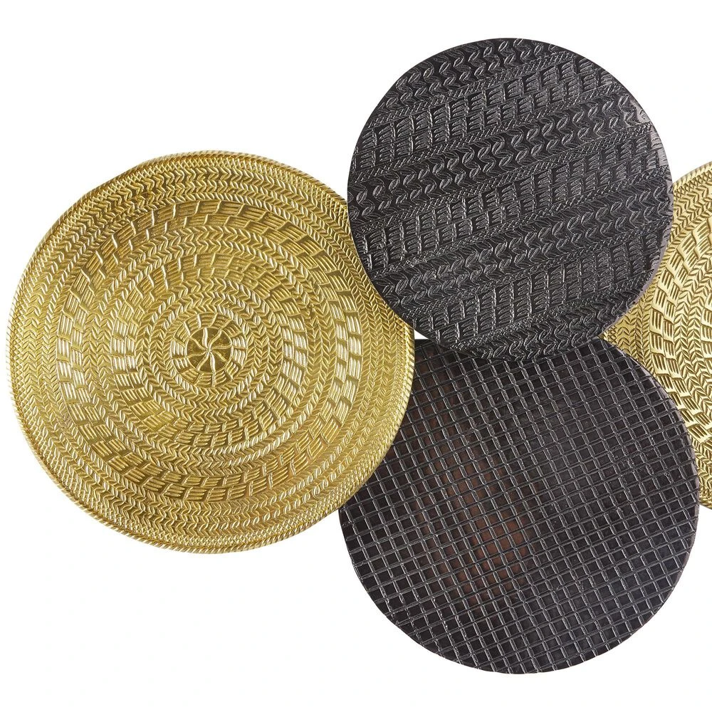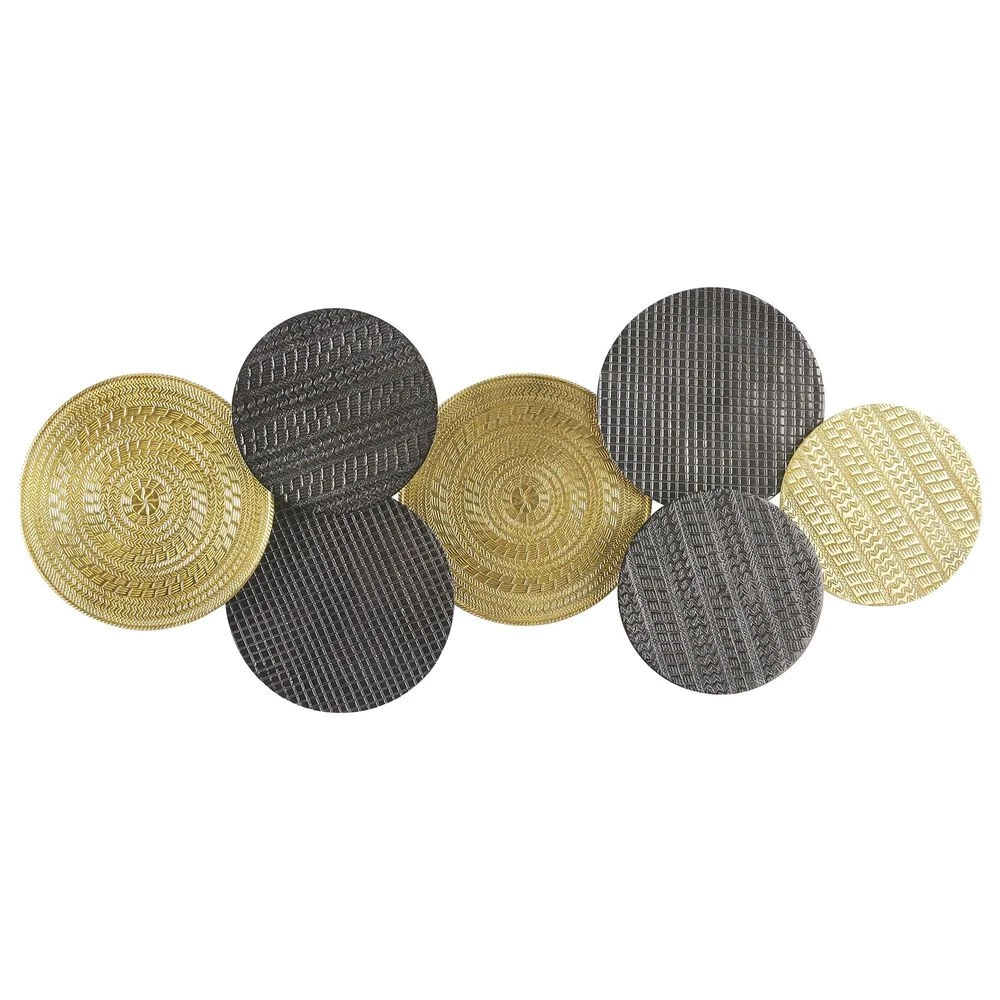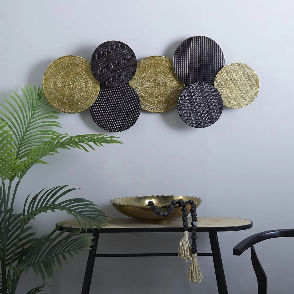 - Round disc wall decor showcases colors of black and gold in a polished shine finish