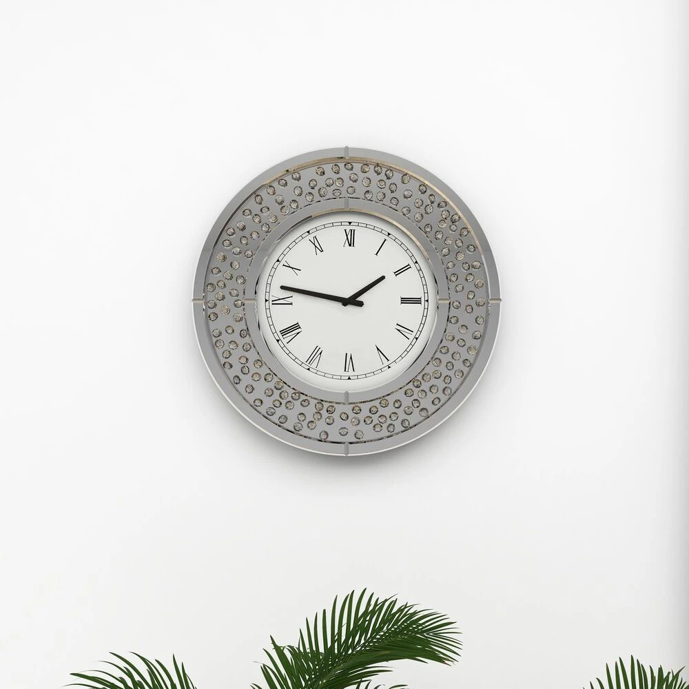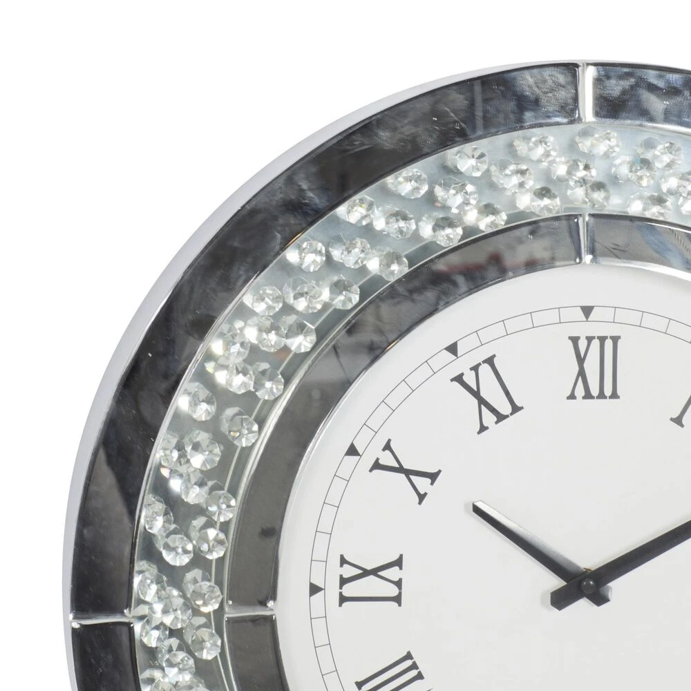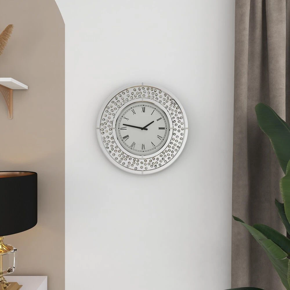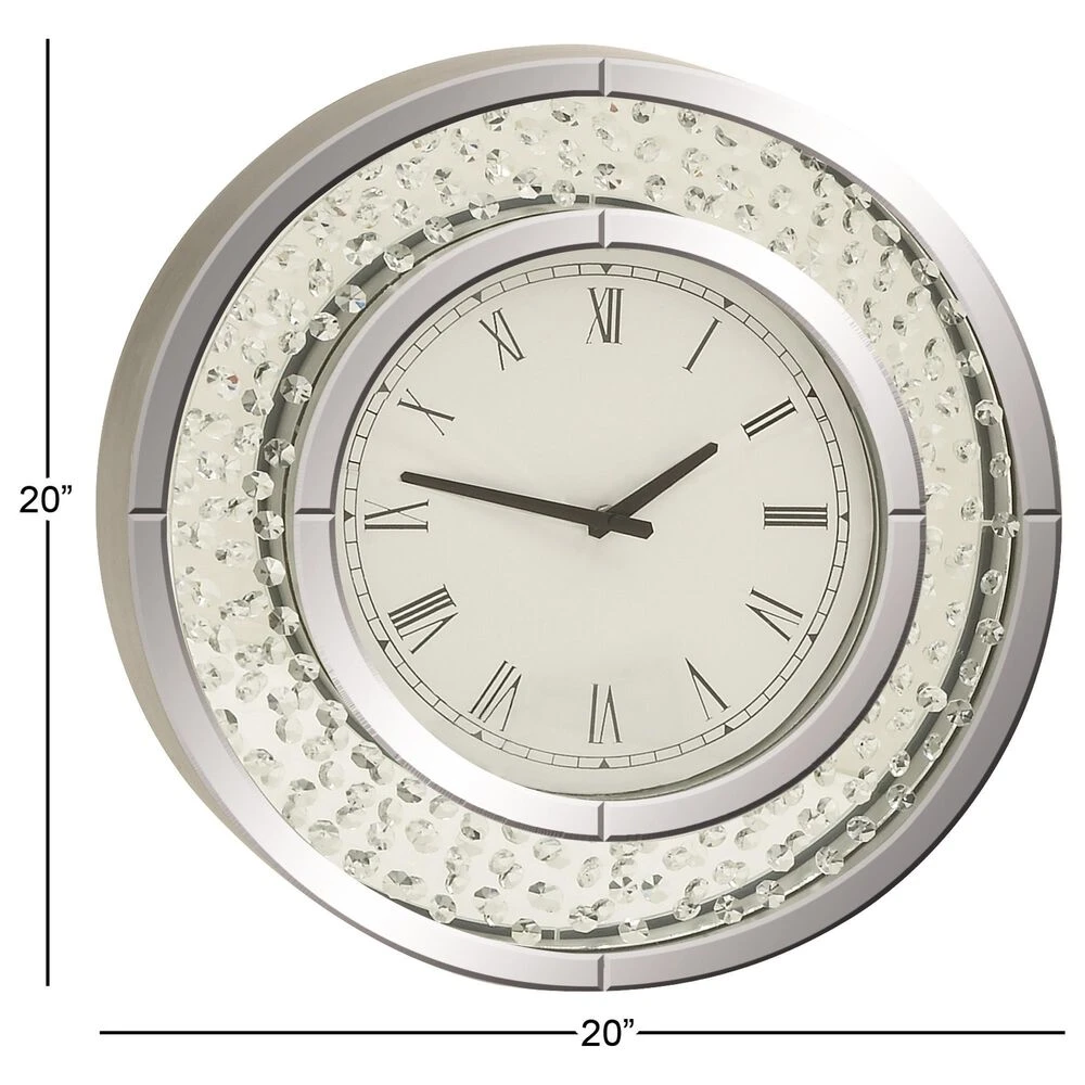 This stunning wall clock is ideal for modern, art deco, and glam-themed living spaces. Requires 1 AA battery. Battery not included. This item ships in 1 carton. Features Roman numerals for the hour and minute markers. The clock mechanism runs silent. 2 D ring hooks on the upper sides allow for easy hanging via a nail or screw. Suitable for indoor use only. Glam style.