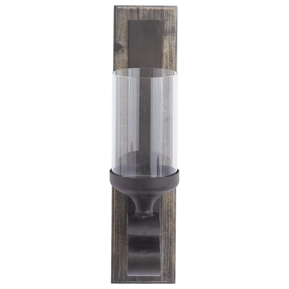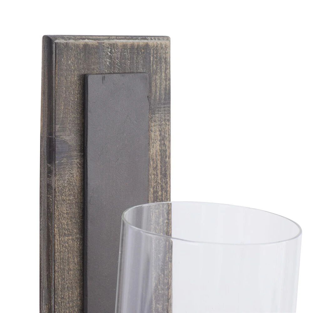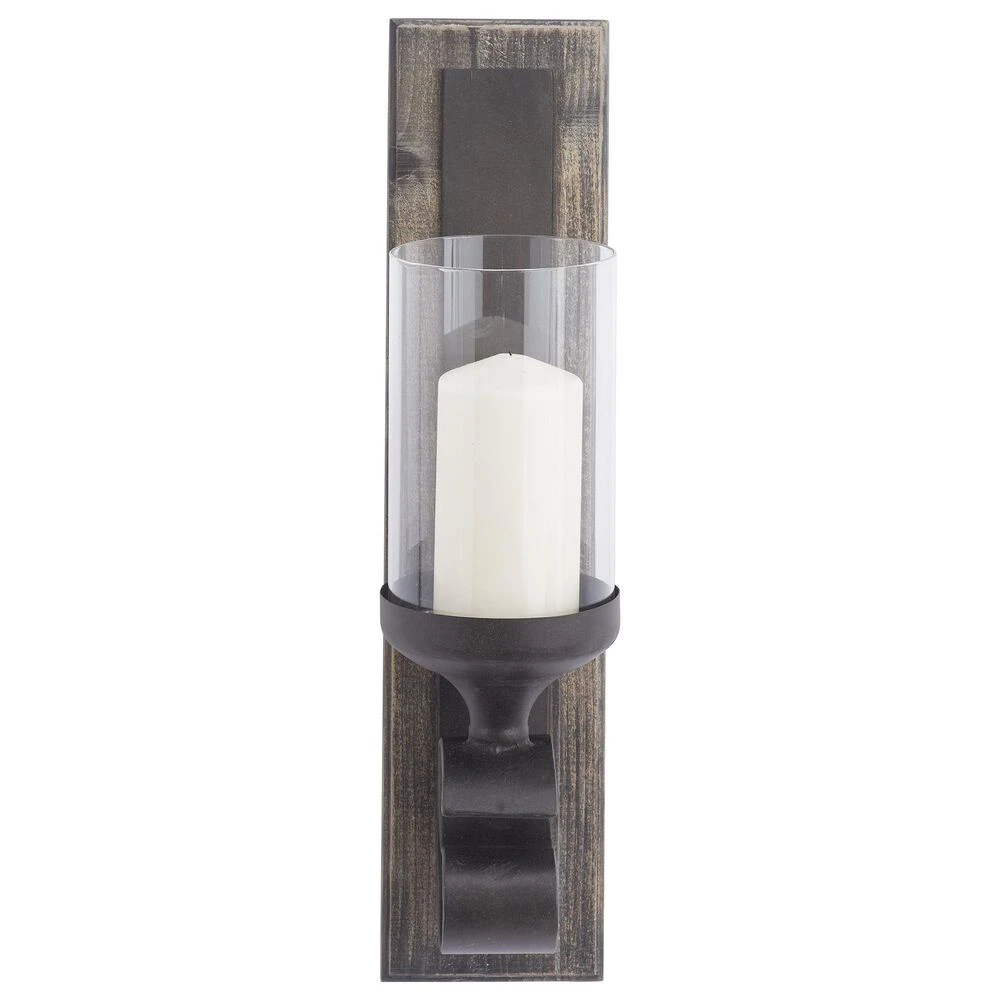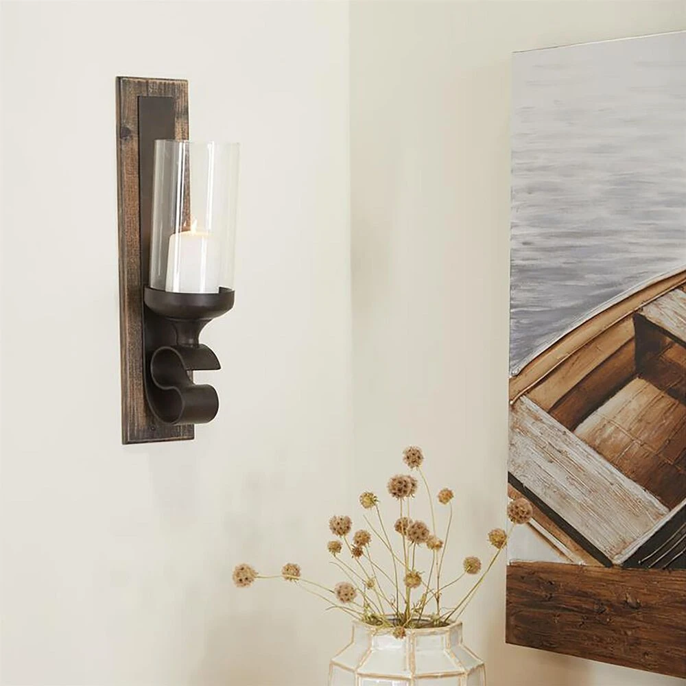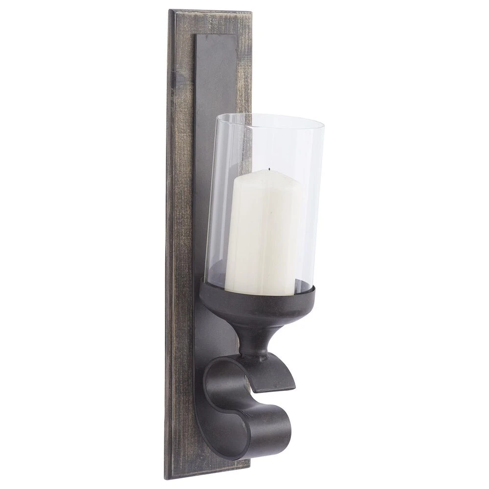 - This candle wall sconce features a dark brown rectangular wooden plaque, round metal candle plate, and transparent cylindrical glass