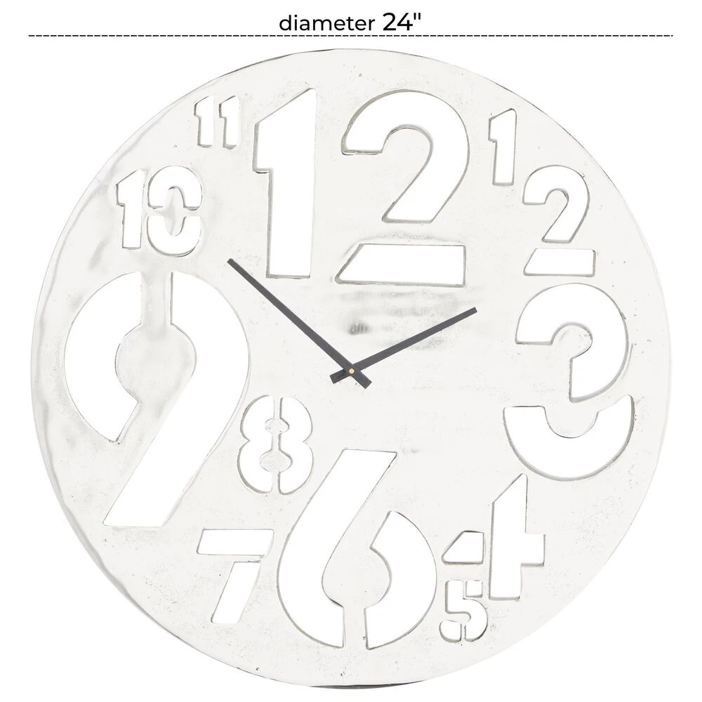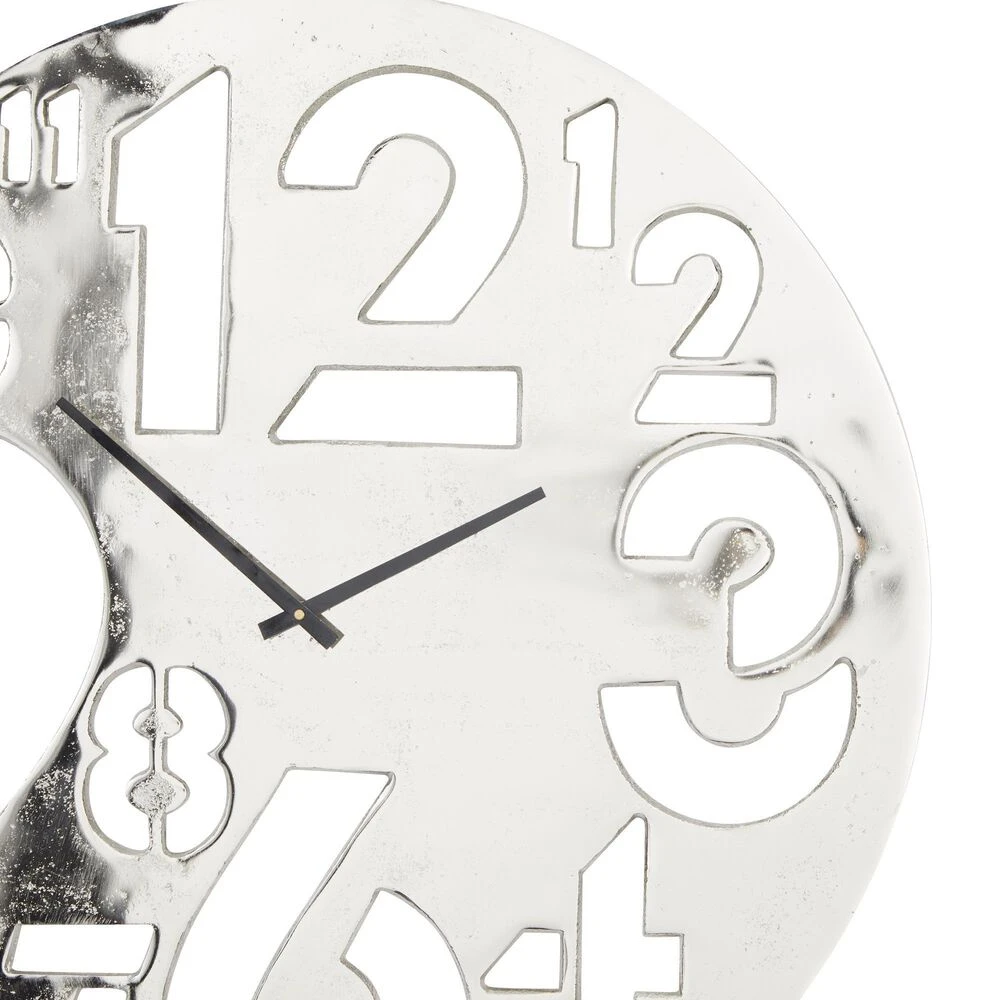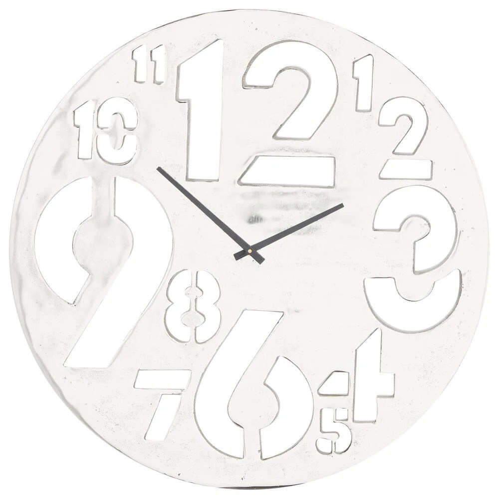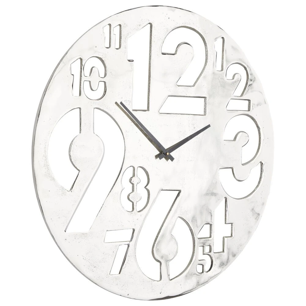 - This aluminum wall clock features a slim silver round frame with slender black clock hands and cut-out Arabic numerals in varying sizes and formations