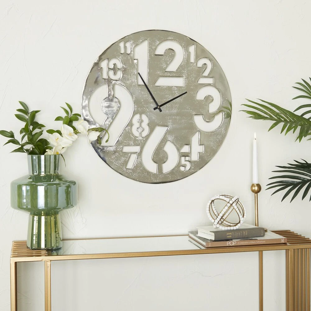 Like a functional art piece for your wall, this round wall clock will become a focal point or finishing touch for any room in your contemporary-themed home with its elegant glossy silver finish. Requires 1 AA battery. Battery not included. This item ships in 1 carton. The clock face of this wall clock flaunts a shiny silver surface with cut-out numerals and simple black clock hands. The clock mechanism runs silent. Item comes with metal hardware at the back for easy and secure hang. Suitable for indoor use only. Made in India. Contemporary style.