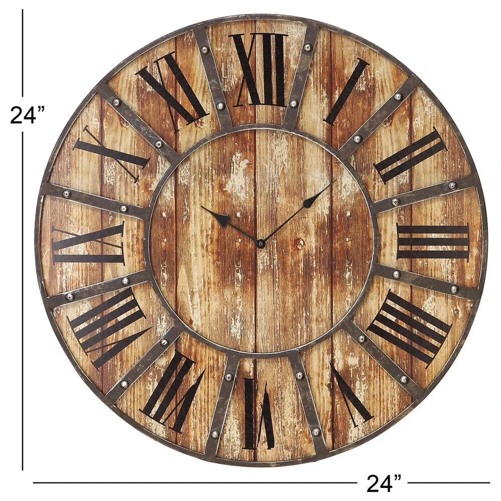This will look exceptional when displayed on walls in your farmhouse style inspired living room. Requires 1 AA battery. Battery not included. This item ships in 1 carton. Features black roman numerals and black clock hands on a distressed brown wood background. The clock mechanism runs silent. Includes hanging hardware for easy hanging. Suitable for indoor use only. Farmhouse style.