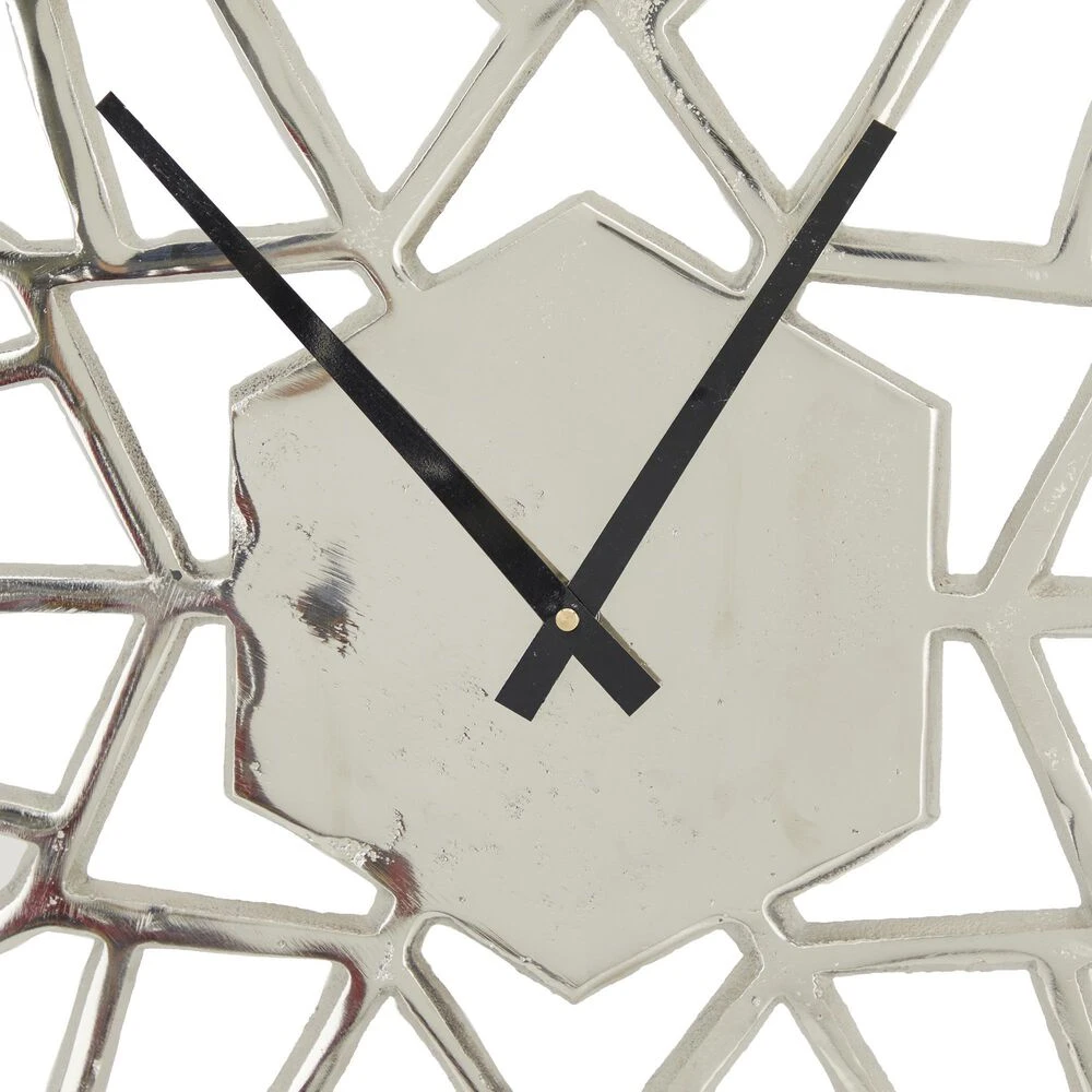 - An aluminum wall clock featuring a round clock face with cut-out geometric pattern and black minimalist clock hands