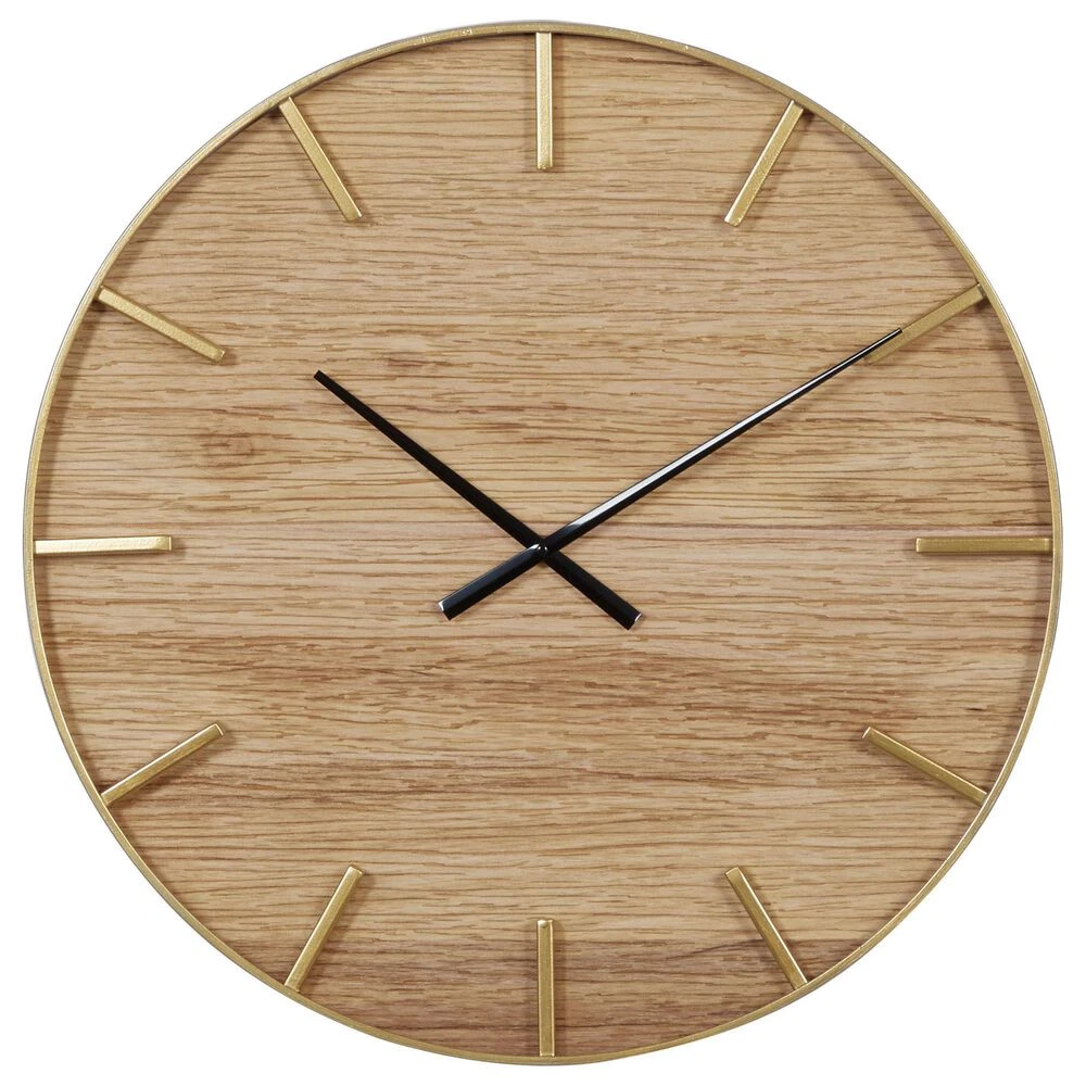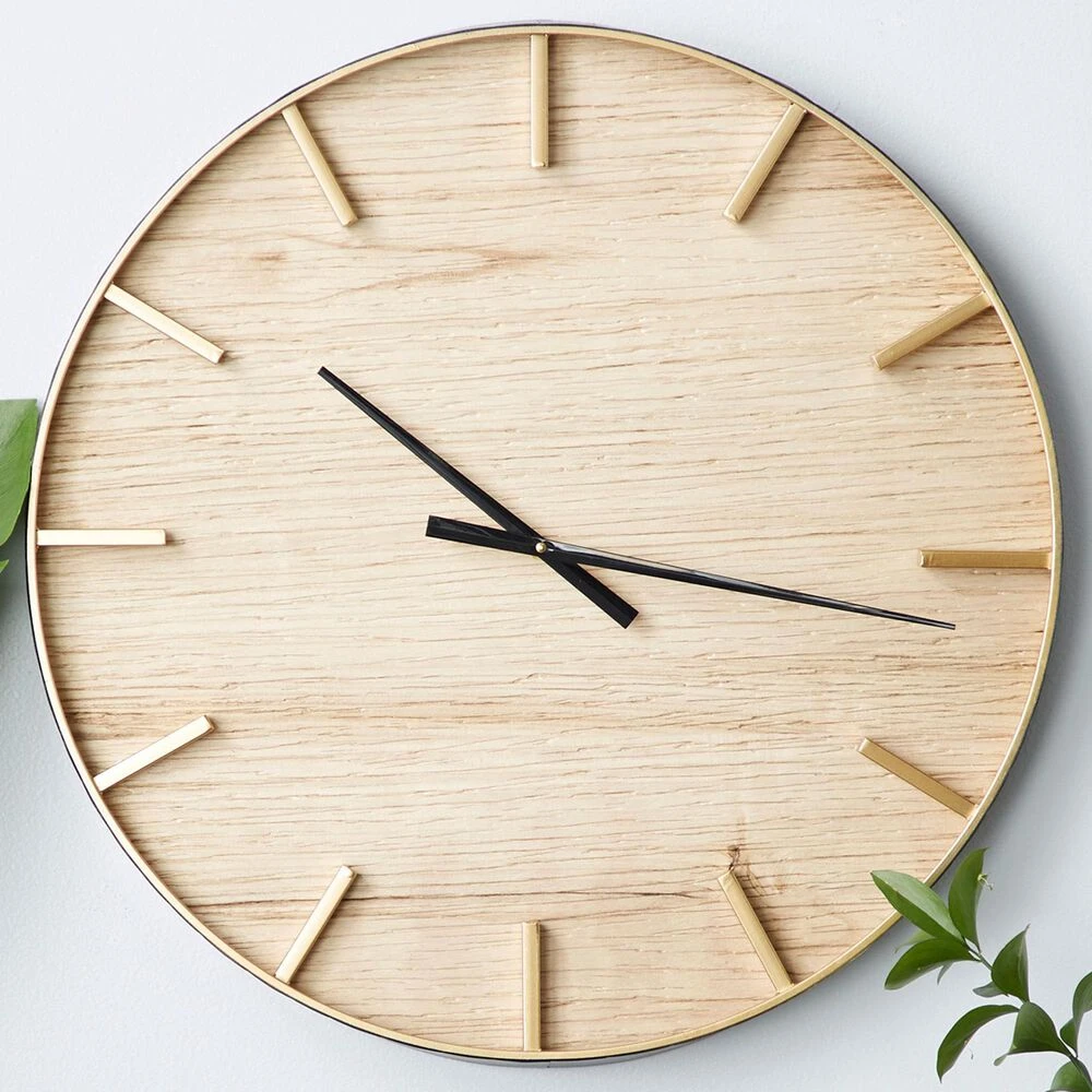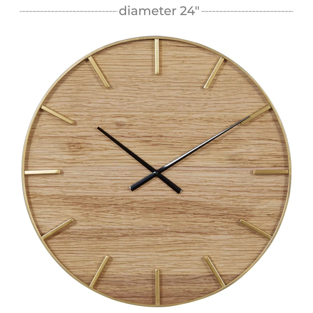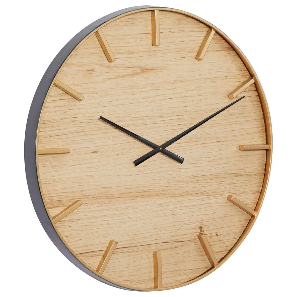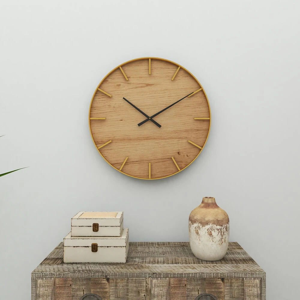 - This wood wall clock features a natural brown face with a gold frame and black hands
