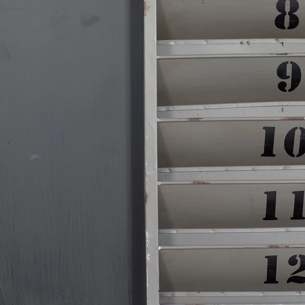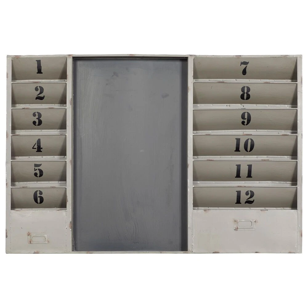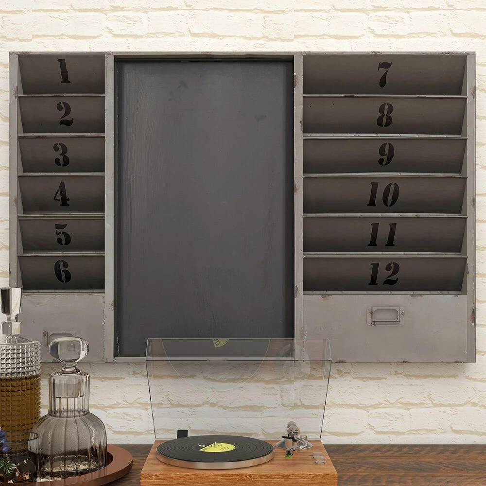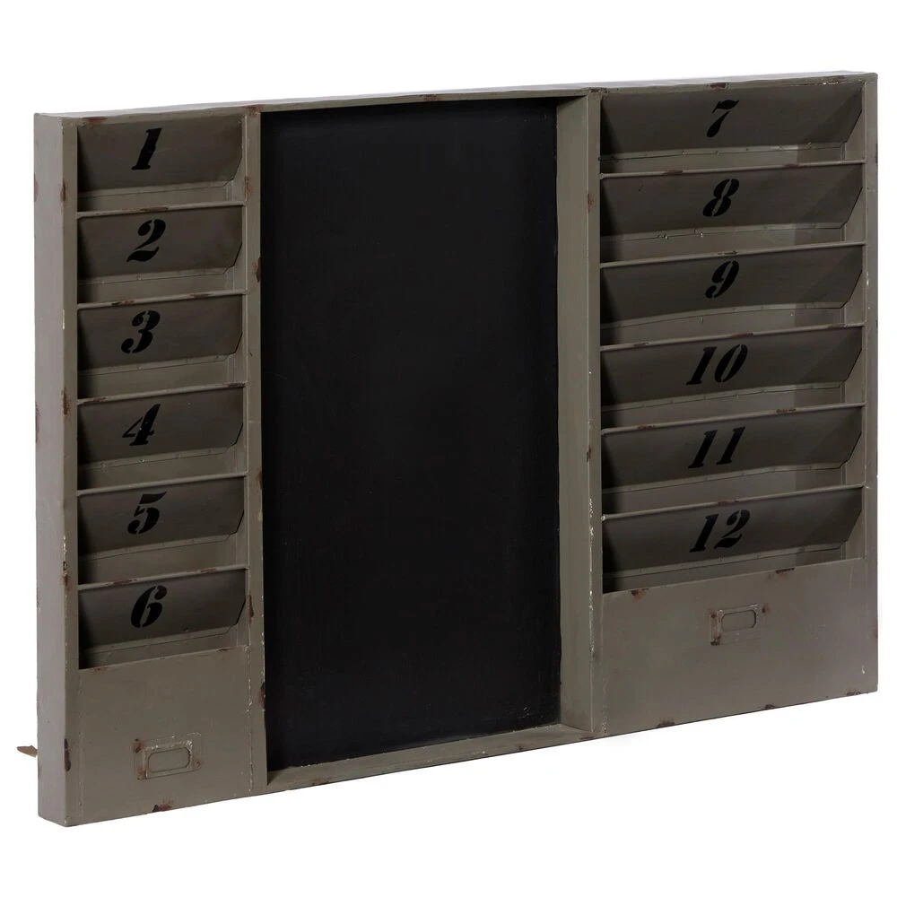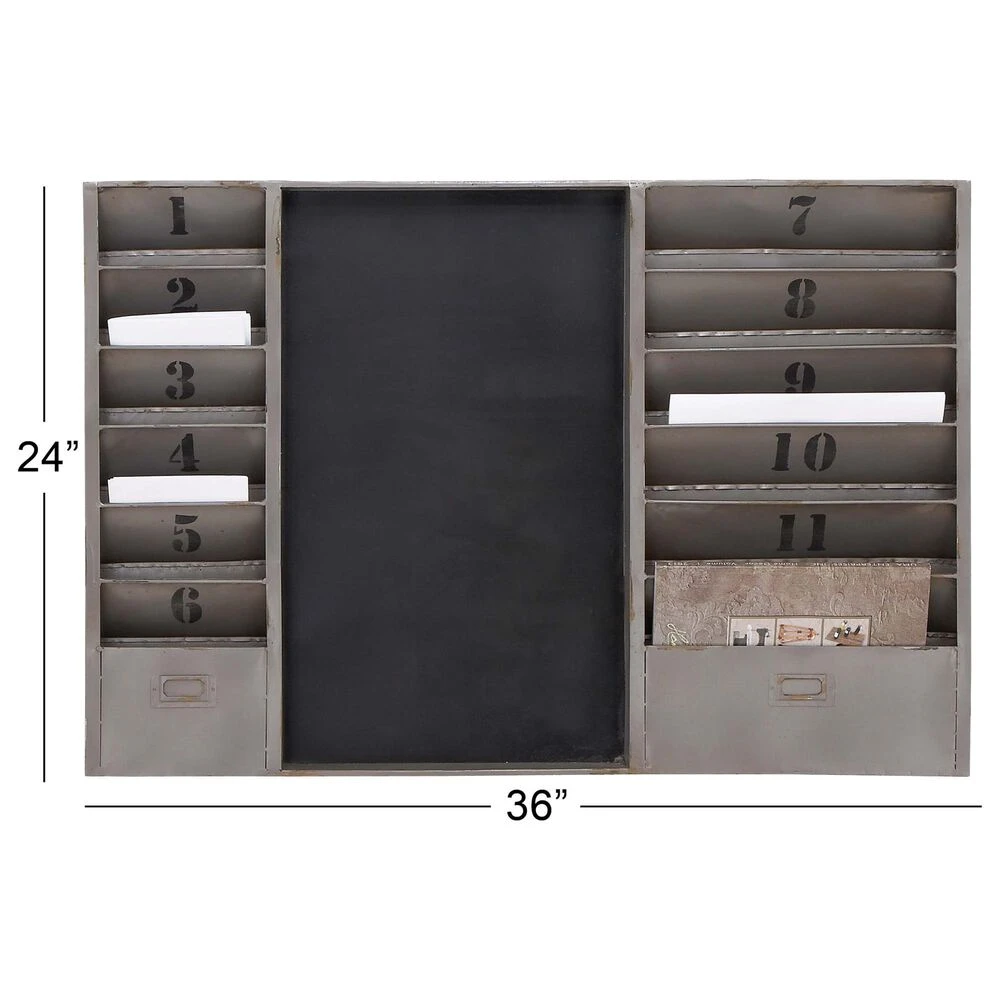 You dont need to take a day off to decorate and make your walls look great. Make your home exceptional in an hour with this metal memo board. This home decor features a rectangular blackboard between numbered rows of letter storage slots. It flaunts a distressed gray finish, and is ideal for compiling files of different paper sizes. This multipurpose wall decor suits industrial designed spaces that crave for stylish home decoration. Hang this amazing piece in your home to bring a relaxing and feel-good atmosphere. Item features metal hook for easy and secure hang. Suitable for indoor use only. This wall decor showcases numbers labeled from 1-12. This item comes shipped in one carton.