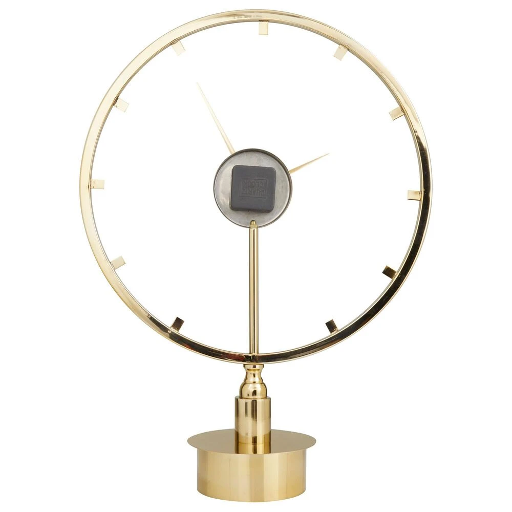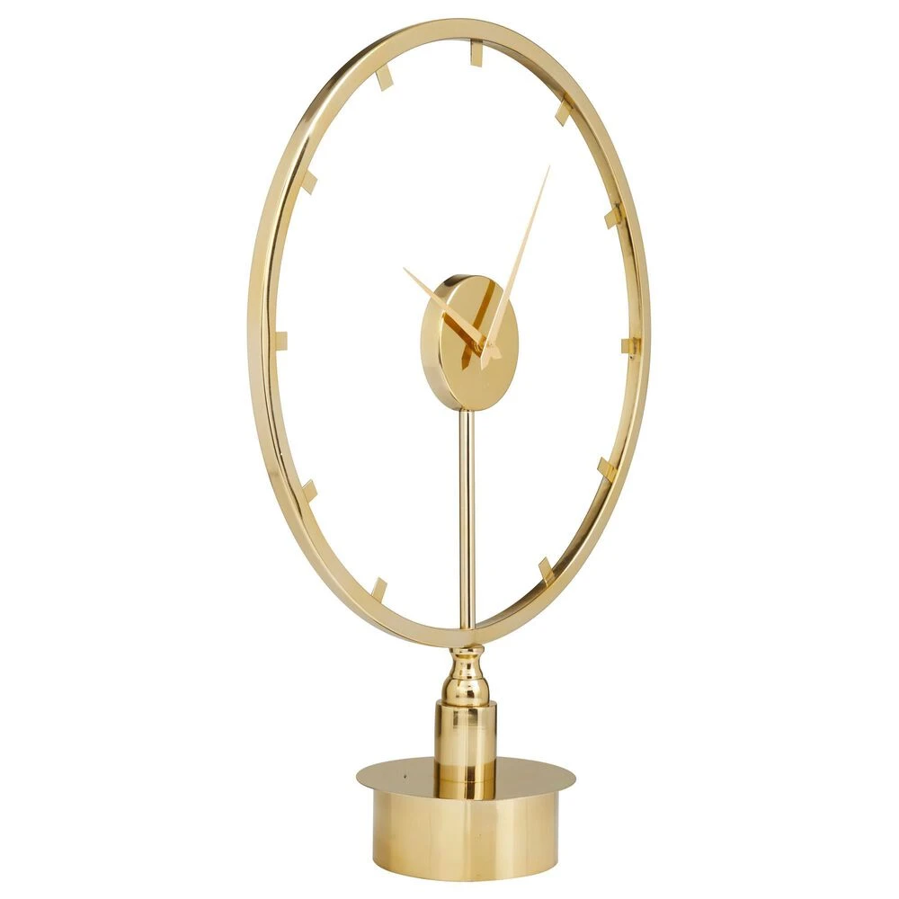 - An elevated pedestal platform boasts this gold table clock with a sleek and minimalist style