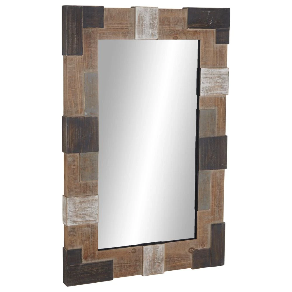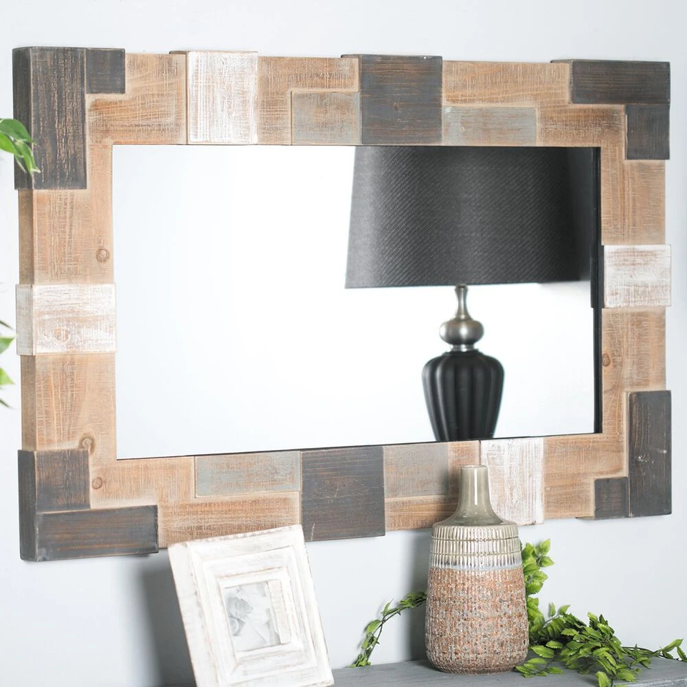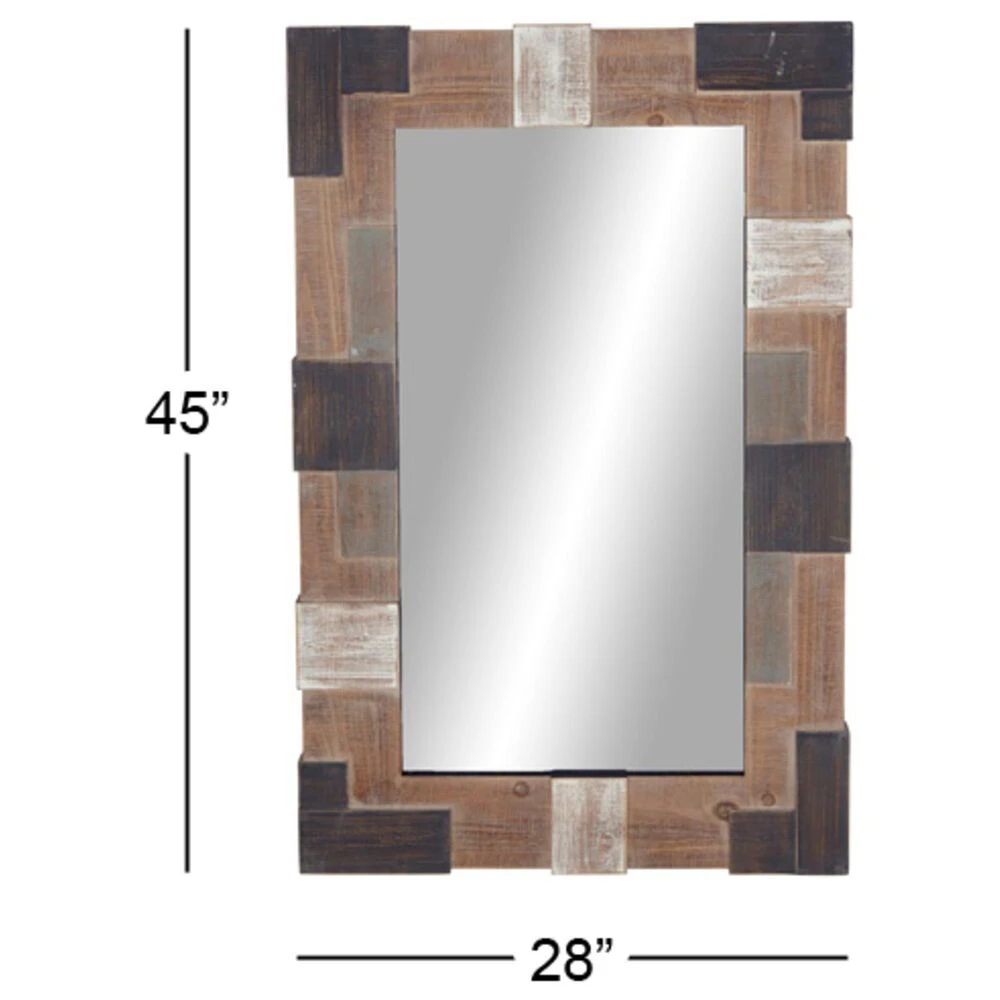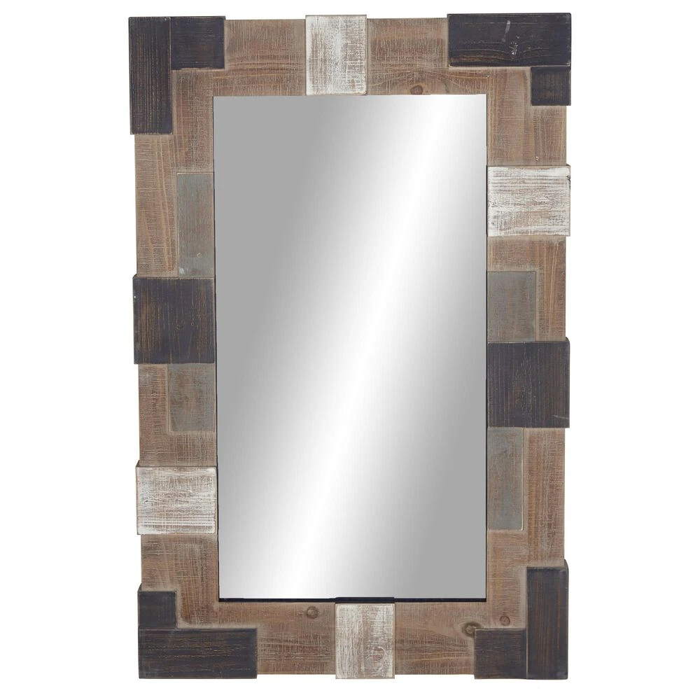 Add some style to your entryway, lobby, living room, or bedroom with this striking wooden wall mirror. This accent piece features a clear reflective glass mirror with brown rectangular frame designed with white and dark brown square strips. With its impressive look, this stunning mirror suits any home with a farmhouse interior design. Apart from decorating your home, the purpose of this mirror is to bounce back outdoor light to a small room to make it look bigger. Pair this decorative wall mirror with house plants or other wall decor accent pieces to blend everything together perfectly. Suitable for indoor use only. This item comes shipped in one carton. Includes hanging hardware for easy hanging.