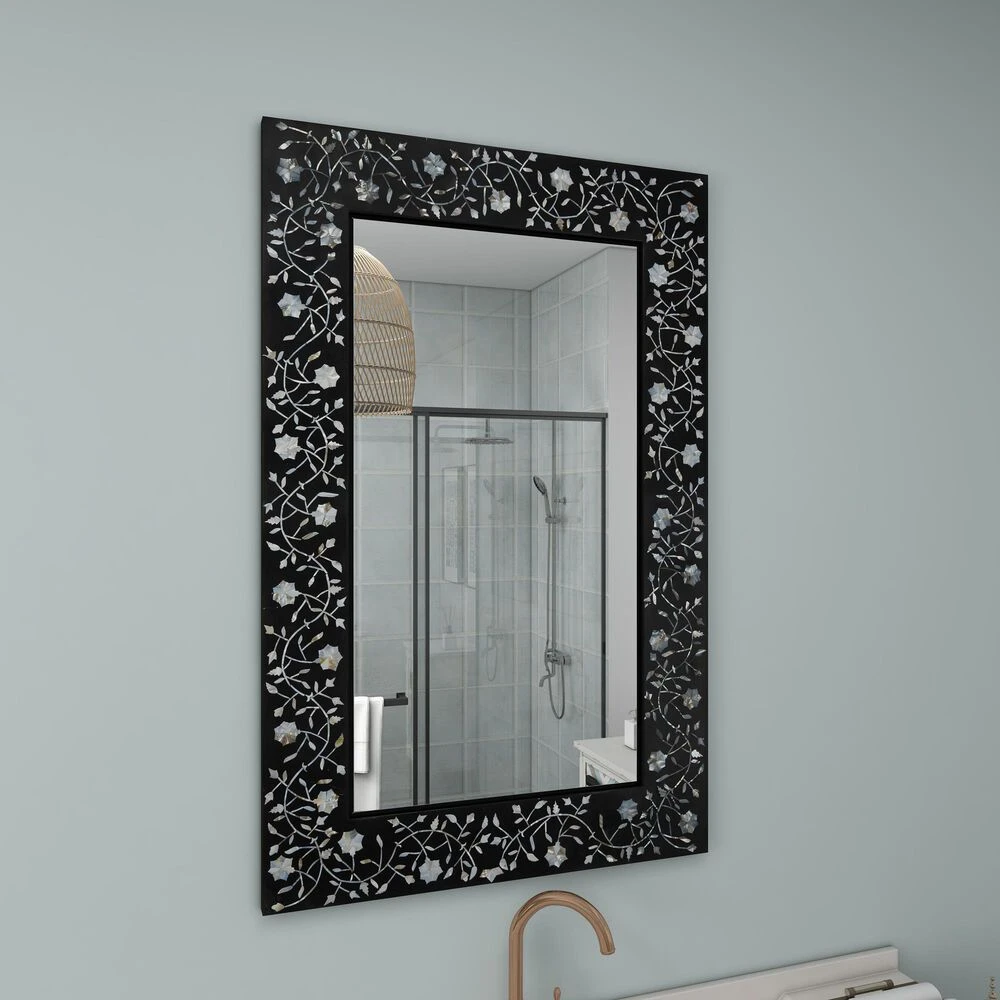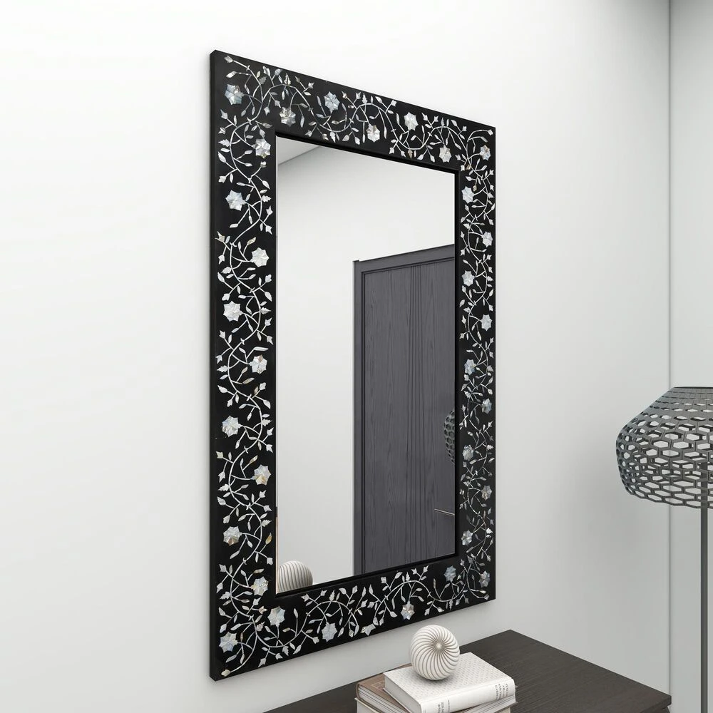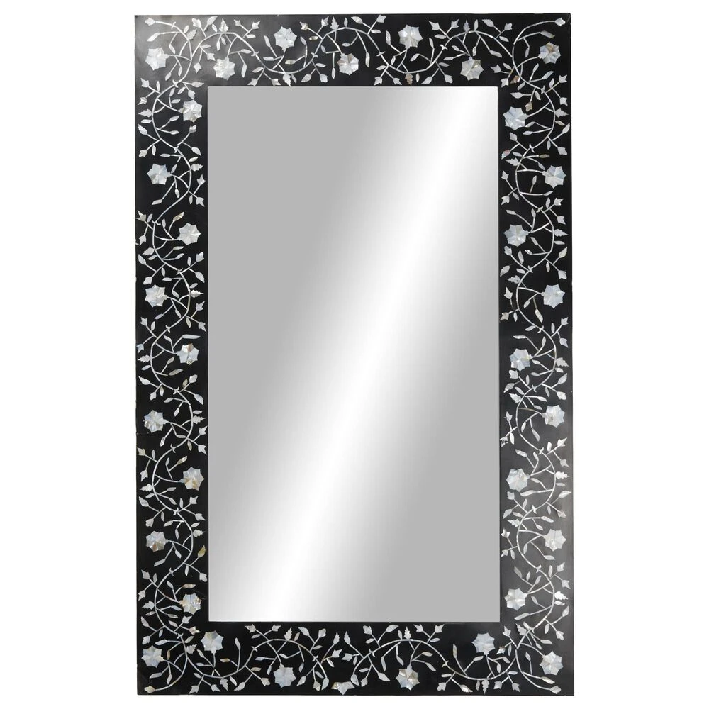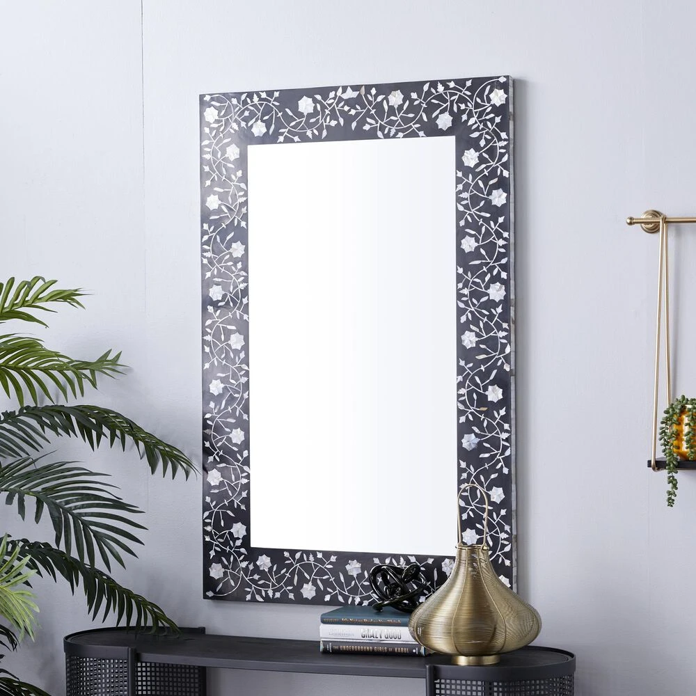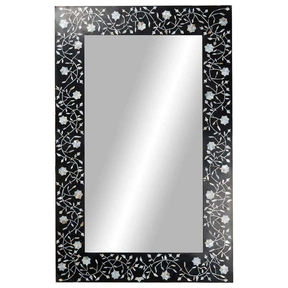 - This rectangle shell wall mirror carries a solid black frame inlaid with iridescent white oyster shells forming vines and flowers