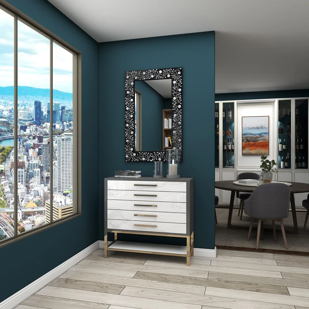 - Large decorative mirror measures 30″L x 1″W x 47″H and weighs 27 lbs.