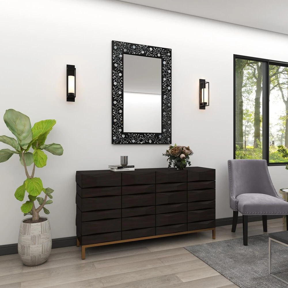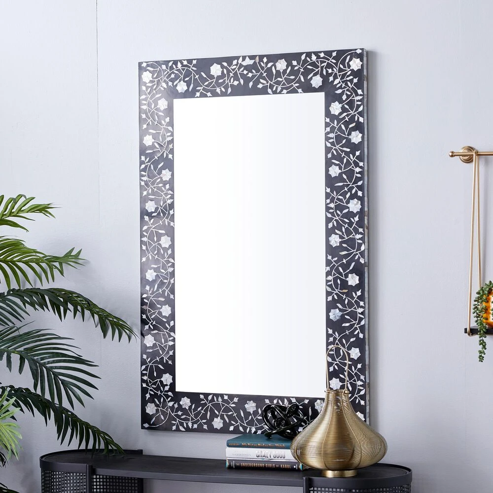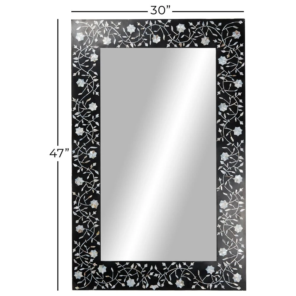 The eye-catching craftsmanship of this large wall mirror is stunning both up close and far way. The reflective, opalescent natural oyster shells are meticulously carved into flower patterns, reminiscent of classic Japanese style. Contrasting the solid black wood mirror frame, these delicate and artistic floral accents bring a versatile style into your space with this statement mirror, from boho to contemporary, and even coastal for shell lovers! Easy and ready to hang, this gorgeous mirror will be the centerpiece in any room. This item hangs vertically via D-ring hardware. Suitable for indoor use only. This item comes shipped in one carton. Made in India.