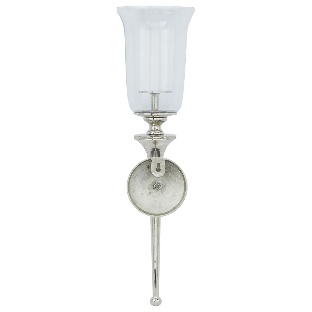- This candle wall sconce features a silver round aluminum plaque, round candle plate with extended rod, and transparent bell-shaped glass