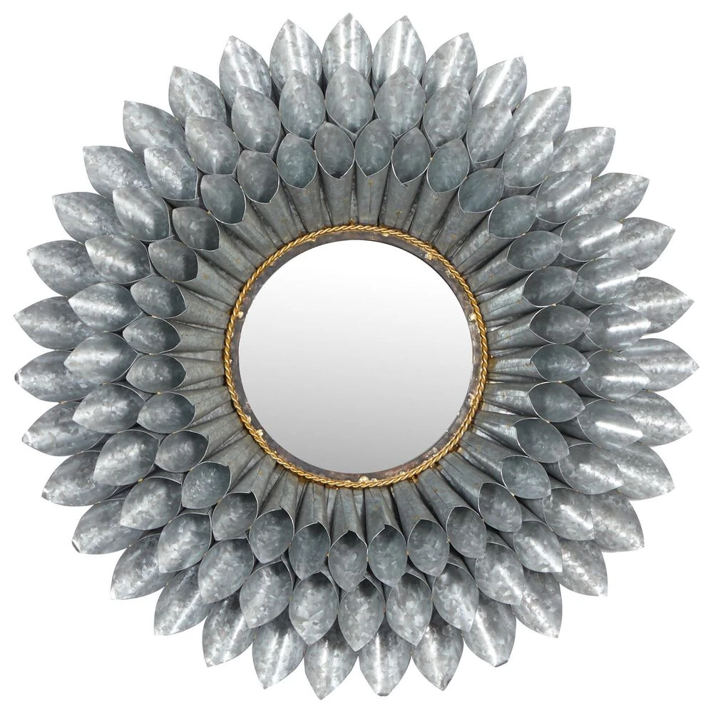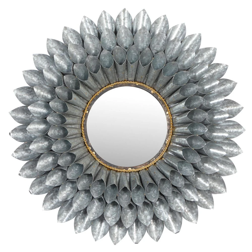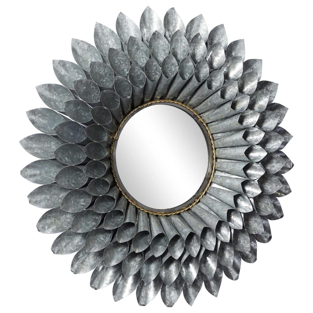 - This contemporary style inspired wall mirror features a round glass at the center framed by coned iron sheets in three layers forming a flower design