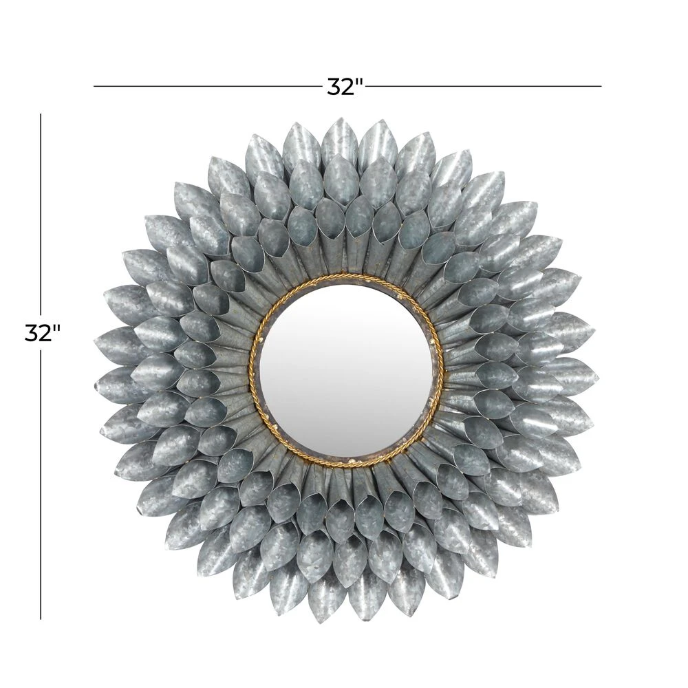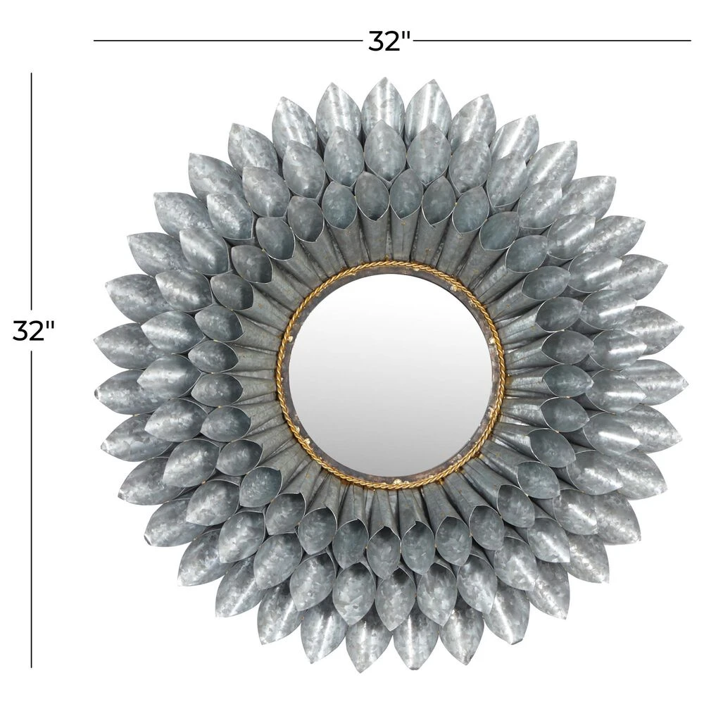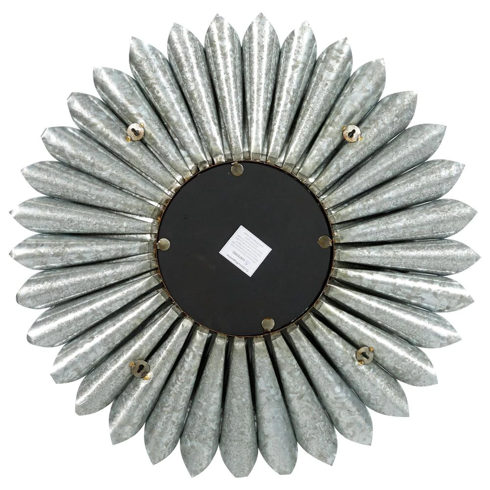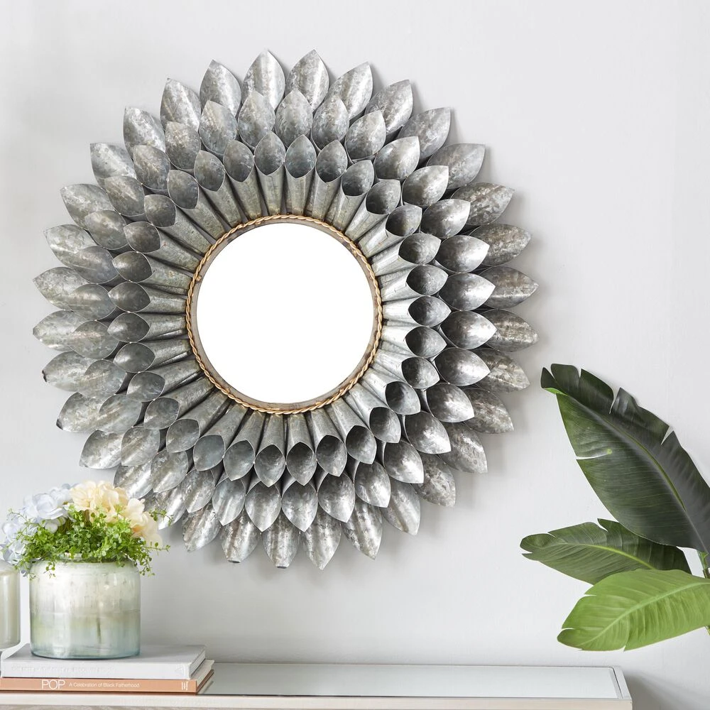 - This contemporary style inspired wall mirror features a round glass at the center framed by coned iron sheets in three layers forming a flower design