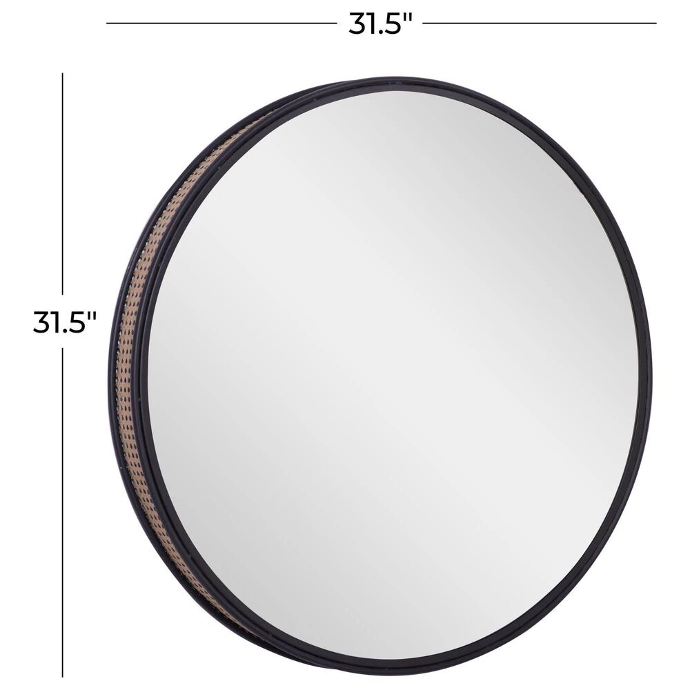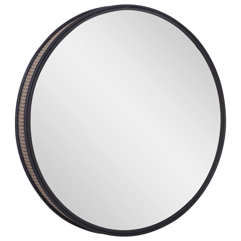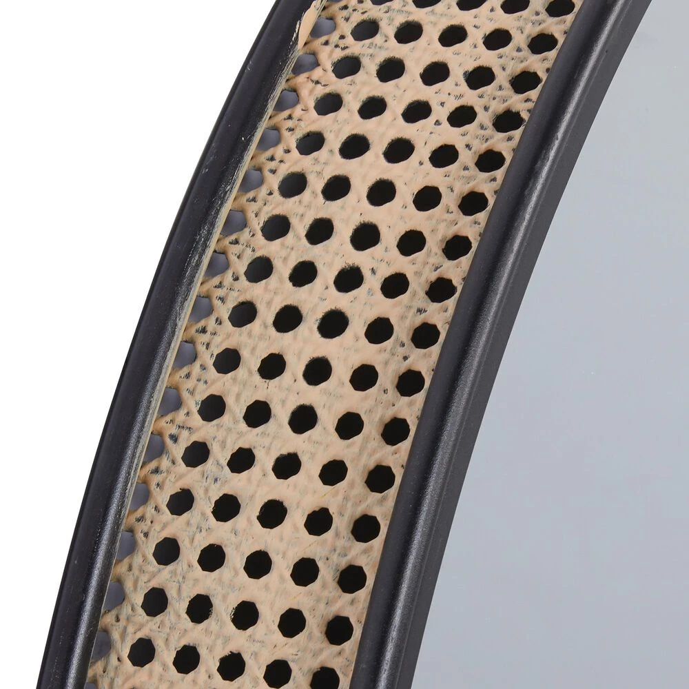 - This round wall mirror has a matte black frame with a beige faux wicker design