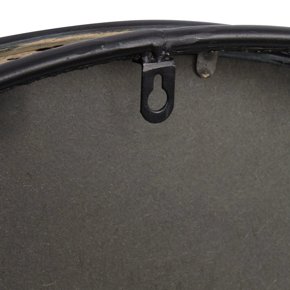 - This black wall mirror has a metal frame with a faux wicker detail in wheat beige