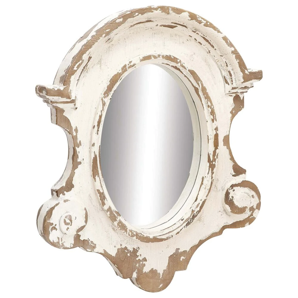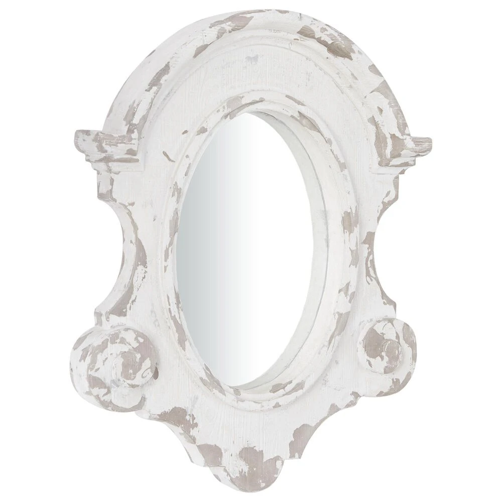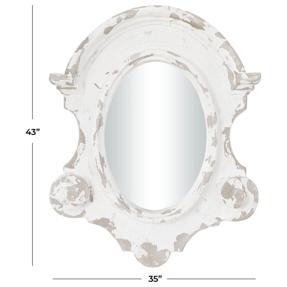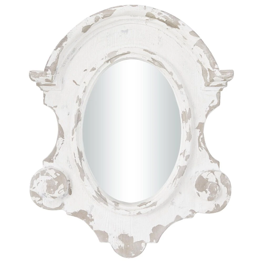 Very decorative with layers of texture, this large wall mirror features an antique frame shape painted antique white with heavy distressing. Decorative scrollwork flourishes are carved throughout the wood frame with a vintage emblem silhouette housing the oval mirror inlay. This white mirror is robust makes a great centerpiece over your sofa or in your dining room. Item features metal loop for easy and secure hang. Suitable for indoor use only. This item comes shipped in one carton.