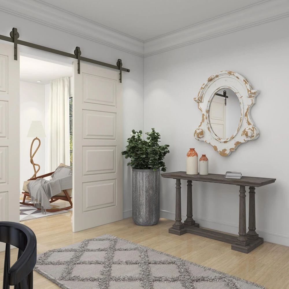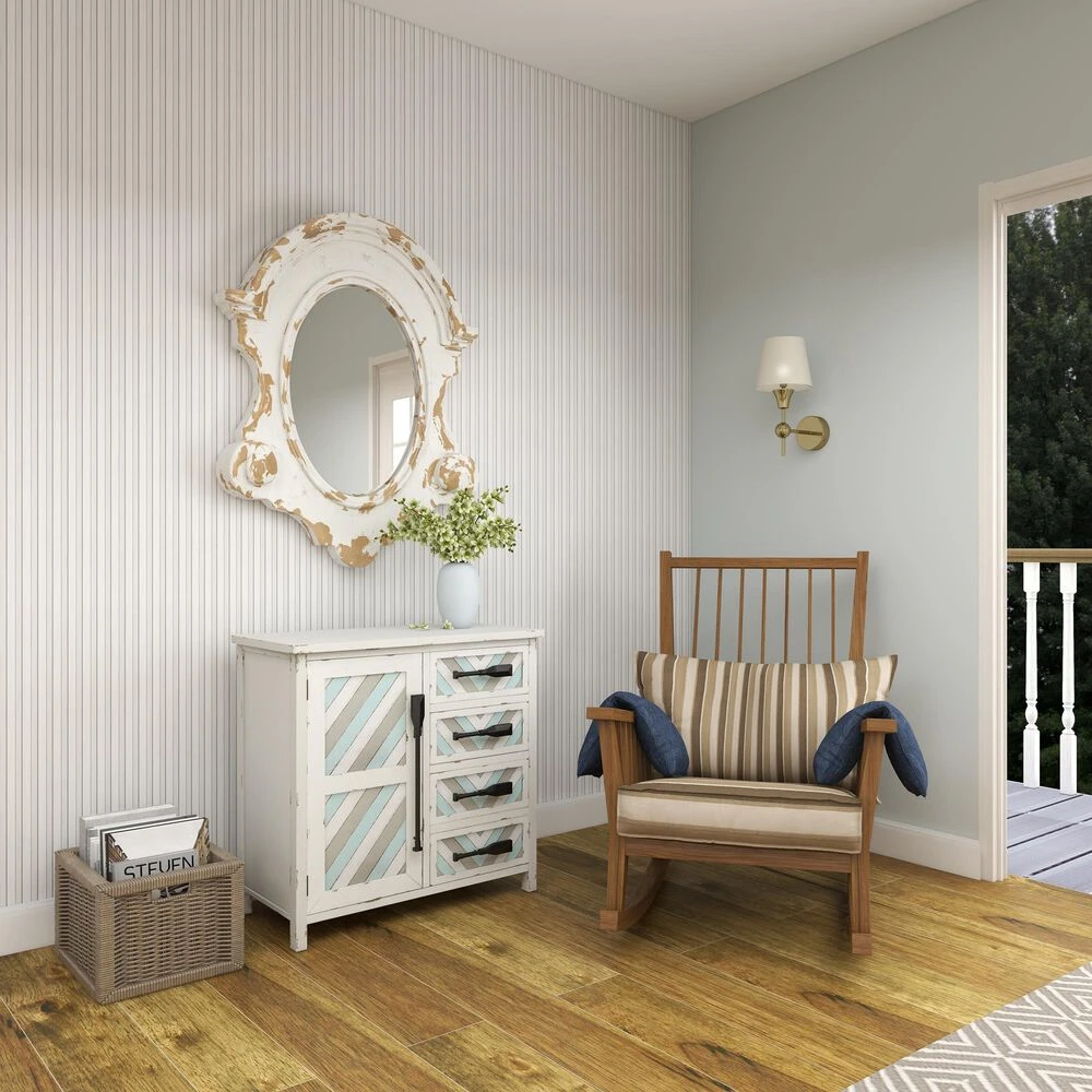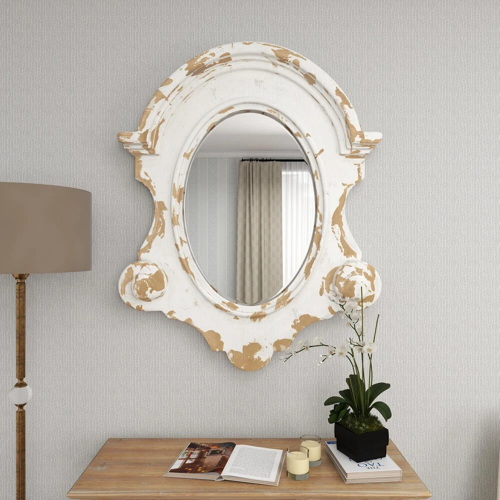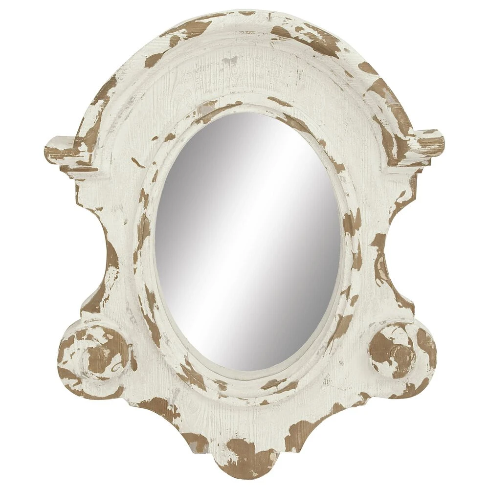Very decorative with layers of texture, this large wall mirror features an antique frame shape painted antique white with heavy distressing. Decorative scrollwork flourishes are carved throughout the wood frame with a vintage emblem silhouette housing the oval mirror inlay. This white mirror is robust makes a great centerpiece over your sofa or in your dining room. Item features metal loop for easy and secure hang. Suitable for indoor use only. This item comes shipped in one carton.