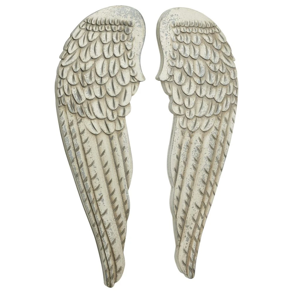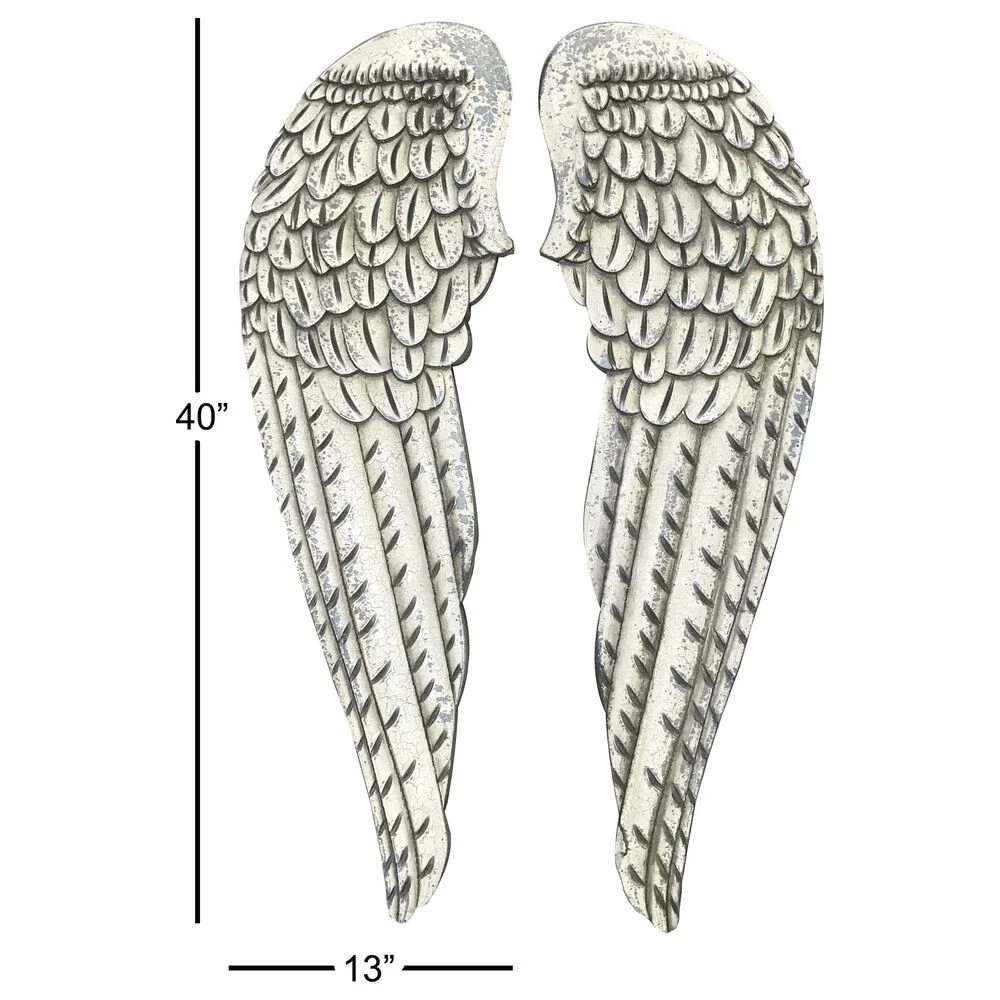 Dramatic, large angel wings wall art with vintage style from their distressed white finish bring ethereal antique style to your home. This wood wall decor set has detailed carvings forming the feathers, accentuating the wings texture. Easy and ready to hang with metal hardware backing, this carved wood wall art set are true statement pieces in any room of your house. Suitable for indoor use only. This set includes 2 angel wings wall decor art. This item comes shipped in one carton.