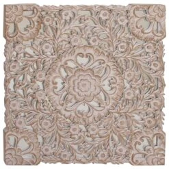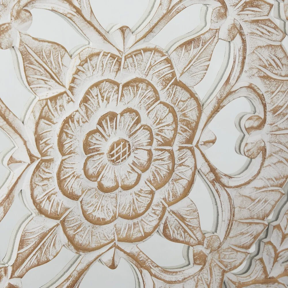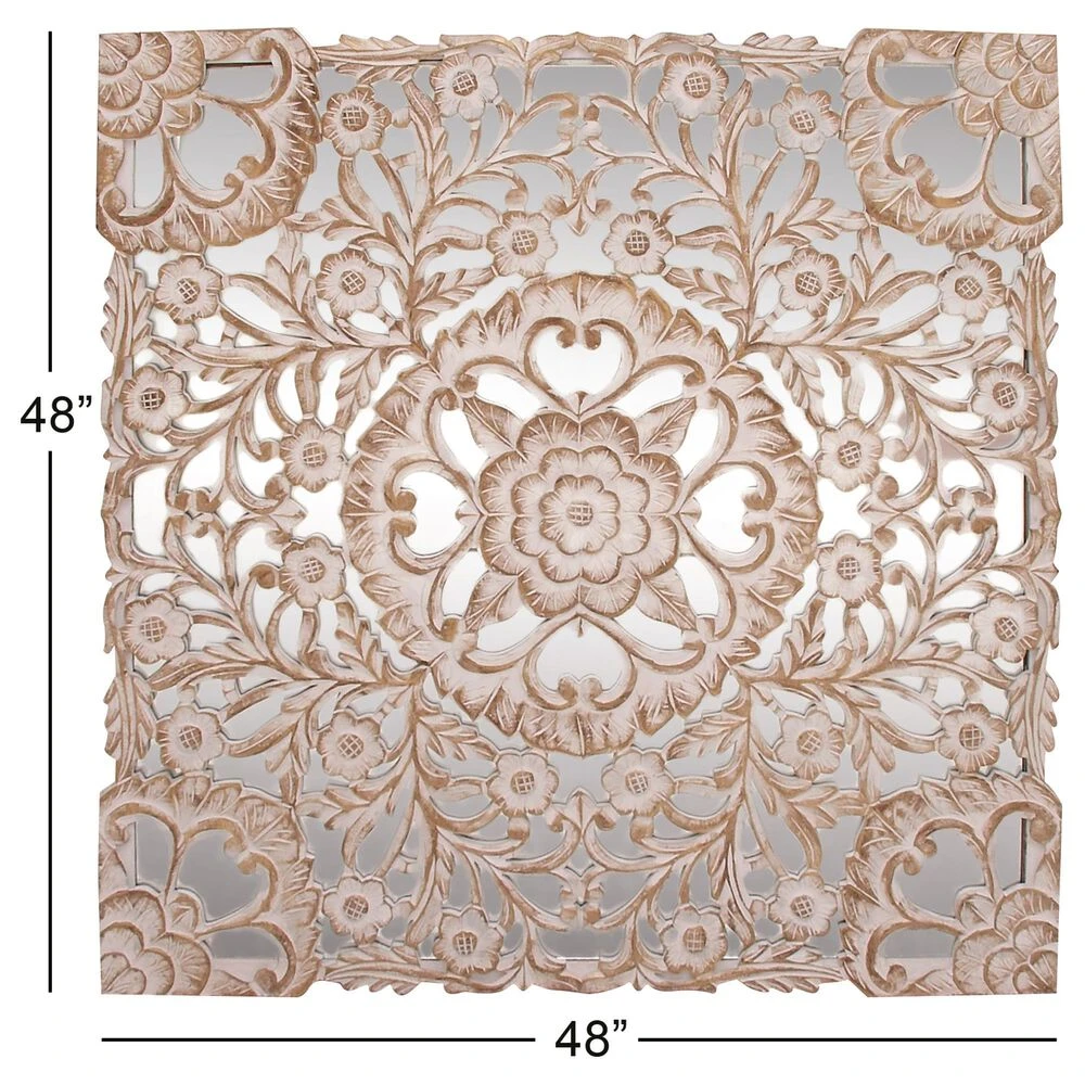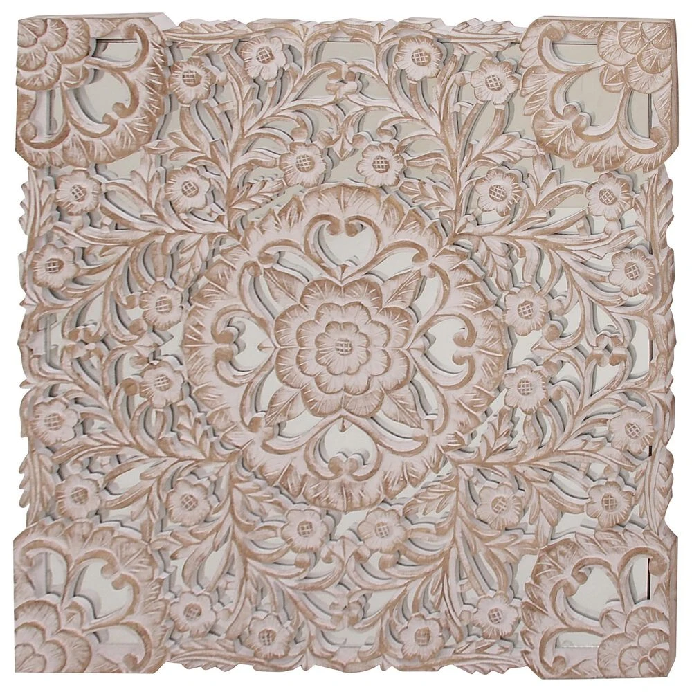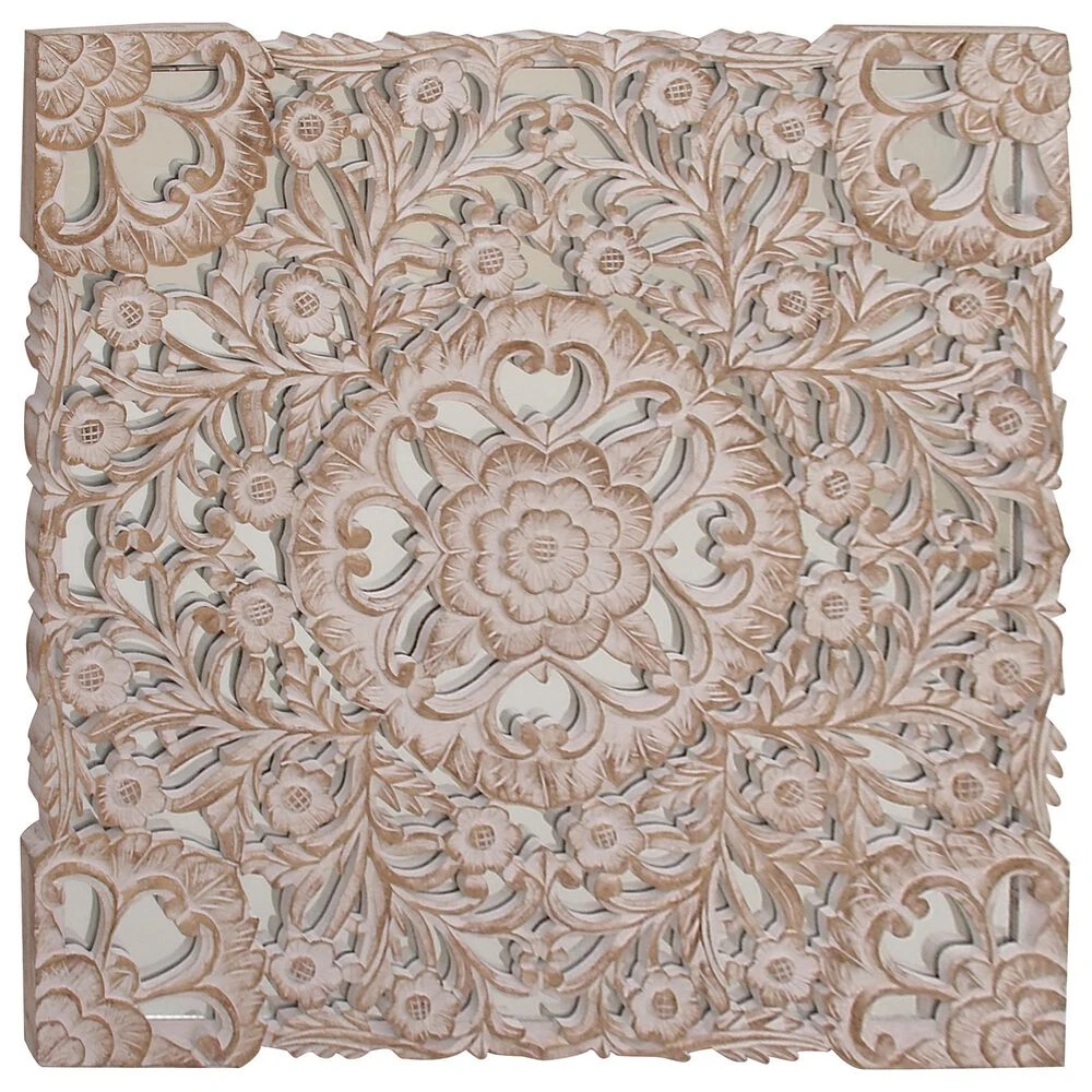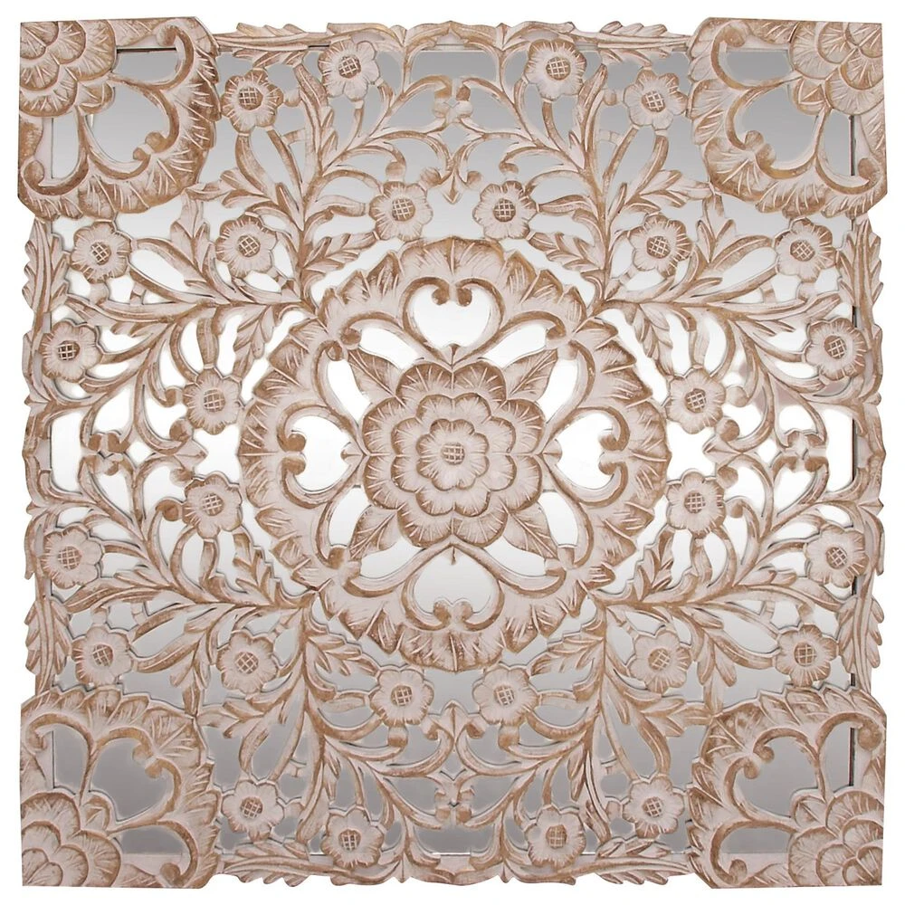You dont need to take a day off to decorate and make your walls look great. Make your home exceptional in an hour with this wooden floral panel. This accent piece features a square mirror panel designed with an overlay of intricate floral carvings in white patina finish. This lovely wall decor suits traditional styled interior that craves for a stylish home decoration. Hang this amazing decor piece anywhere you want and bring a relaxing and feel-good atmosphere to your space. Suitable for indoor use only. This item comes shipped in one carton. Made in India. Includes hanging hardware for easy hanging.