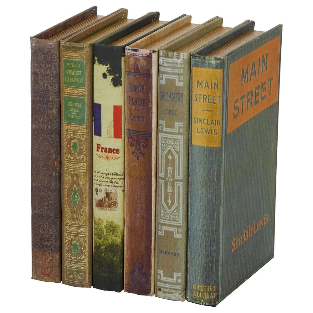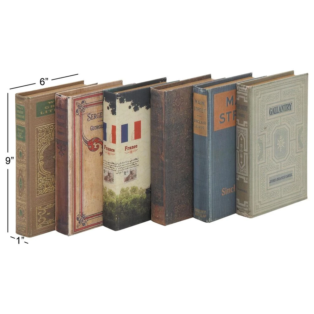 Perfect way to add depth and texture to your surface space with this compact and discreet box. A practical yet stylish upgrade that instantly elevate the look of your room. This decorative wood and fabric book box set will make a stylish addition to your bookshelf or to any shelf in your traditional style inspired home. This item ships in 1 carton. Suitable for indoor use only. Comes in a set of 6 measuring 7″ wide and 8″ high. Traditional theme. Features different vintage patterns, book title, and book covers including “World’s Greatest Literature”, “Serge Pakine”, “Main Street” and “Gallantry”.