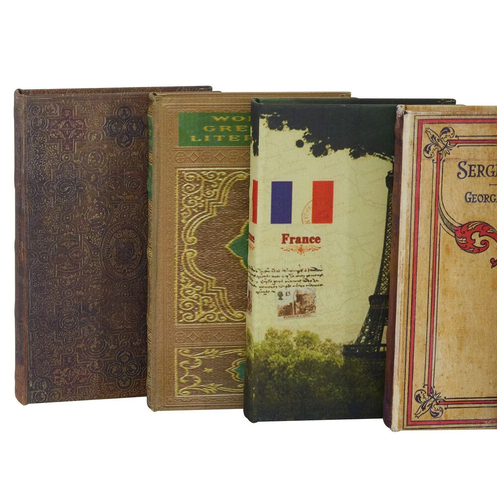 - This traditional style inspired design multicolored wood and fabric book box set features 6 vintage faux books than open as decorative boxes attached