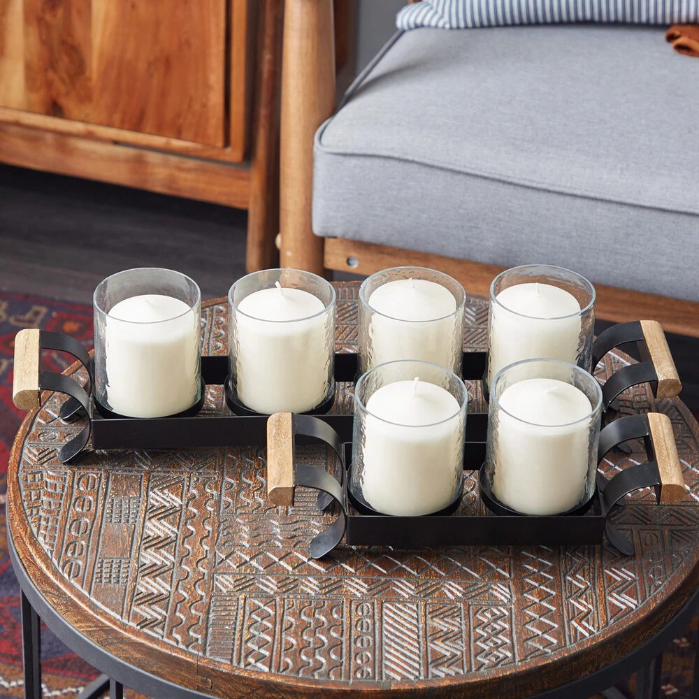 Use this wood and metal candle holder set to create an elegant scene on your coffee table or mantel. Delight your guests and make any occasion extra special by adding a lighted or flameless candle to this candle holder centerpiece. Made with a sturdy base, it is perfect for creating an elegant atmosphere at your table top or mantel. This candle tray decor will hold six tea light candles. This item comes shipped in one carton. Suitable for indoor use. Made in India. This set includes two trays. Contemporary style.