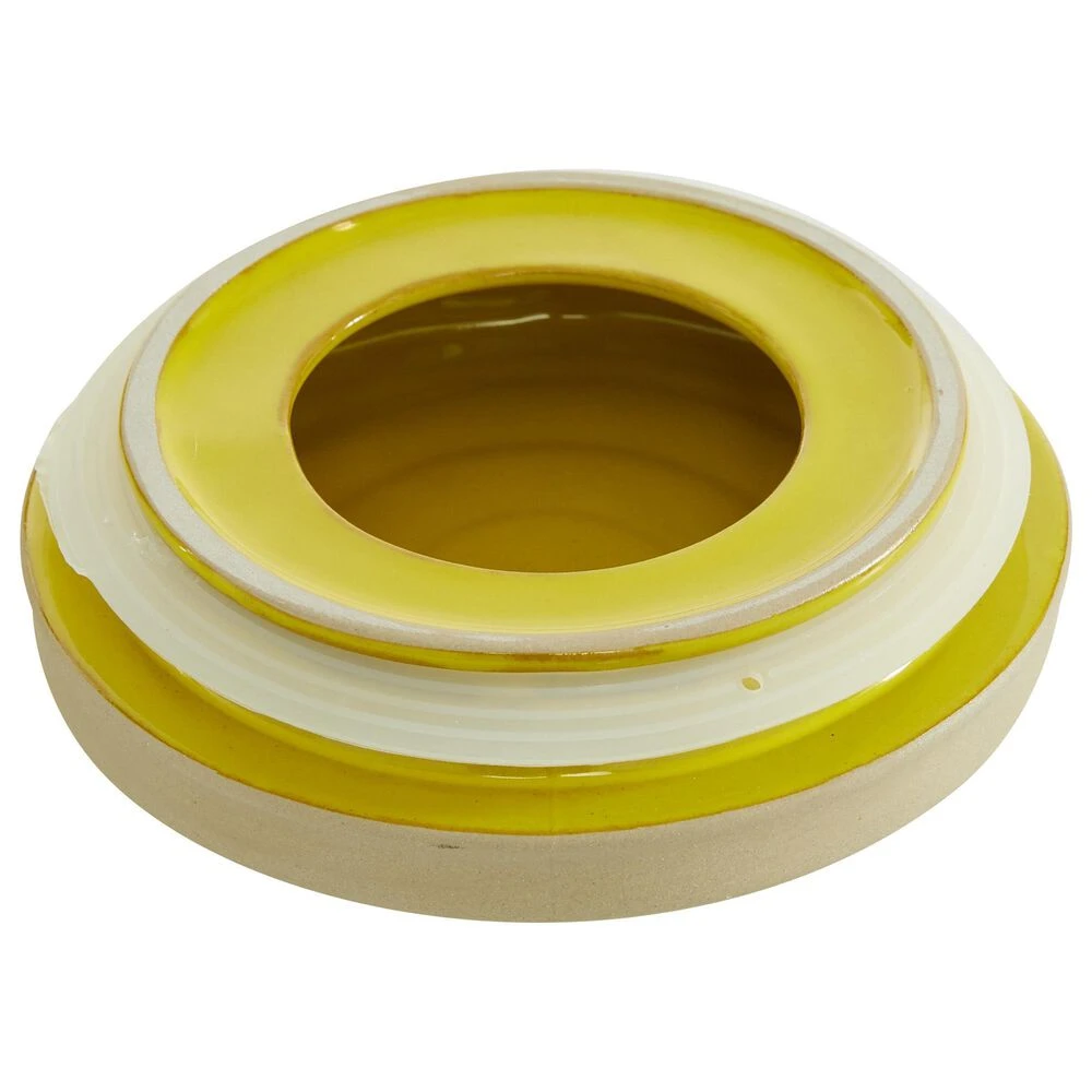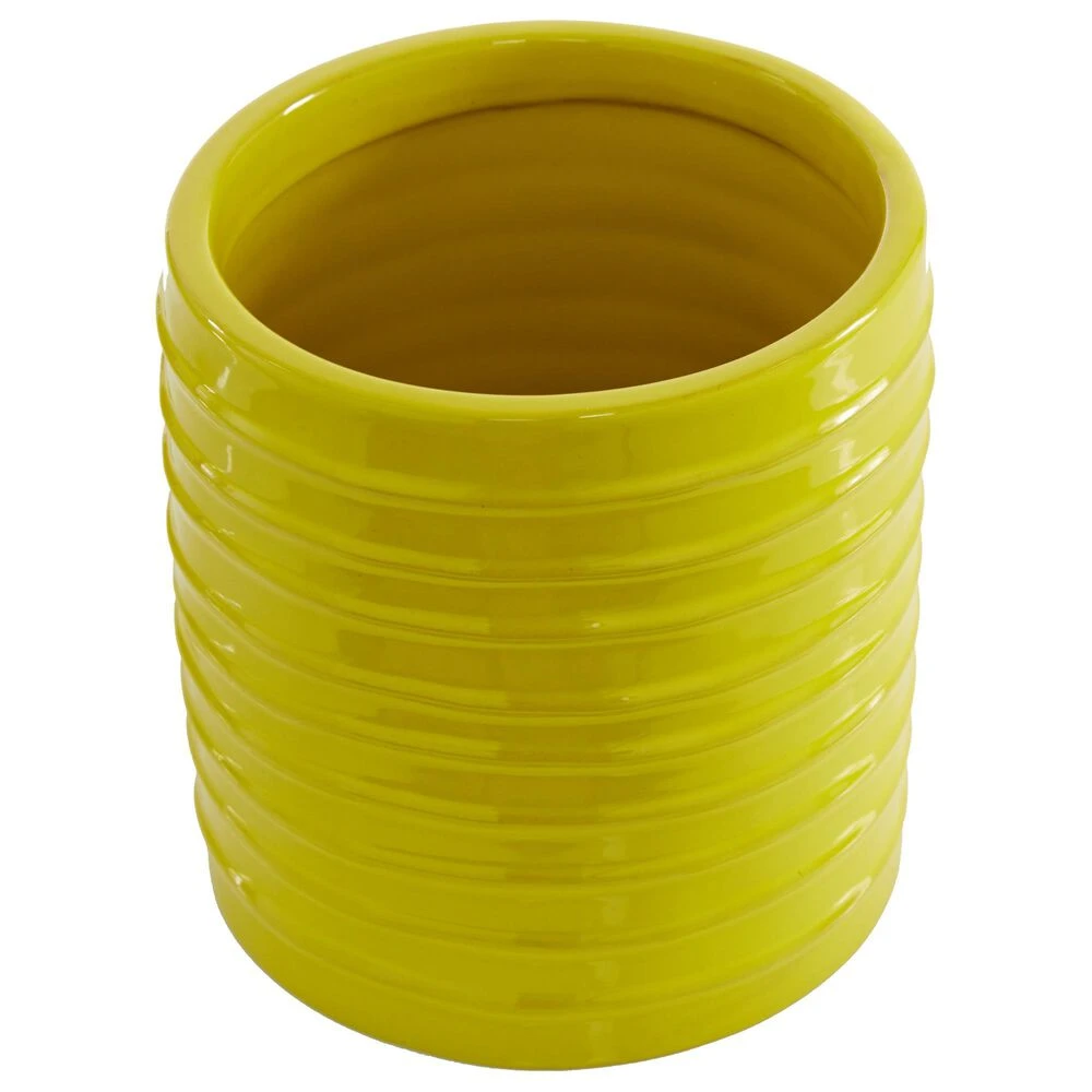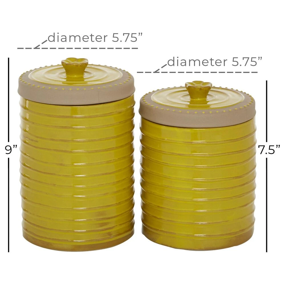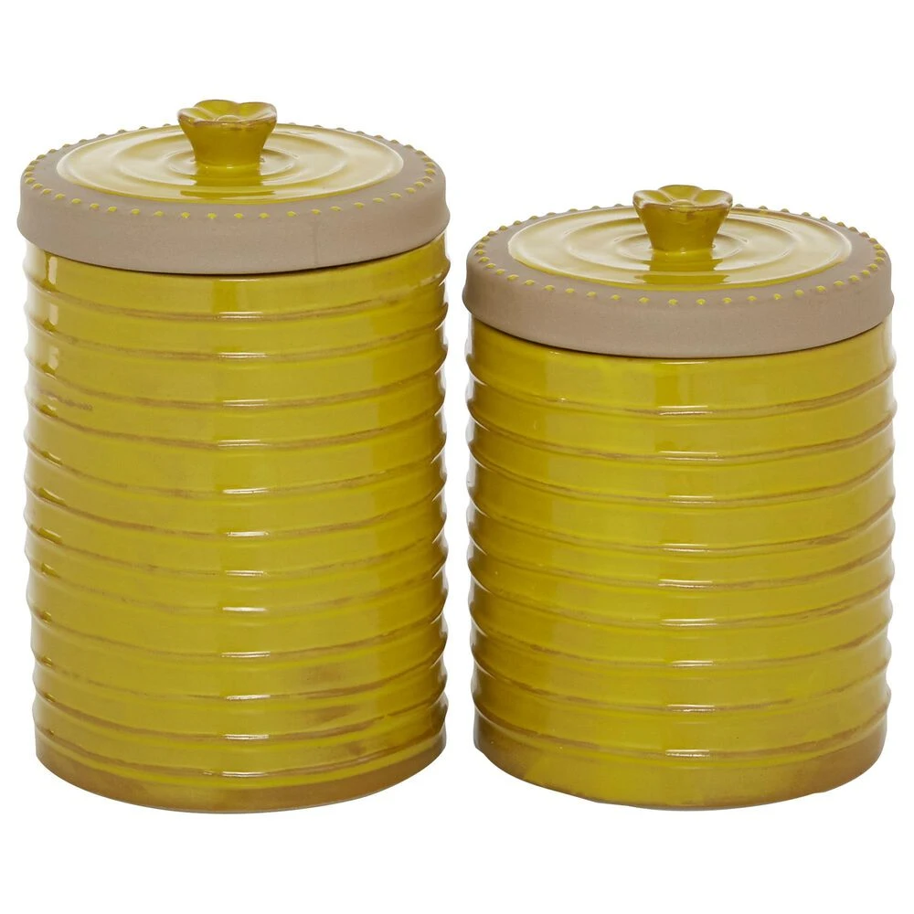 - This farmhouse style inspired design yellow ceramic stone ware canister set features a cylindrical body with engraved grooves for a stylish yet functional vibe