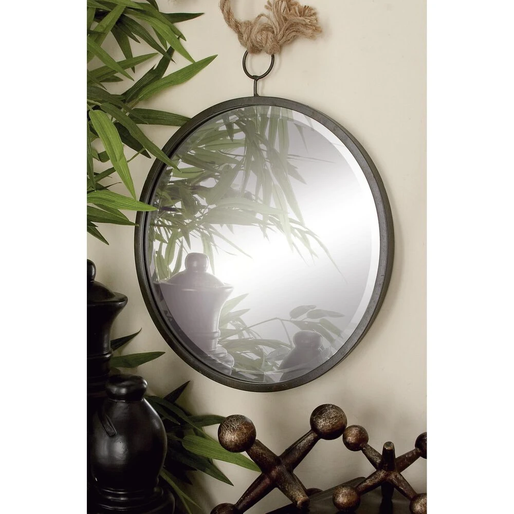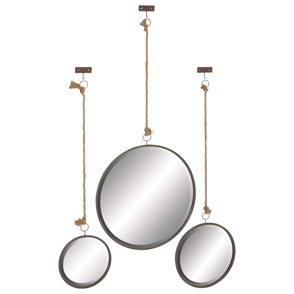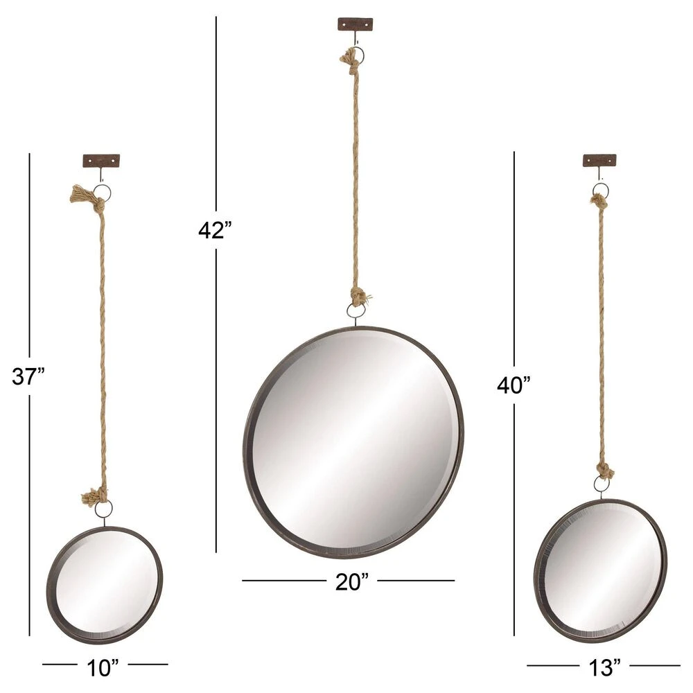 Set of three 42″, 40″ and 37″ Rustic Round Beveled Wall Mirrors, Brown Iron Frames and Wall Brackets, Jute Rope Hangers