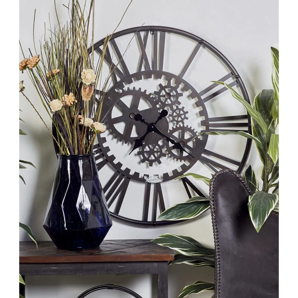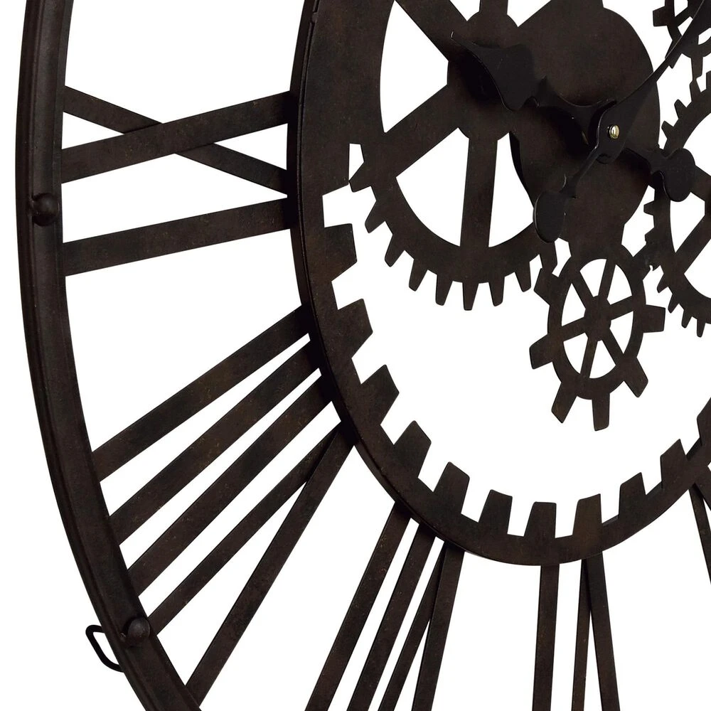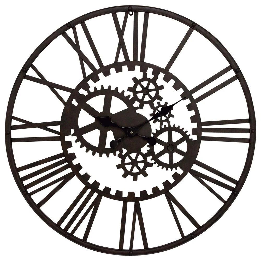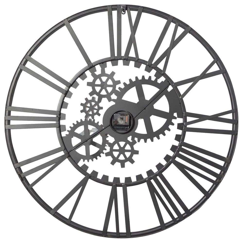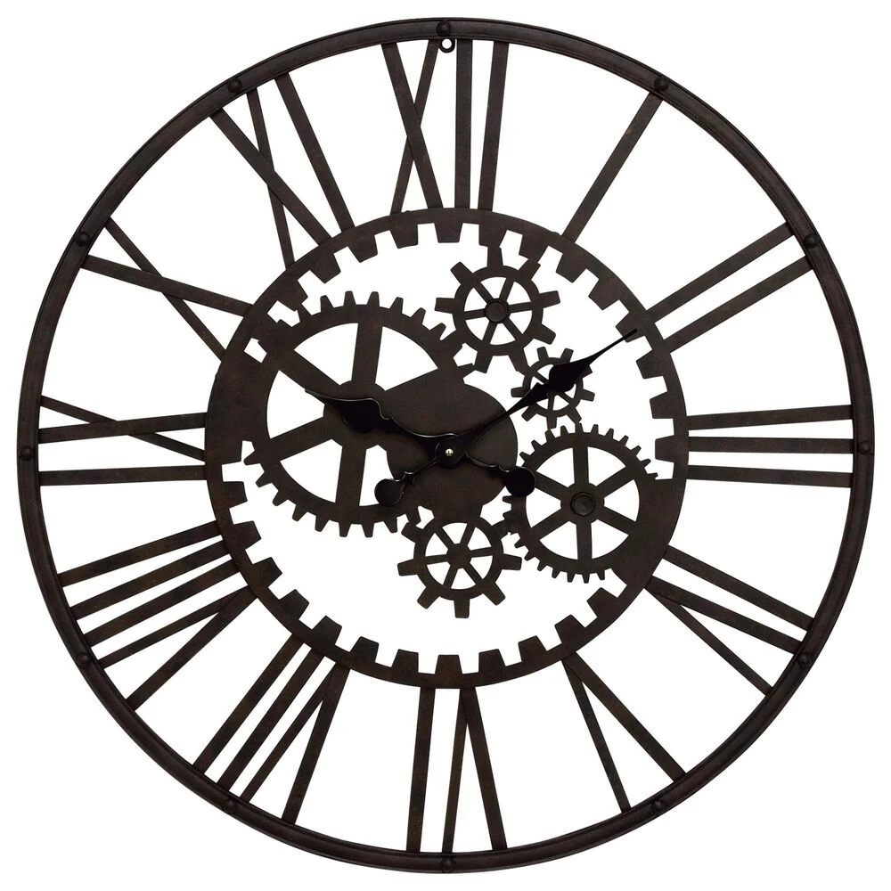 Hang our metal wall clock over a couch, shelf, or end table to add some industrial style to your space. Requires 1 AA battery. Battery not included. This item ships in 1 carton. Roman numerals clock face. The clock mechanism runs silent. Round wall clock has exposed gears, black-colored clock hands, and easy-to-read Roman numerals. Easy and ready to hang. Suitable for indoor use only. Industrial style.