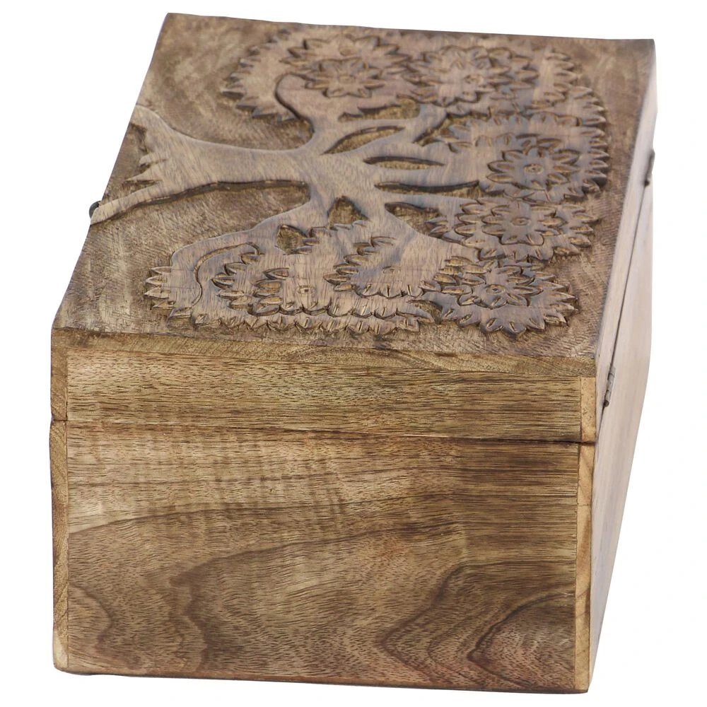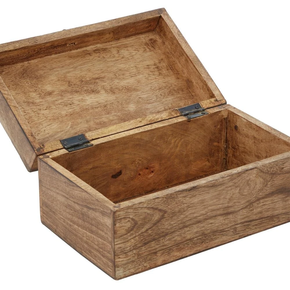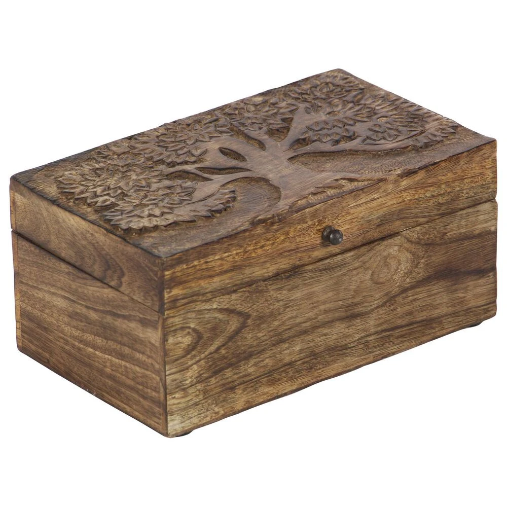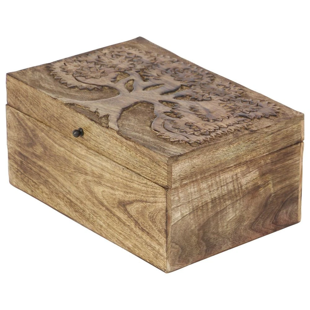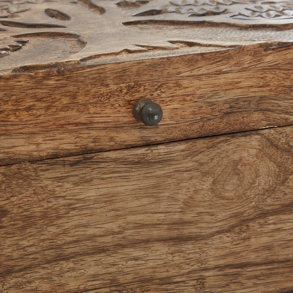- Features a 3 piece set of boxes with aesthetic wood carvings and natural brown finish