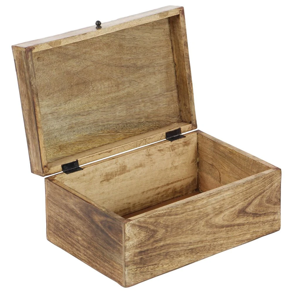 A practical yet stylish upgrade that instantly elevate the look of your room. Perfect way to add depth and texture to your surface space with this compact and discreet box. Use these jewelry organizer boxes together or separately to store personal belongings in the boudoir or bedroom or showcase table displays in the living room. Designed with black rubber stoppers at the base that prevent scratching furniture and table tops, as well as sliding around. This item ships in 1 carton. Wood box makes a great gift for any occasion. Due to the handmade nature of this item, no two will be alike, there will be slight differences in shape, size, and color. Suitable for indoor use only. Made in India. This is a 3-piece jewelry box set. Rustic design.