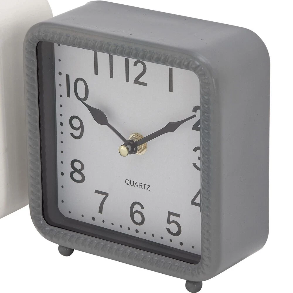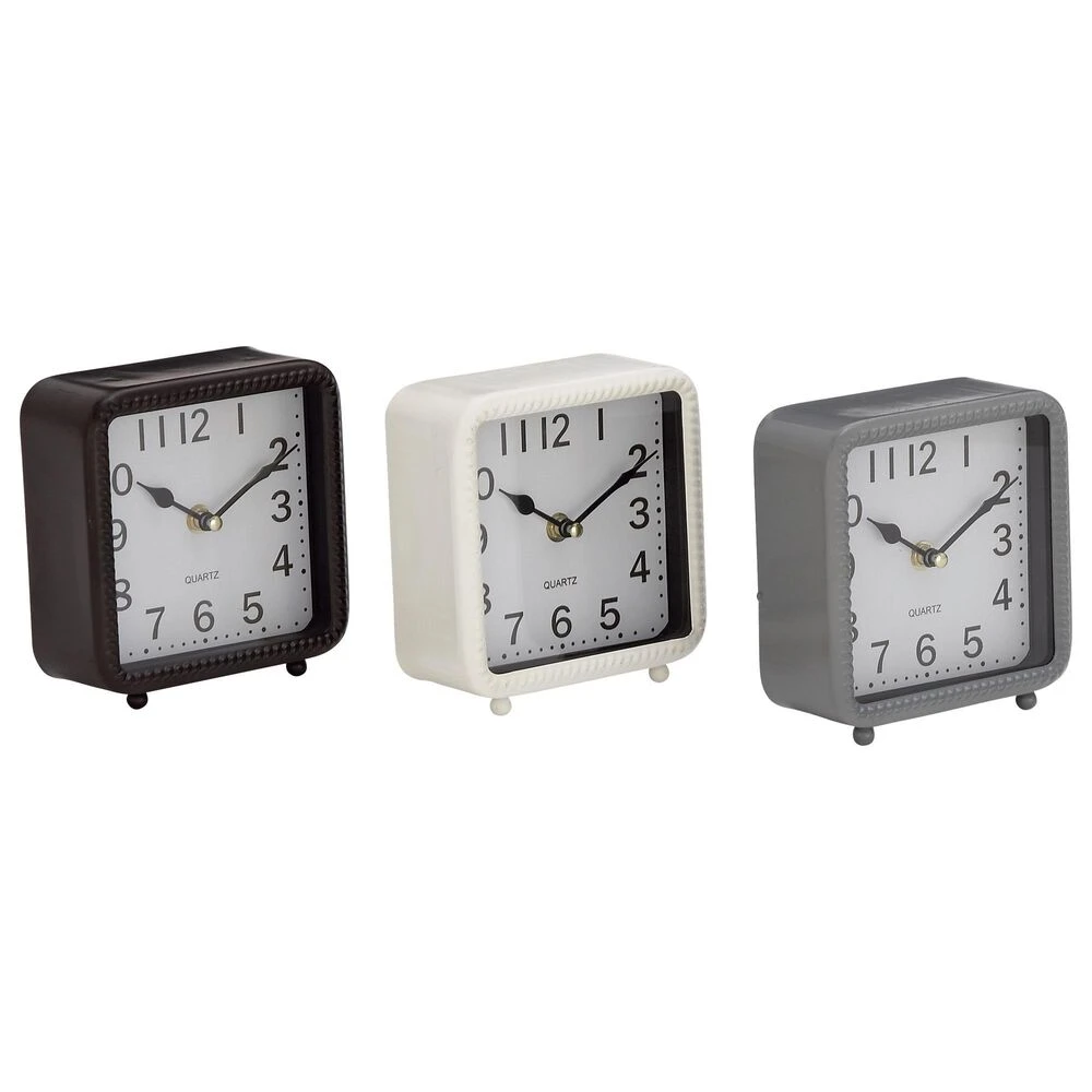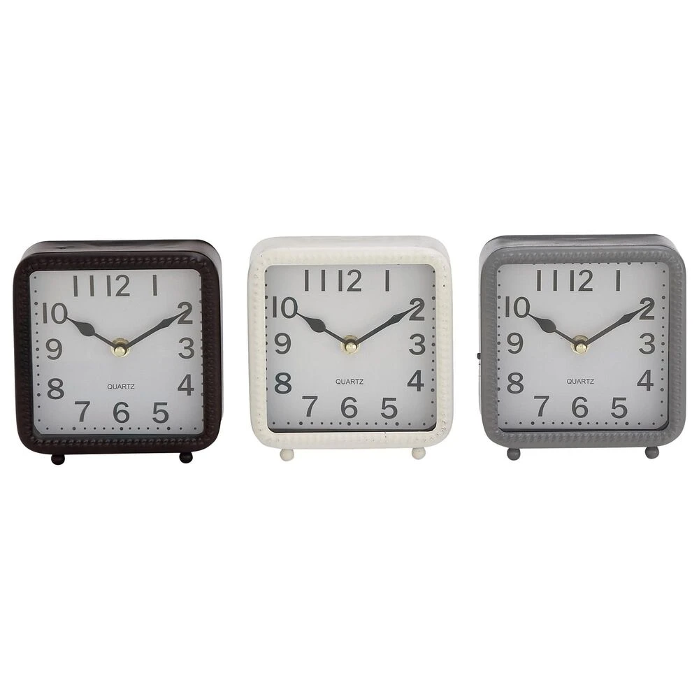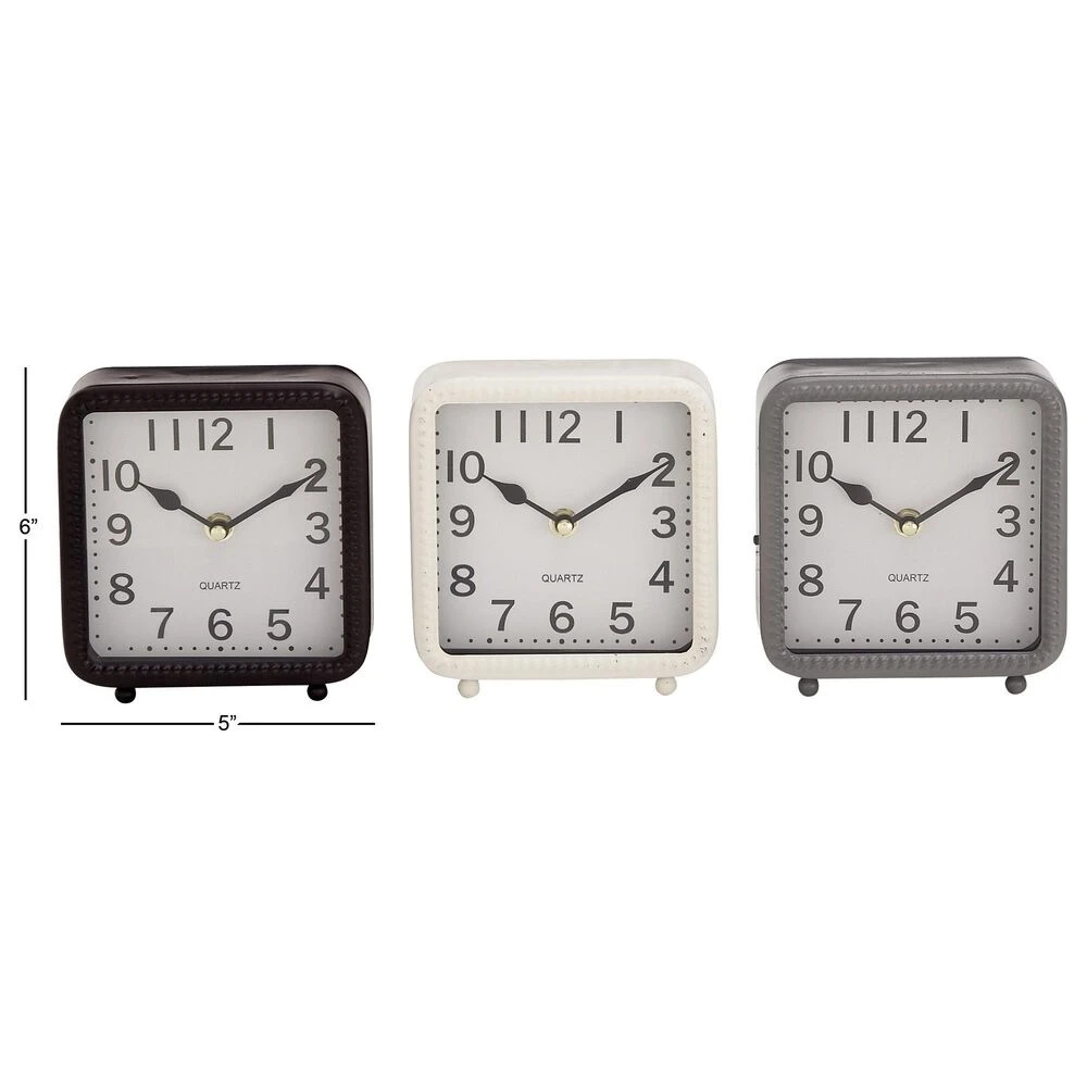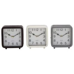 Improve your time management skills and keep a clock close by with this charming piece. A dashing display on any surface to help you manage your time throughout the day. Keep track of time in style by adding each of these neutral-colored analog clocks on your tables, shelves, counters, mantels, or nightstands to complement patterned decor a and for an effortless upgrade to your traditional indoor aesthetics. Requires 1 AA battery each. Batteries not included. This item ships in 1 carton. Furnished with Arabic numbers and dot prints for hour and minute markers. The clock mechanism runs silent. Metal clock makes a great gift for any occasion. Suitable for indoor use only. The set includes 3 clocks. Traditional theme. Each clock face showcases typographies that reads “QUARTZ”.