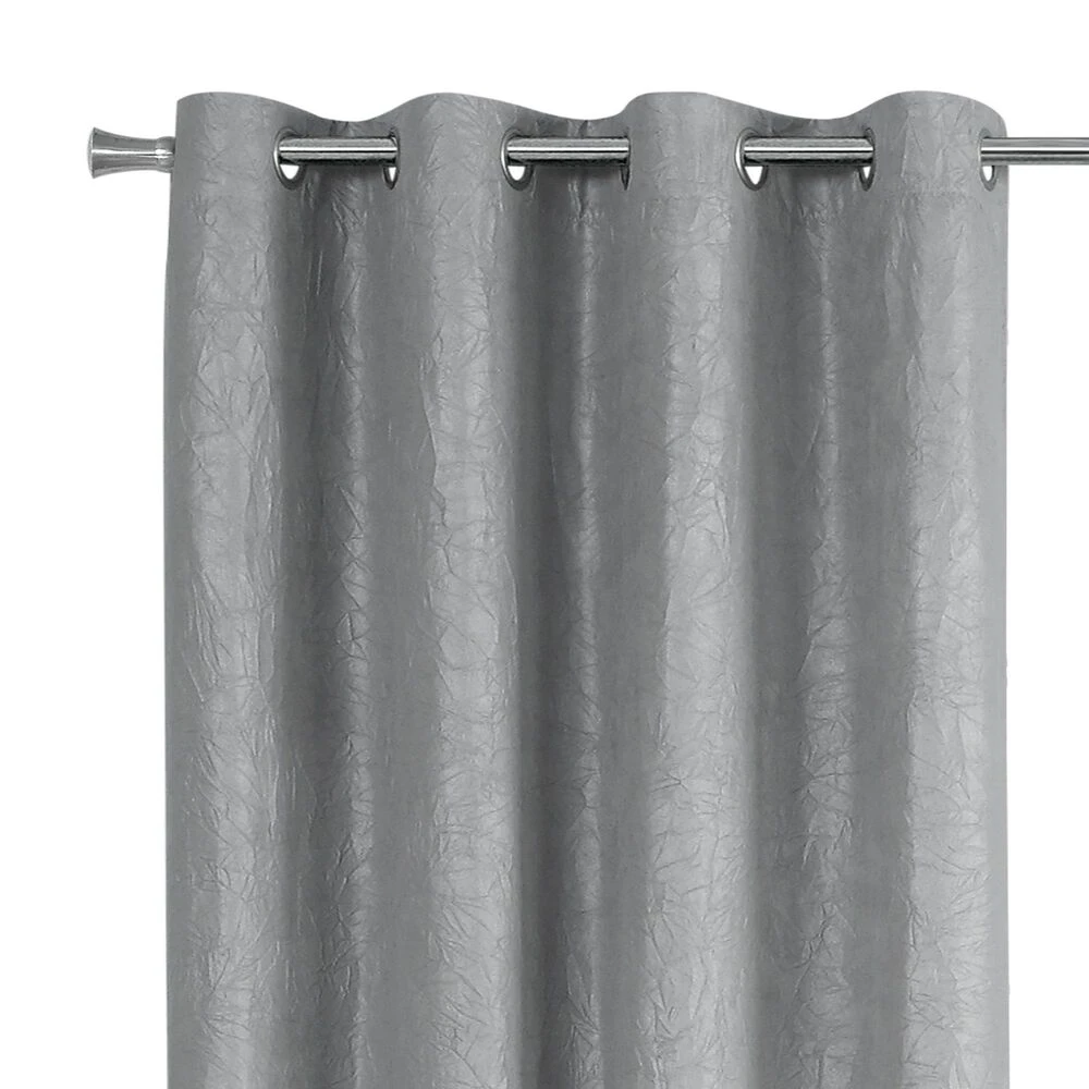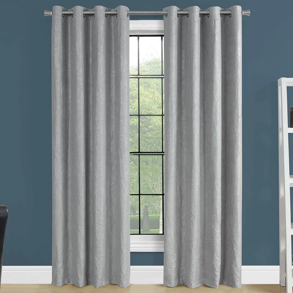 Opt for a casual elegant look in a room with this set of two room darkening curtain panels. Each 52″W x 84H” unlined panel is finished in a soft micro-suede silver with a wrinkled look for added texture. The machine washable room darkening polyester fabric provides privacy and filters out the light for a peaceful ambiance. The 8 silver metal grommets on each panel allows for a quick setup and the simple, straight classic lines of these curtains are versatile enough to hang in a living room, bedroom, or dining room. Curtain rod not included and must be purchased separately.