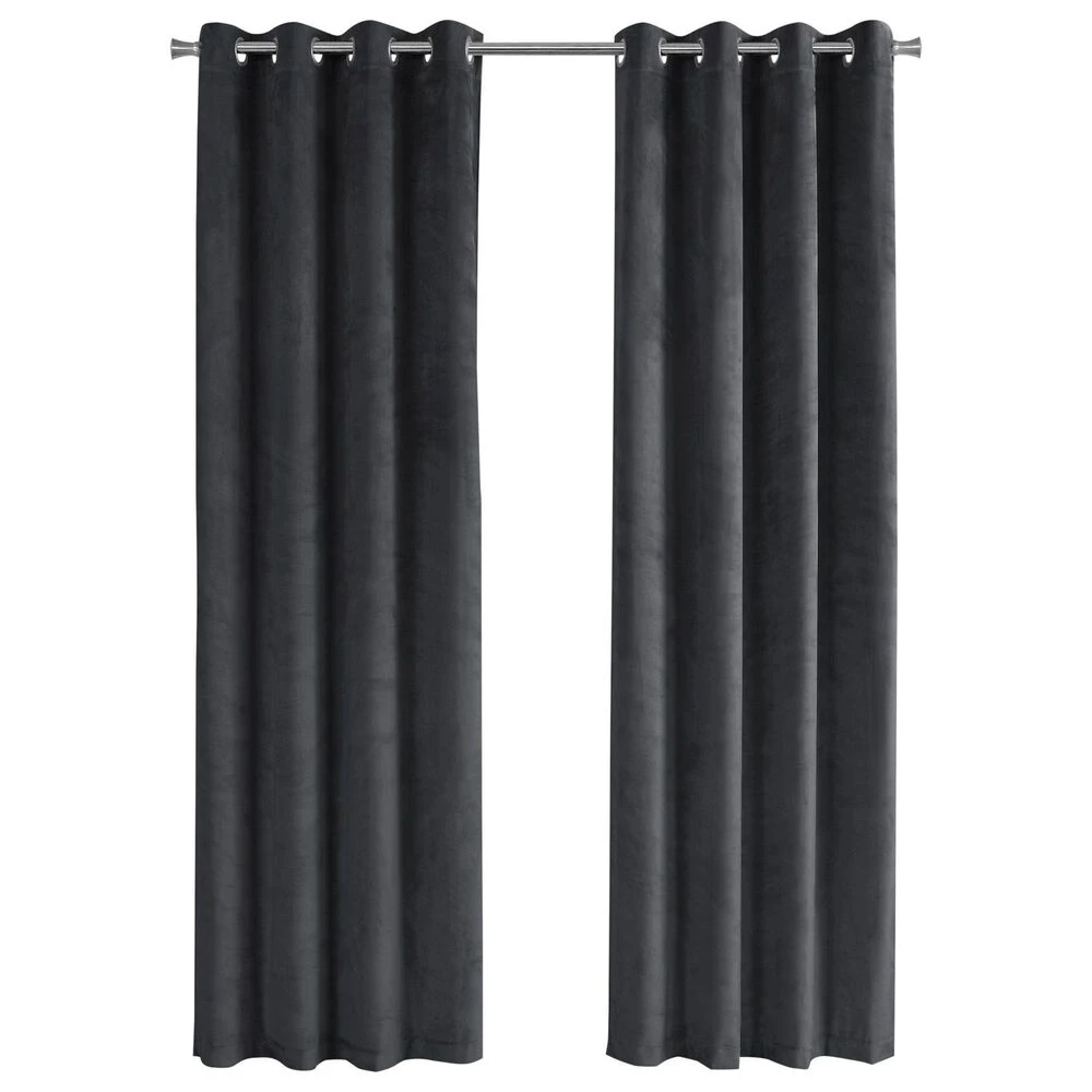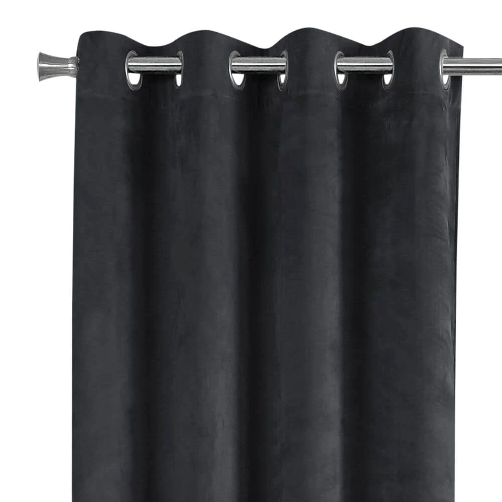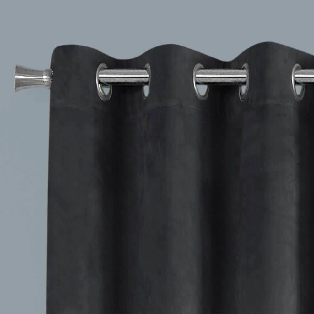 Bring a subtle luxe look to a room with this set of two room darkening curtain panels in a soft velvet finish that is machine washable. Each 52″W x 95″H curtain panel is made with room-darkening material to help filter out the light, giving a cozy ambiance to a space. The 8 silver metal grommets on each panel makes it a quick setup and the simple, elegant lines of these extra-long grey curtains are versatile enough to hang in a livingroom, bedroom, or dining room. Curtain rod not included and must be purchased separately.