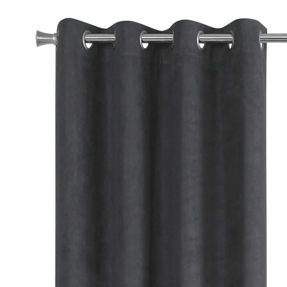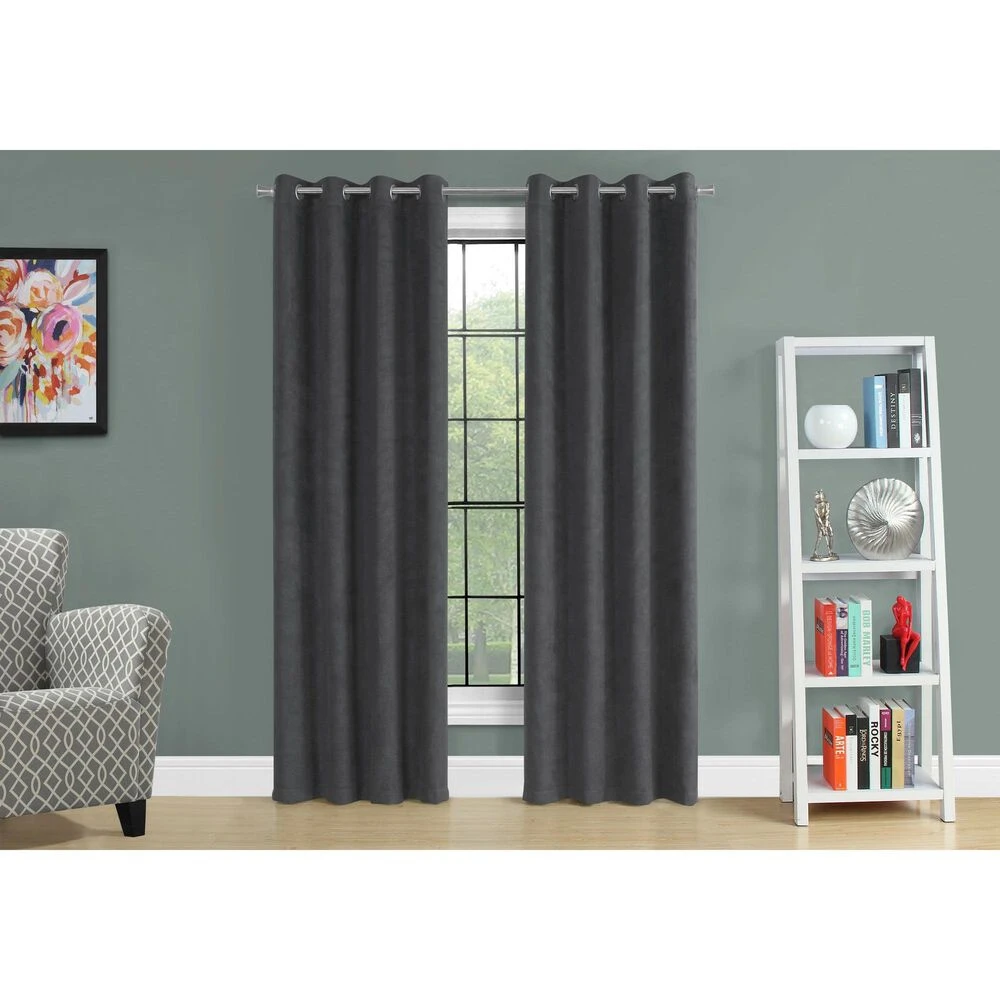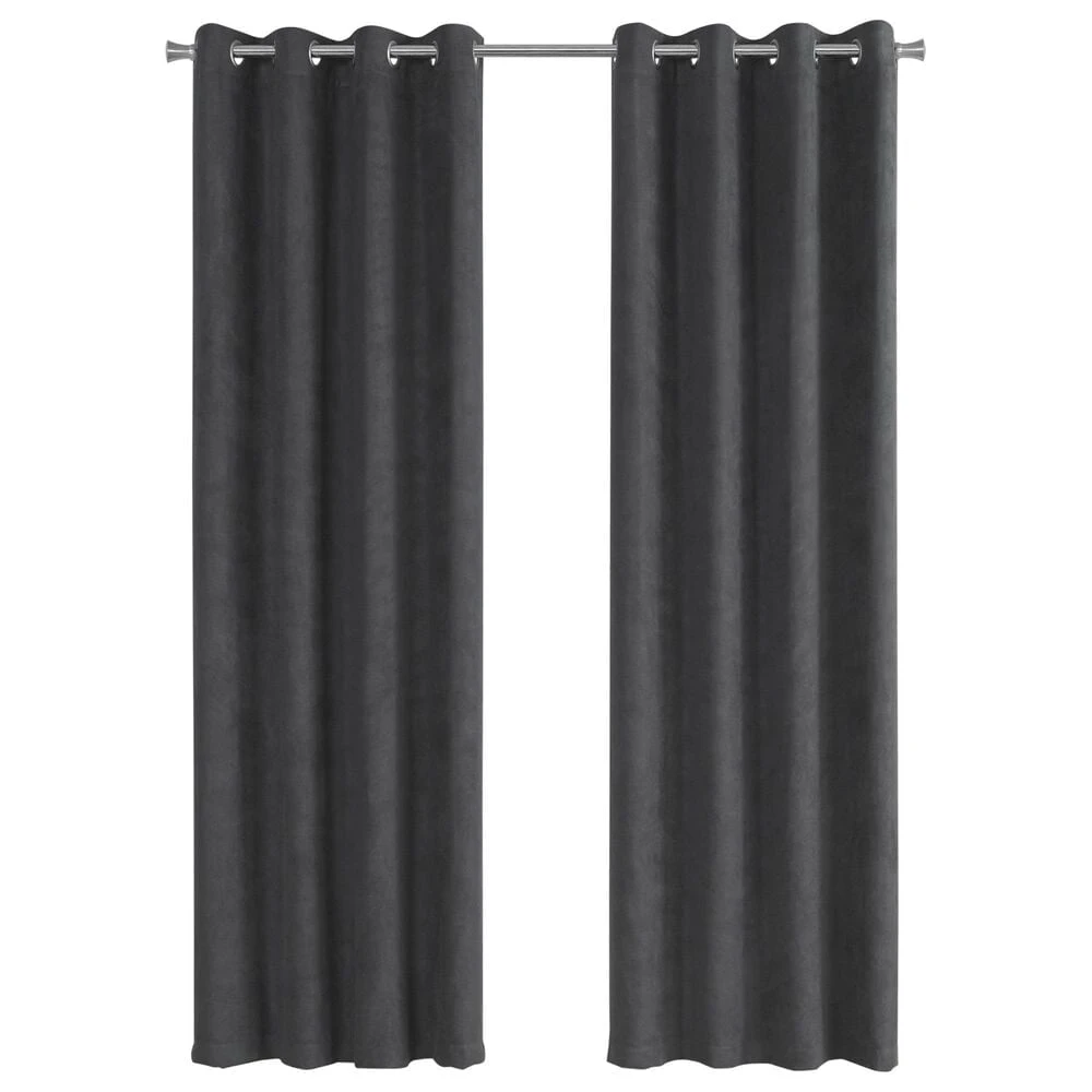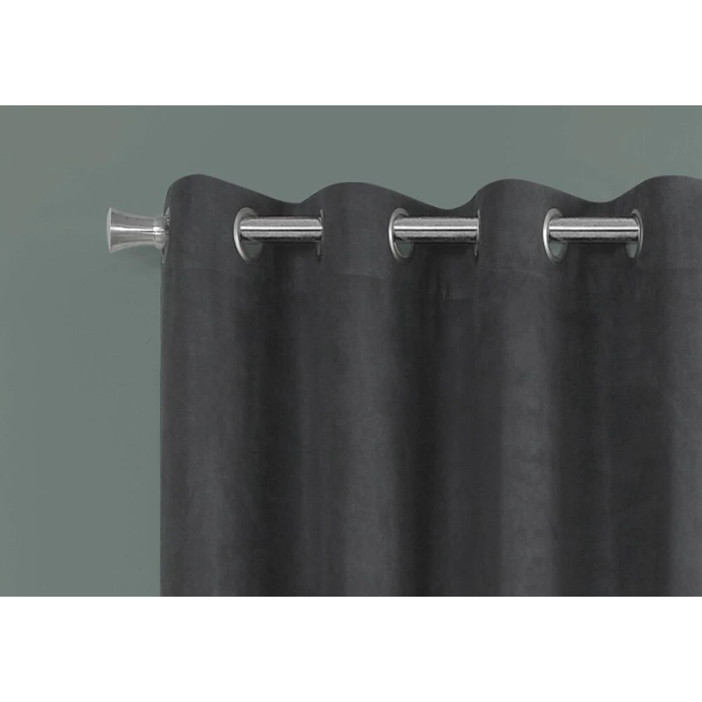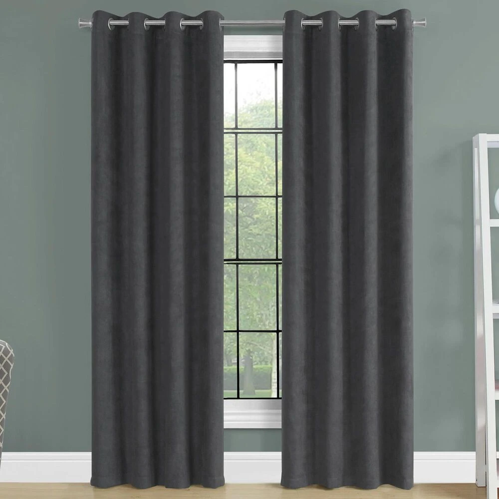 Add an elegant finishing touch to a room with this set of two room darkening curtain panels in a soft micro-suede finish that is machine washable. Each 54″W x 84″H curtain panel incorporates room-darkening material to help block out the light, giving a quiet peaceful retreat to a room. The 8 silver metal grommets on each panel make it a quick setup, and the simple straight classic lines of these grey curtains are versatile enough to hang in a living room, bedroom, or dining room. Curtain rod not included and must be purchased separately.
