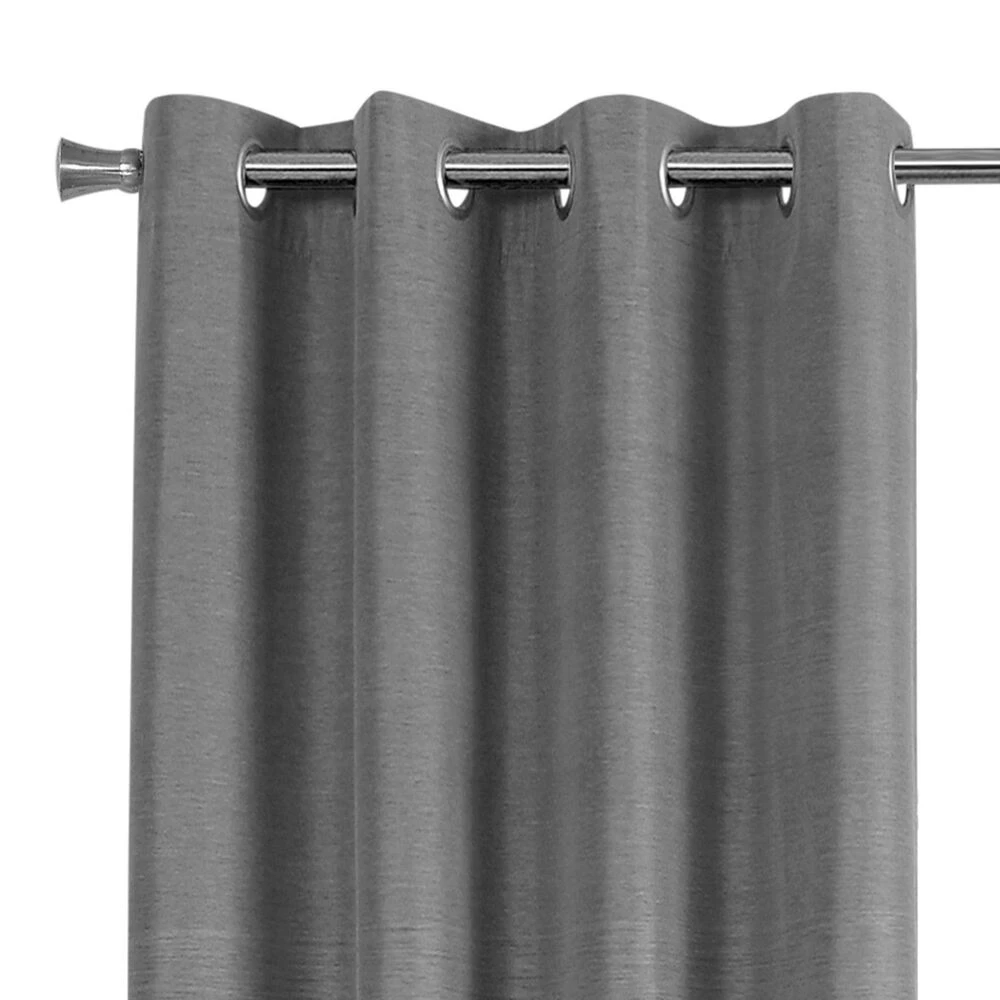 Give your space a luxurious look with this set of two blackout curtain panels in a contemporary grey finish. Each 52″W x 84″H unlined curtain panel is embedded with solid blackout material blocks out the light when needed, and provides thermal insulation from the heat and cold. The sumptuous, wrinkle free soft polyester fabric give an air of elegance to a room, and the 8 silver metal grommets on each panel makes it a quick setup. The simple classic design of these curtains are versatile enough to hang in a living room, bedroom, or dining room. Panels are dry clean only. Curtain rod not included and must be purchased separately.