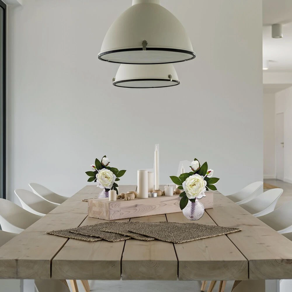 Resembling an old-fashioned rose, the double-bloom peony is an elegant accent. The budding to full bloom peonies are complete with a textured vase perfect as a centerpiece. Place on a bookshelf or accent table for a chic touch to your Farmhouse style home.