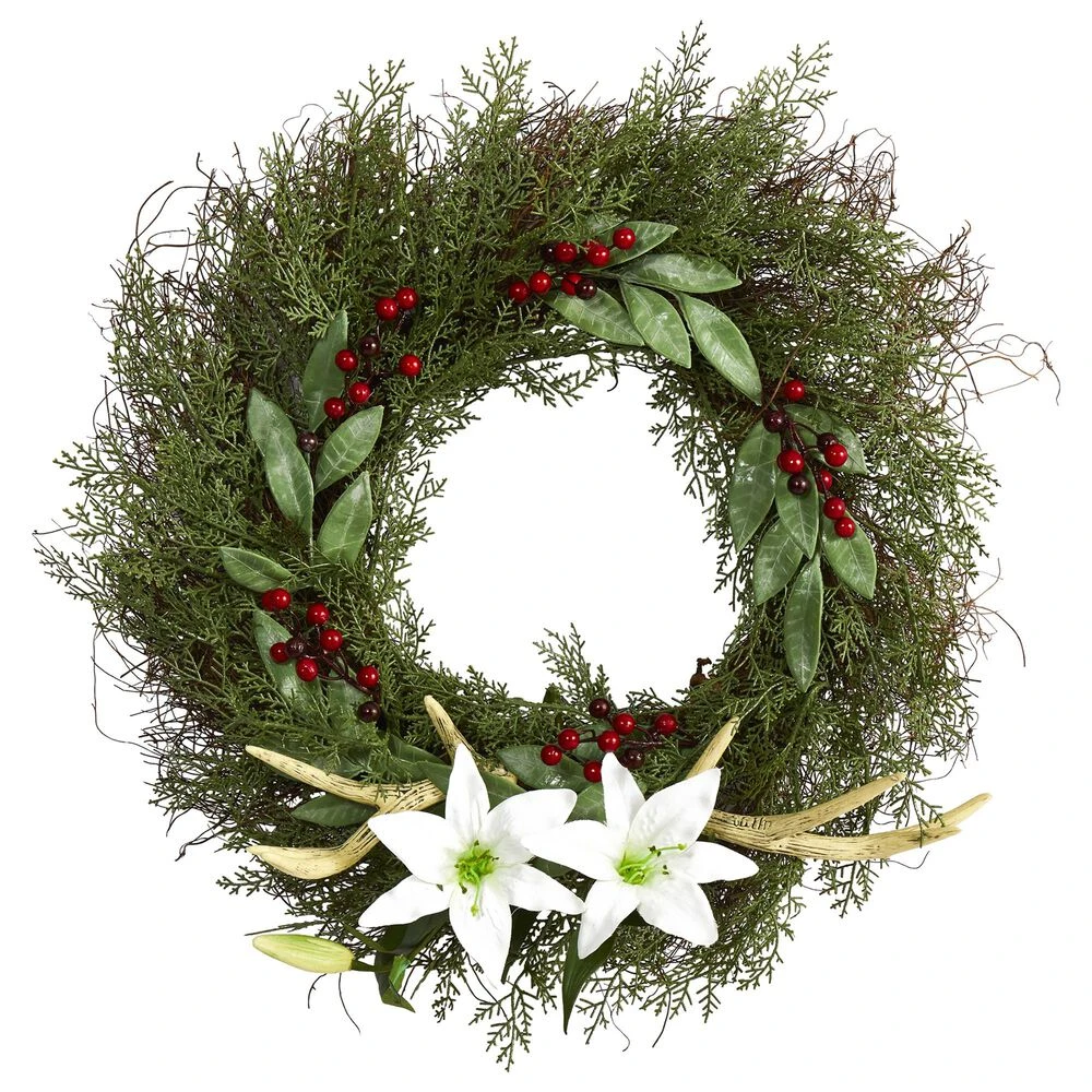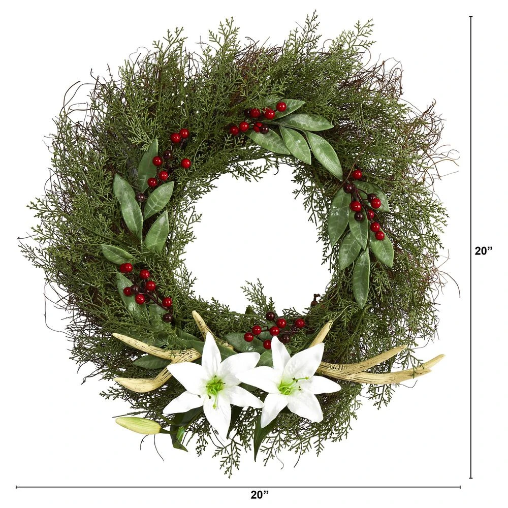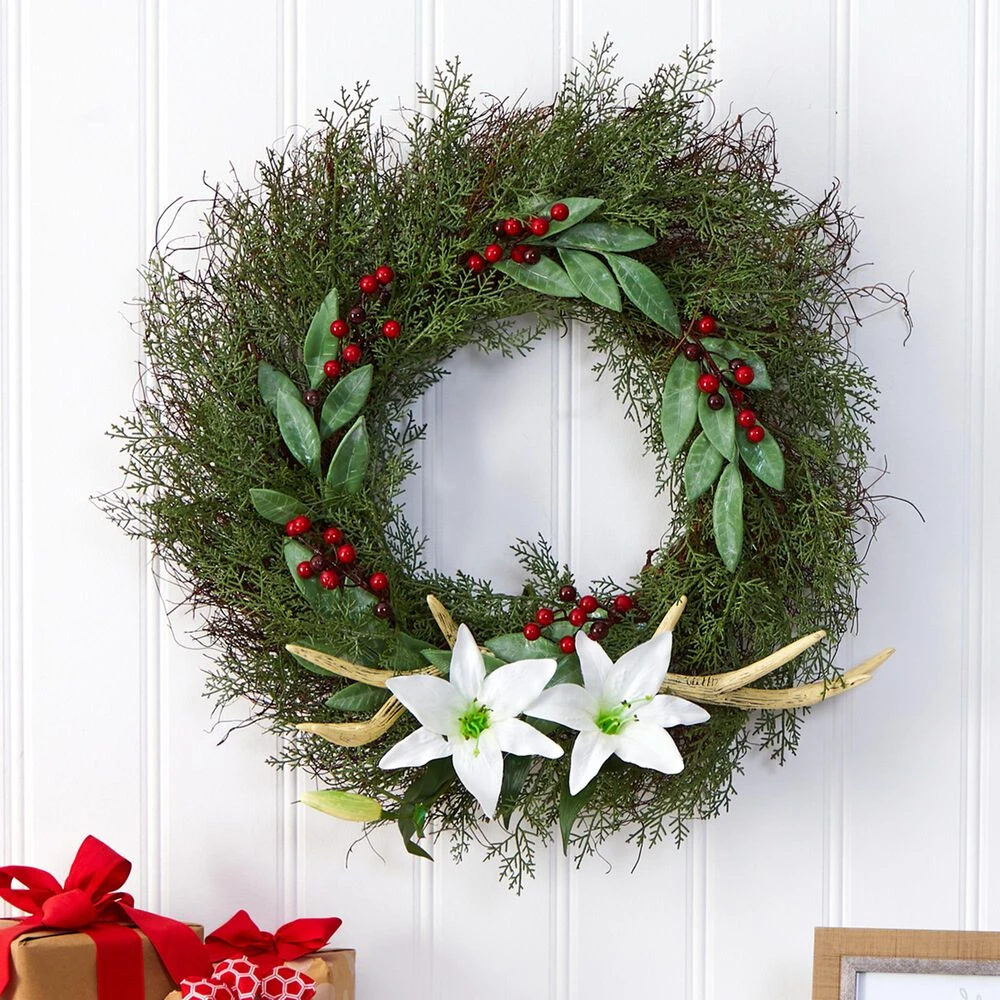 Update your favorite seasonal accents and add some curb appeal to your home or office entrance with the beauty provided by this artificial wreath intricately designed from a balanced mix of ruscus and cedar greenery, all carefully complemented with faux red berries that look incredibly lifelike and a pair of antlers for a touch of handsome ruggedness. Great for seasonal display, this 20 (in circumference) decorative faux wreath makes for an inviting accent and will undoubtedly transform any homes front-door appeal all throughout the holiday season. Silk plants are manufactured using synthetic materials, such as polyester material or plastic, and are well designed and constructed to be life-like in appearance. This item will need to be re-shaped when removed from the secure box to allow it to reach its fullest size. Your artificial plant will look beautiful for years to come; simply wipe clean with a soft dry cloth when needed. About Nearly Natural Inc. – For over 75 years, Nearly Natural Inc. has been providing conscientious consumers with beautiful alternatives to natural decorations. Employing and advised by naturalists who understand the live plant world, Nearly Natural is able to recreate the most realistic-looking decorative items for homes, offices, and businesses. Driven by a true commitment to customer service, attention to detail, and natural philosophy, Nearly Natural strives to bring customers the most beautiful, unique, and striking faux plants and floral on the market.
