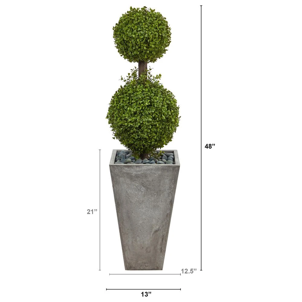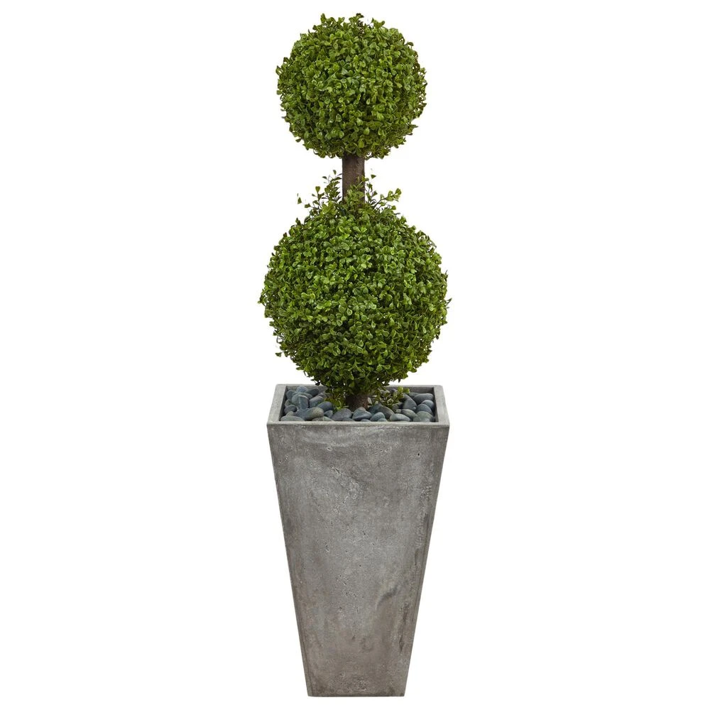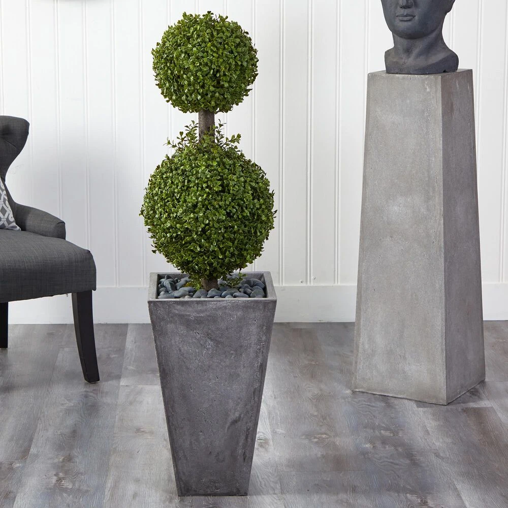 Elegantly greet guests with this double boxwood topiary. One smaller, perfectly trimmed boxwood ball sits above a larger trimmed one made of realistic-looking boxwood foliage. You can now enjoy the sophistication of the boxwood without maintenance or care. Standing 4 from a cement planter nestled with river rocks (included in height), curate in compact spaces. Perfect for an apartment, bathroom, room corner, or foyer.Silk trees are manufactured using synthetic materials, such as polyester material or plastic, and are well designed and constructed to be life-like in appearance. This item will need to be re-shaped when removed from the secure box to allow it to reach its fullest size. Your artificial plant will look beautiful for years to come; simply wipe clean with a soft dry cloth when needed.About Nearly Natural Inc. – For over 75 years, Nearly Natural Inc. has been providing conscientious consumers with beautiful alternatives to natural decorations. Employing and advised by naturalists who understand the live plant world, Nearly Natural is able to recreate the most realistic-looking decorative items for homes, offices, and businesses. Driven by a true commitment to customer service, attention to detail, and natural philosophy, Nearly Natural strives to bring customers the most beautiful, unique, and striking faux plants and floral on the market.