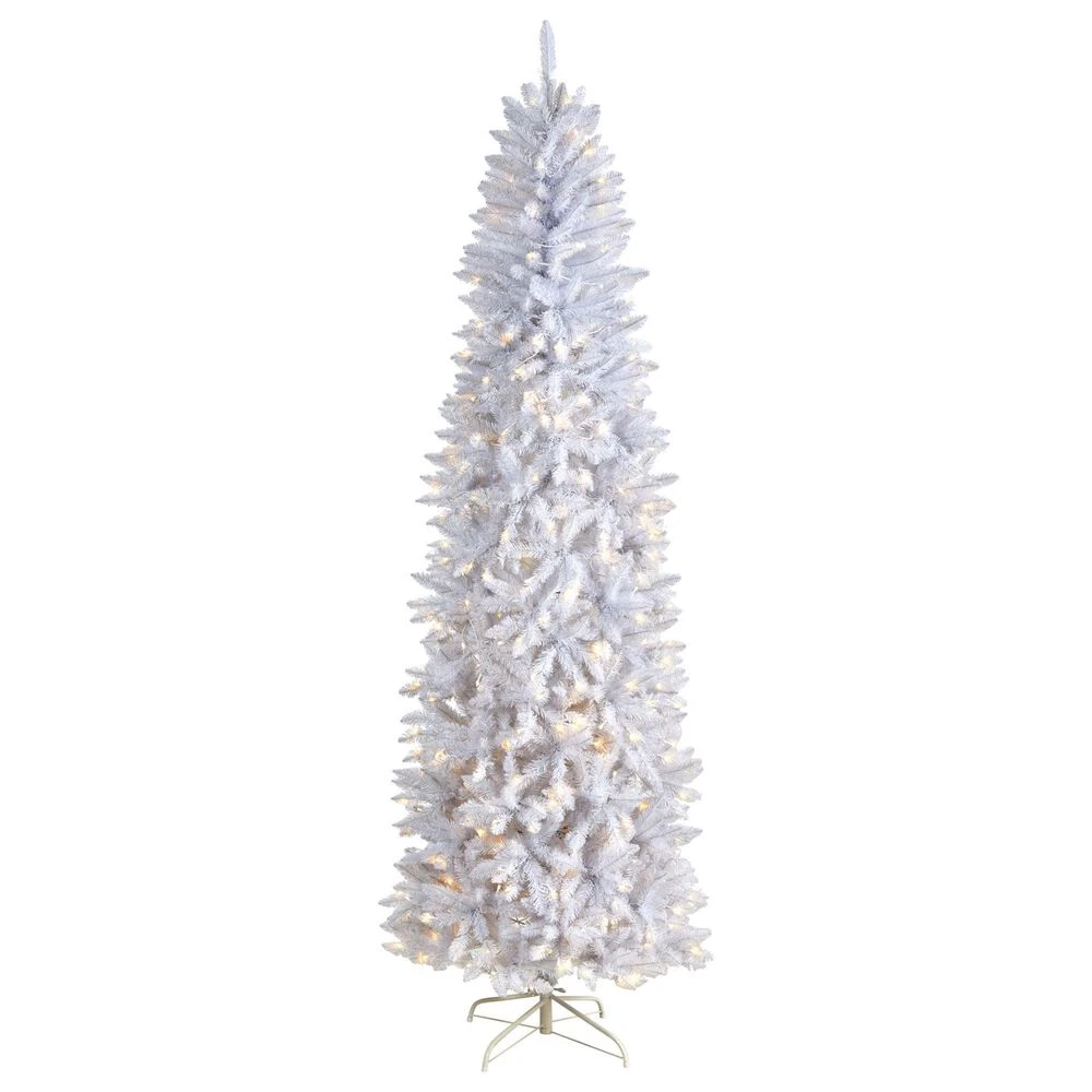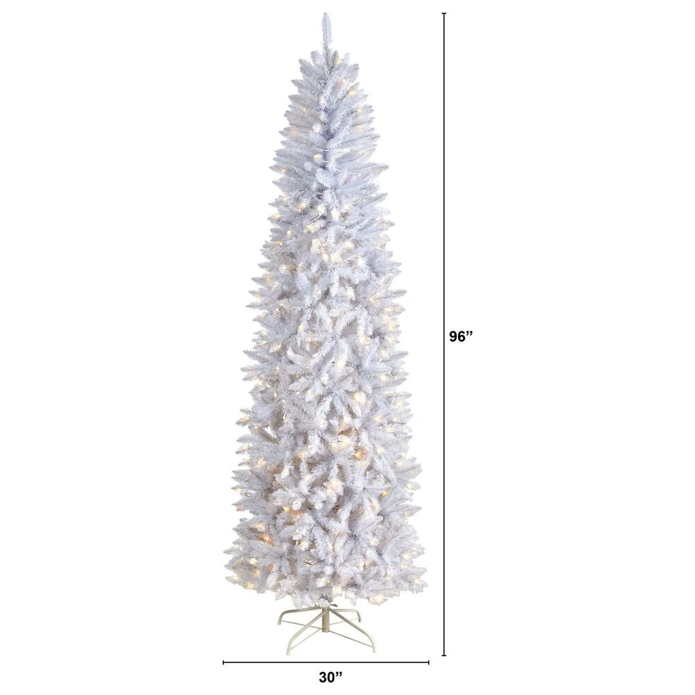 Are you dreaming of a white Christmas? Fulfill all your dreams with this white artificial Christmas tree. Inspired by nature, this tree has a slim silhouette that mimics its real counterparts’ natural foliage and texture. With 1348 bendable branches, you can easily display all your favorite ornaments. Save time and money with the pre-strung 400 lights. Standing 8ft. from a metal stand, curate in any area. Perfect for a family room, living room, or home office. Faux Christmas Trees are manufactured using synthetic materials, such as polyester material or plastic, and are well designed and constructed to be life-like in appearance. This item will need to be re-shaped when removed from the secure box to allow it to reach its fullest size. Your artificial Christmas Tree will look beautiful for years to come; simply wipe clean with a soft dry cloth when needed.