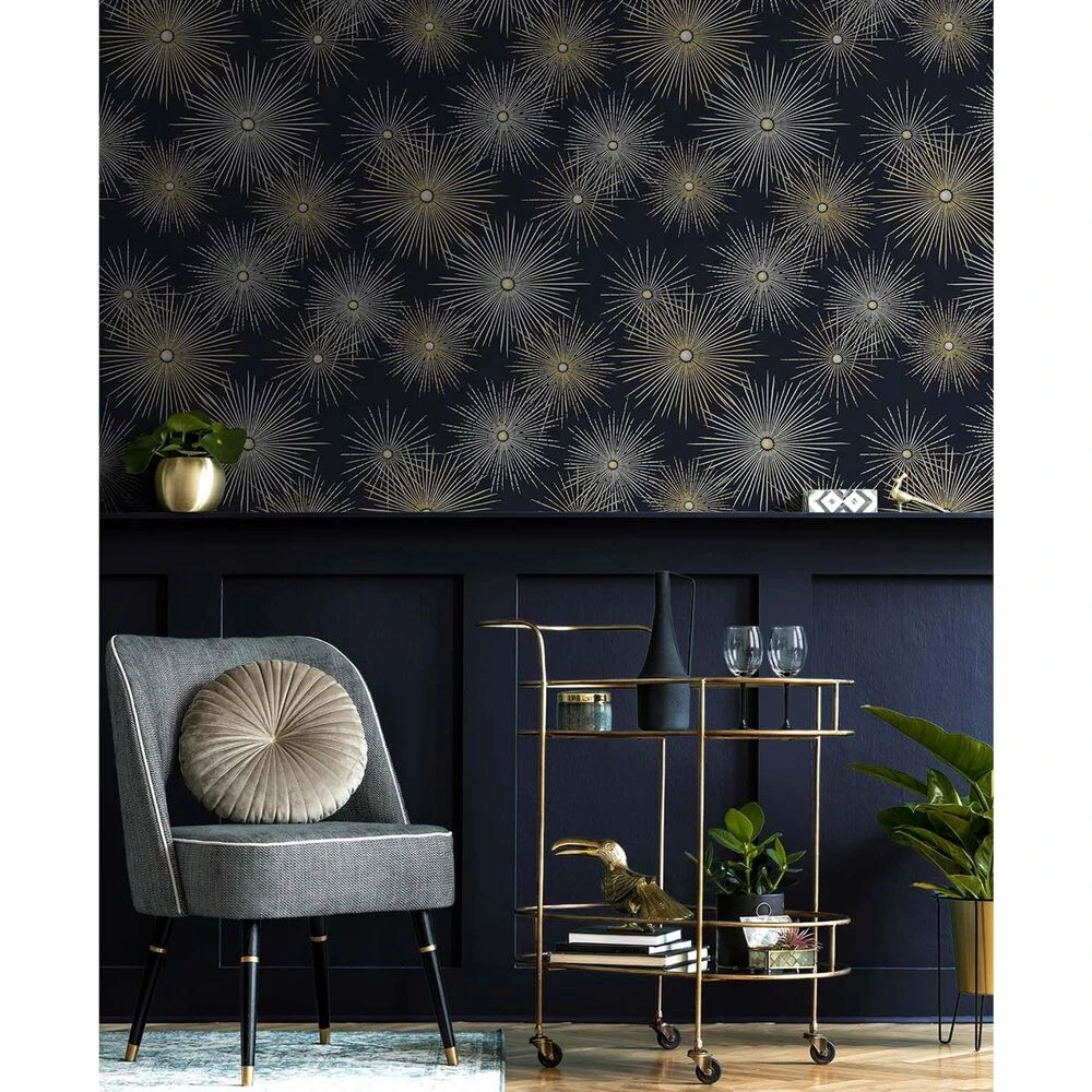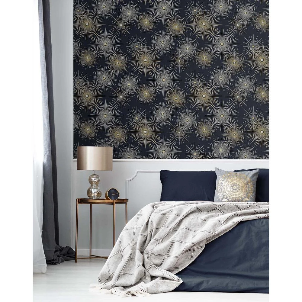 Drawing inspiration from Mid-Century Modern design, this Starburst Geo peel and stick wallpaper from NextWall brings a playful sophistication and shimmering finish to any interior wall or furniture surface! Printed on smooth vinyl, our self-adhesive designs are perfect for renters and homeowners looking for an instant, DIY transformation to their interior space. With the same qualities and durability as permanent wallpaper, our products offer an easy, fresh alternative to decorating with very little commitment. No water, no mess, no sticky residue!