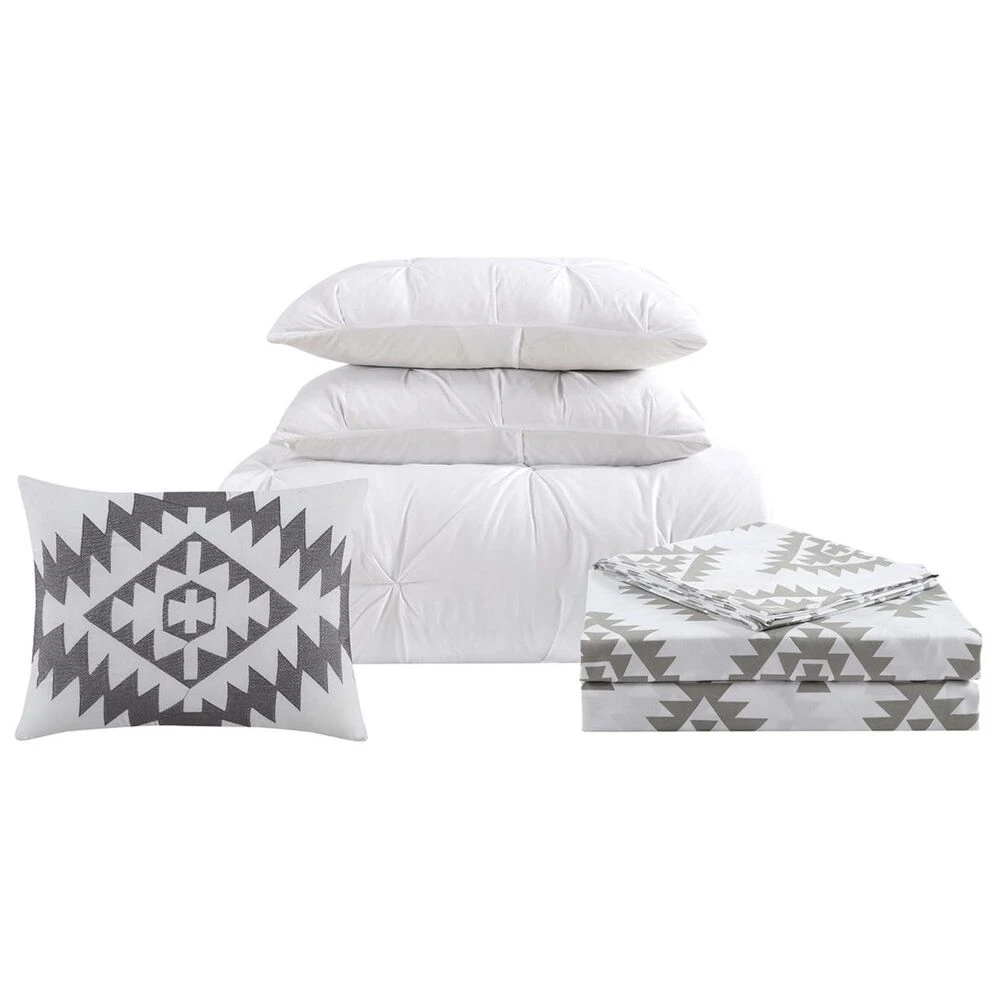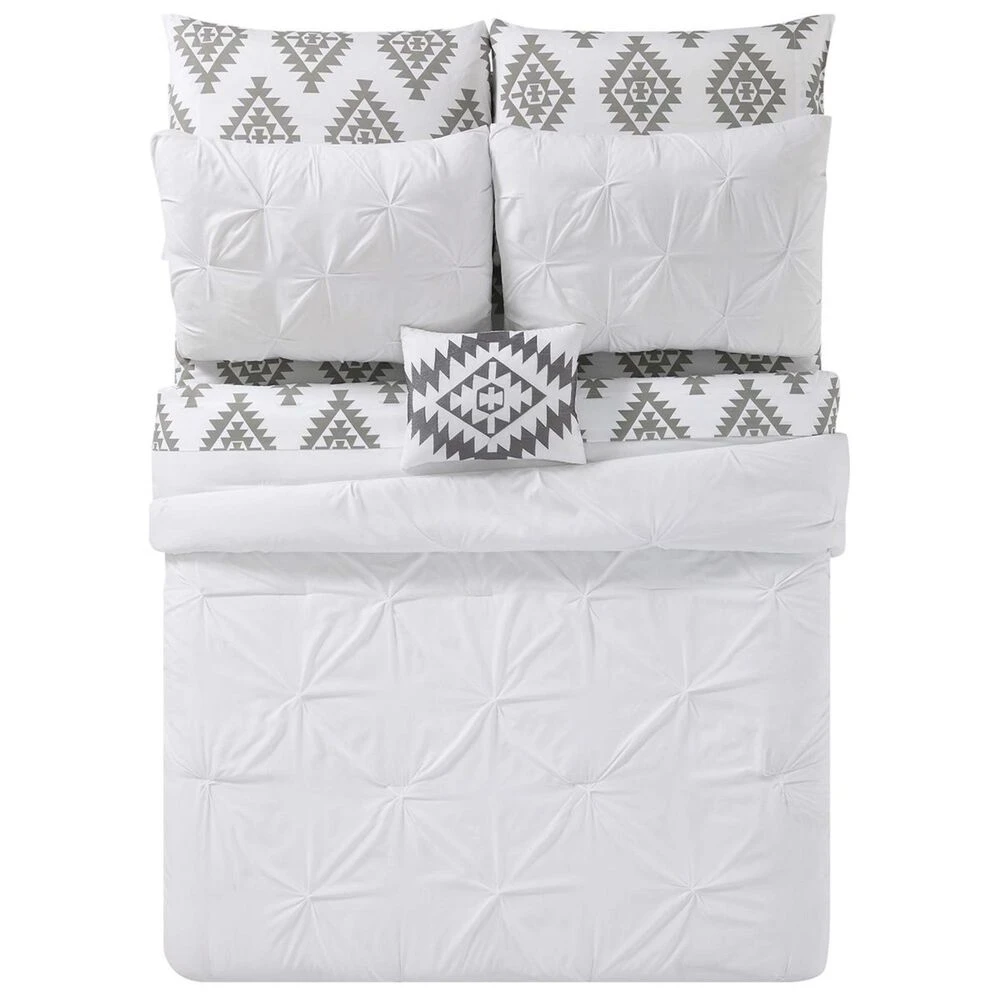 Pleated face on the comforter and shams with a solid color reverse. The set is complete with a microfiber sheet set and decorative pillow with a trend right southwestern pattern.