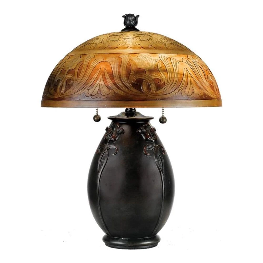This organic look features an etched glass shade in a classic art nouveau design, which is echoed in the sculpting on the base.