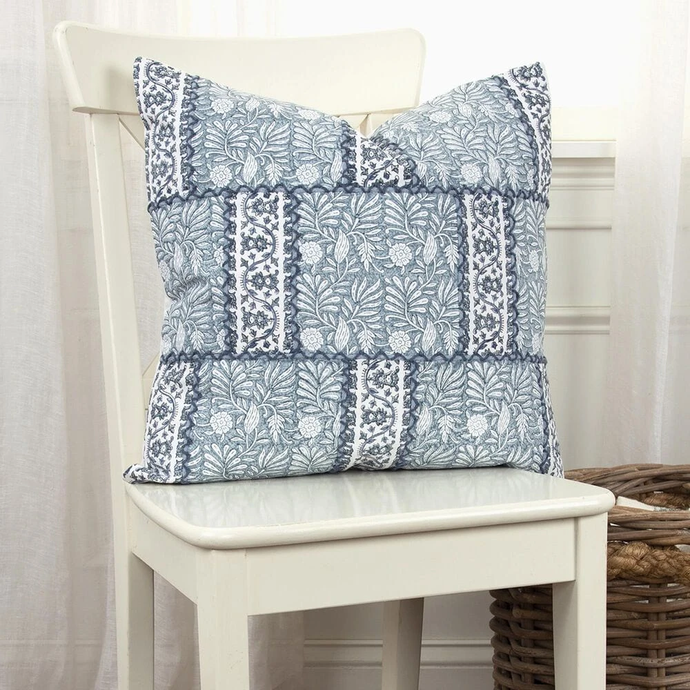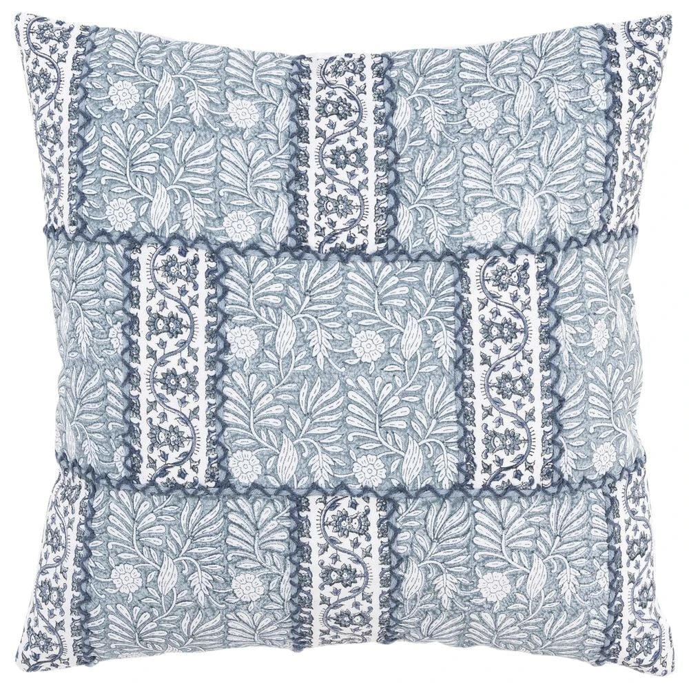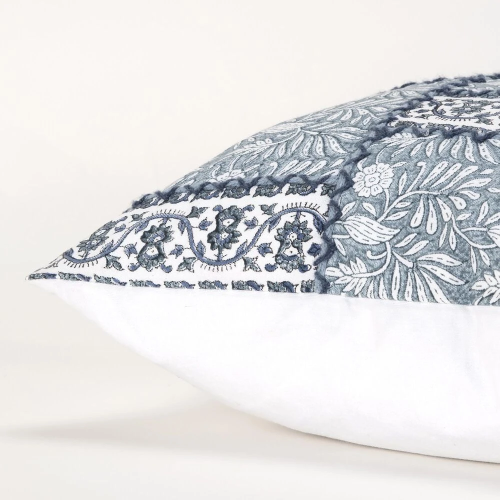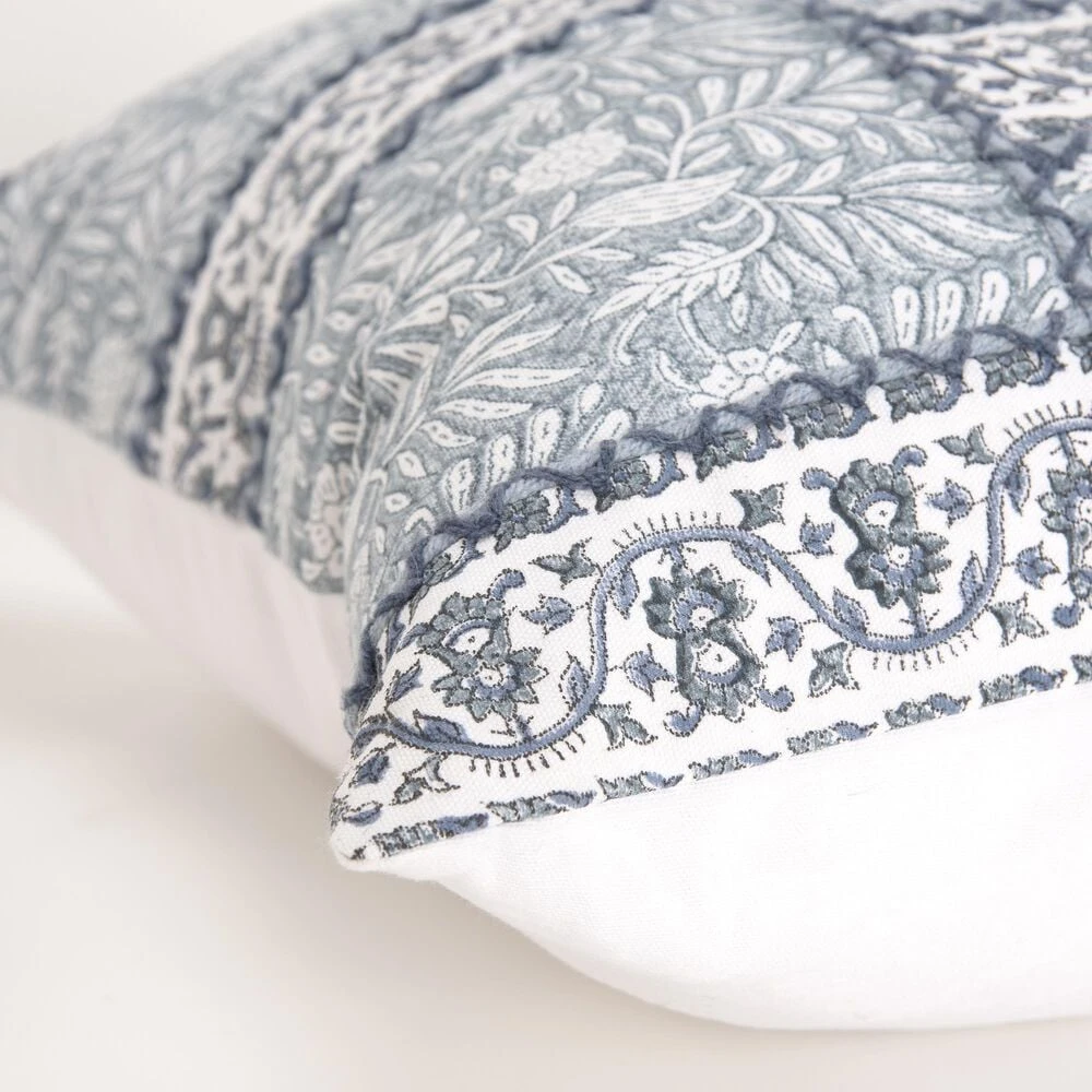This primitive block print pattern pillow is a collage of three block print patterns. Machine applied chord accents embellish parts of the pattern. Hand applied embroidery over that cord creates a lovely lace-like connection between the block print patterns. Knife edged, this pillow features a coordinating solid cotton back with a hidden zipper closure for ease of fill.