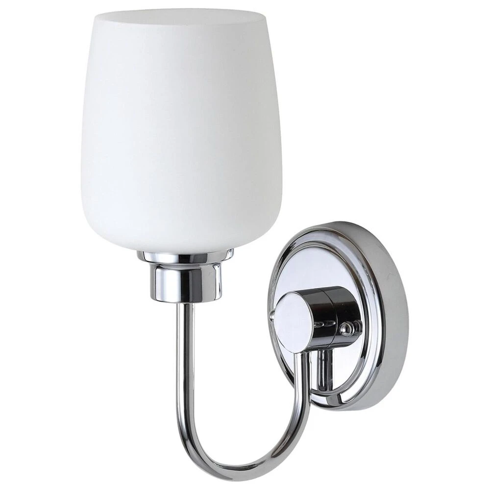 Brighten up any bathroom or powder room with this polished bathroom sconce. Its stunning chrome finish and sturdy metal construction make it a design investment, while its elegant white glass shade diffuses light upward for a radiant luminous glow.